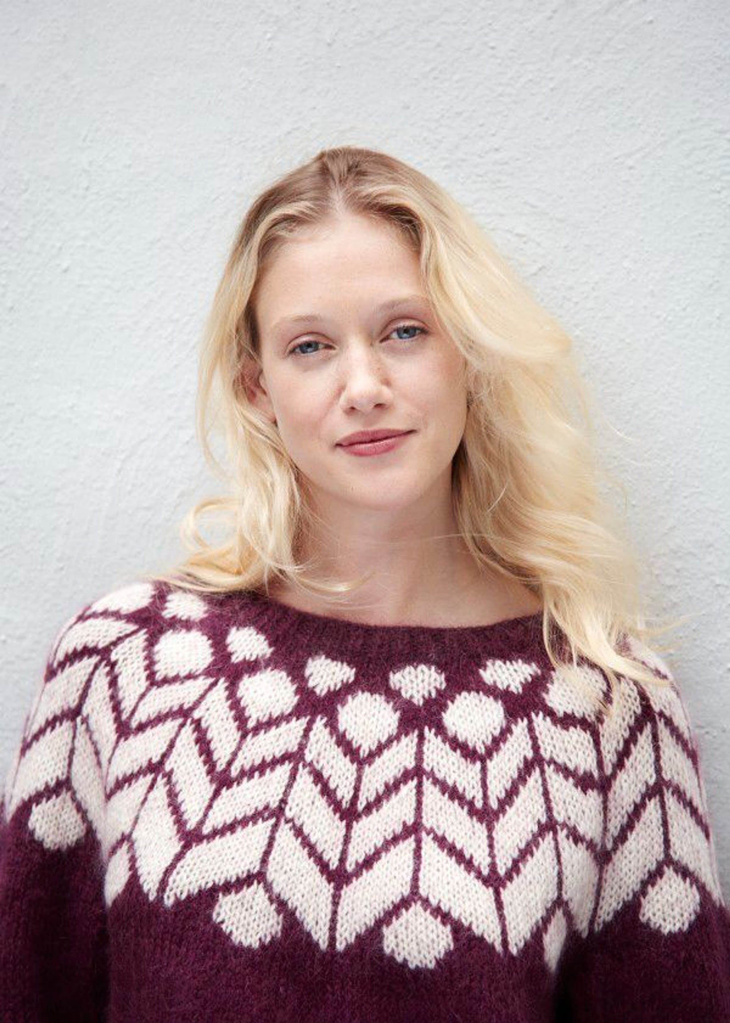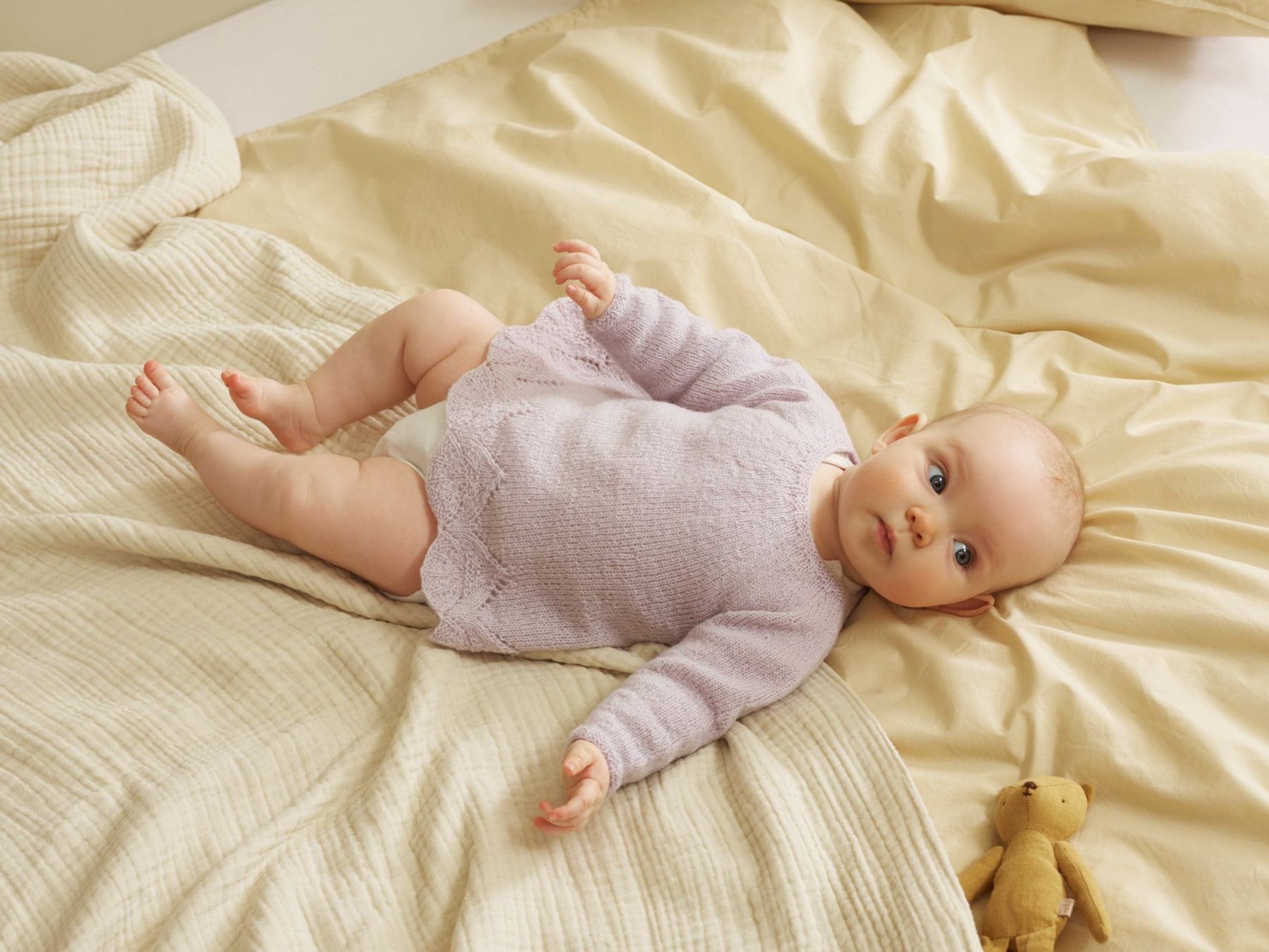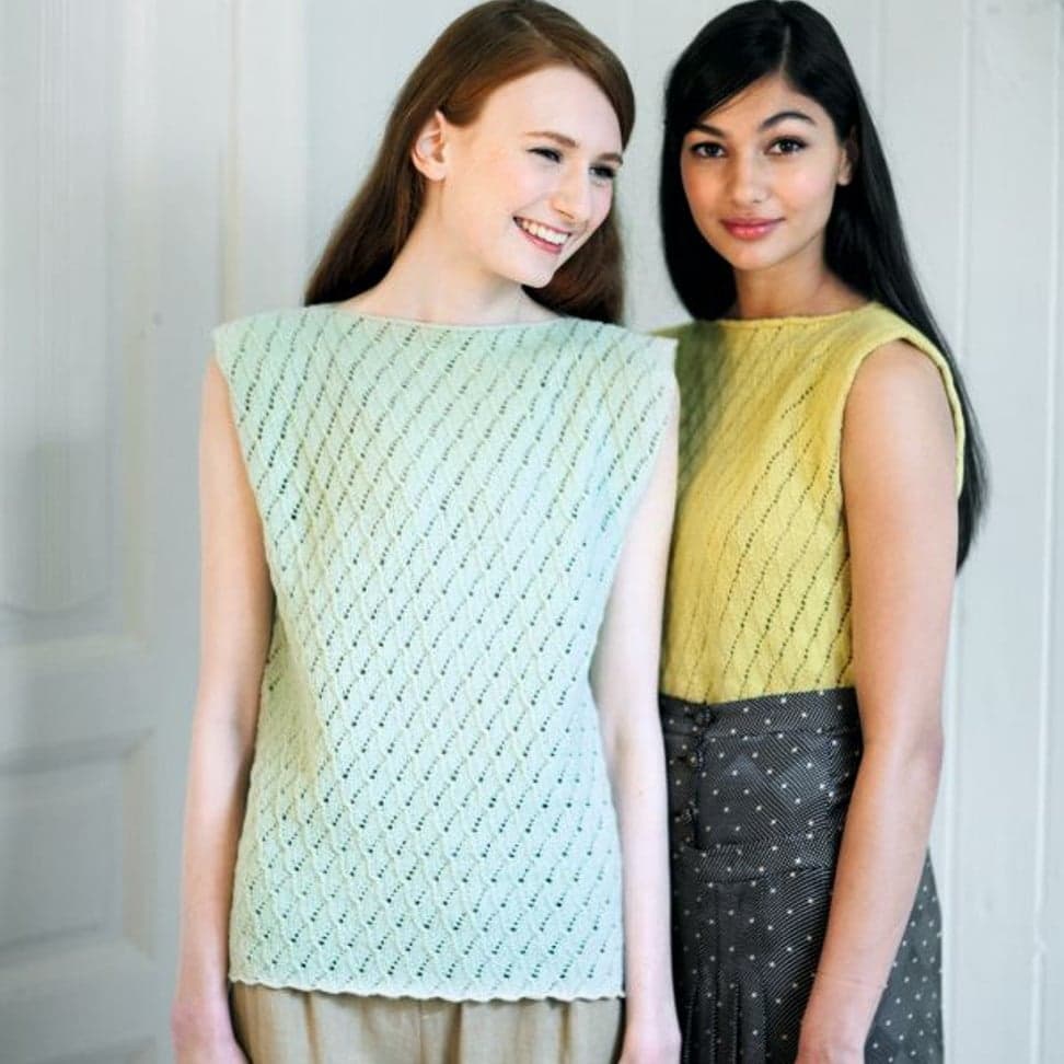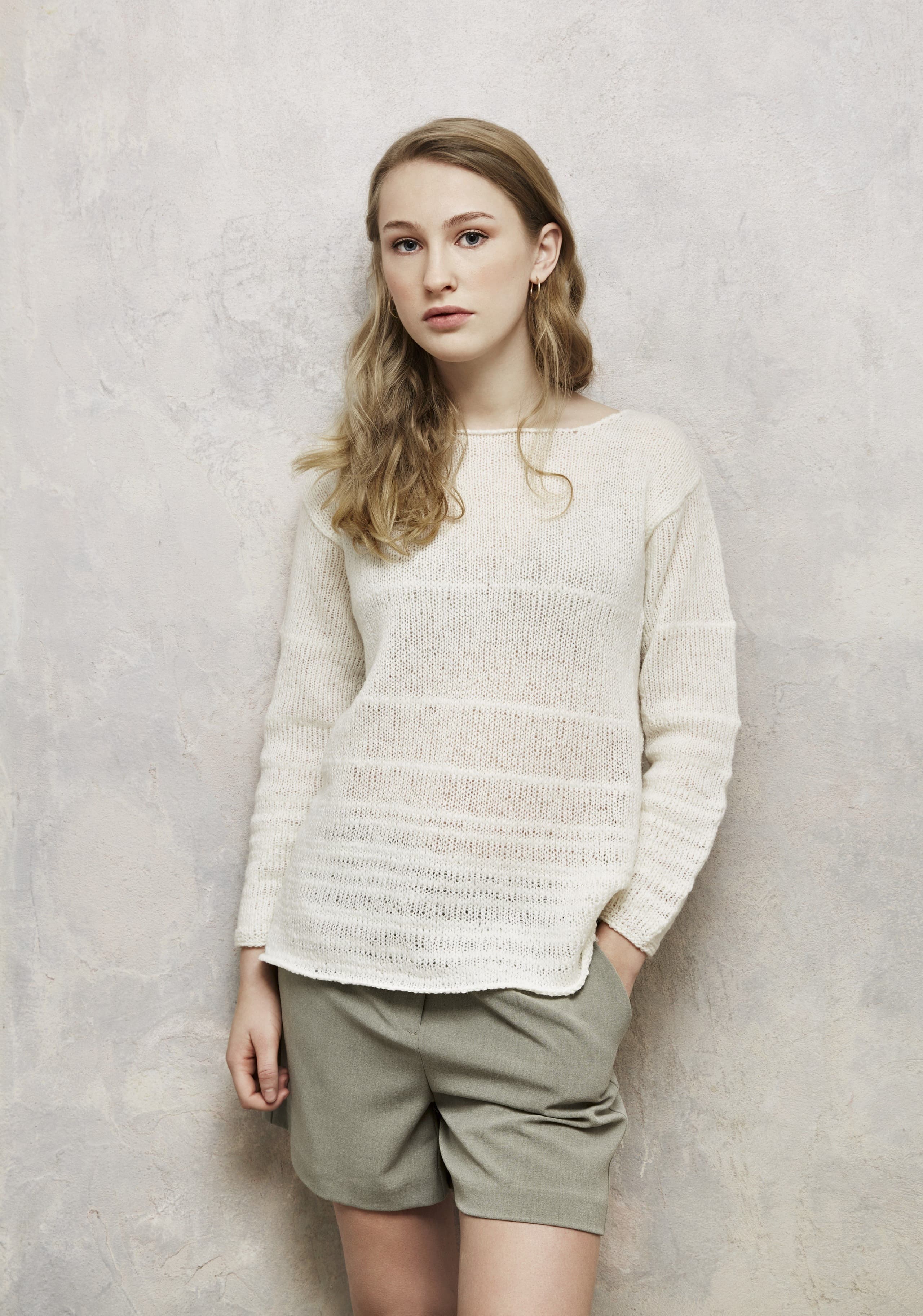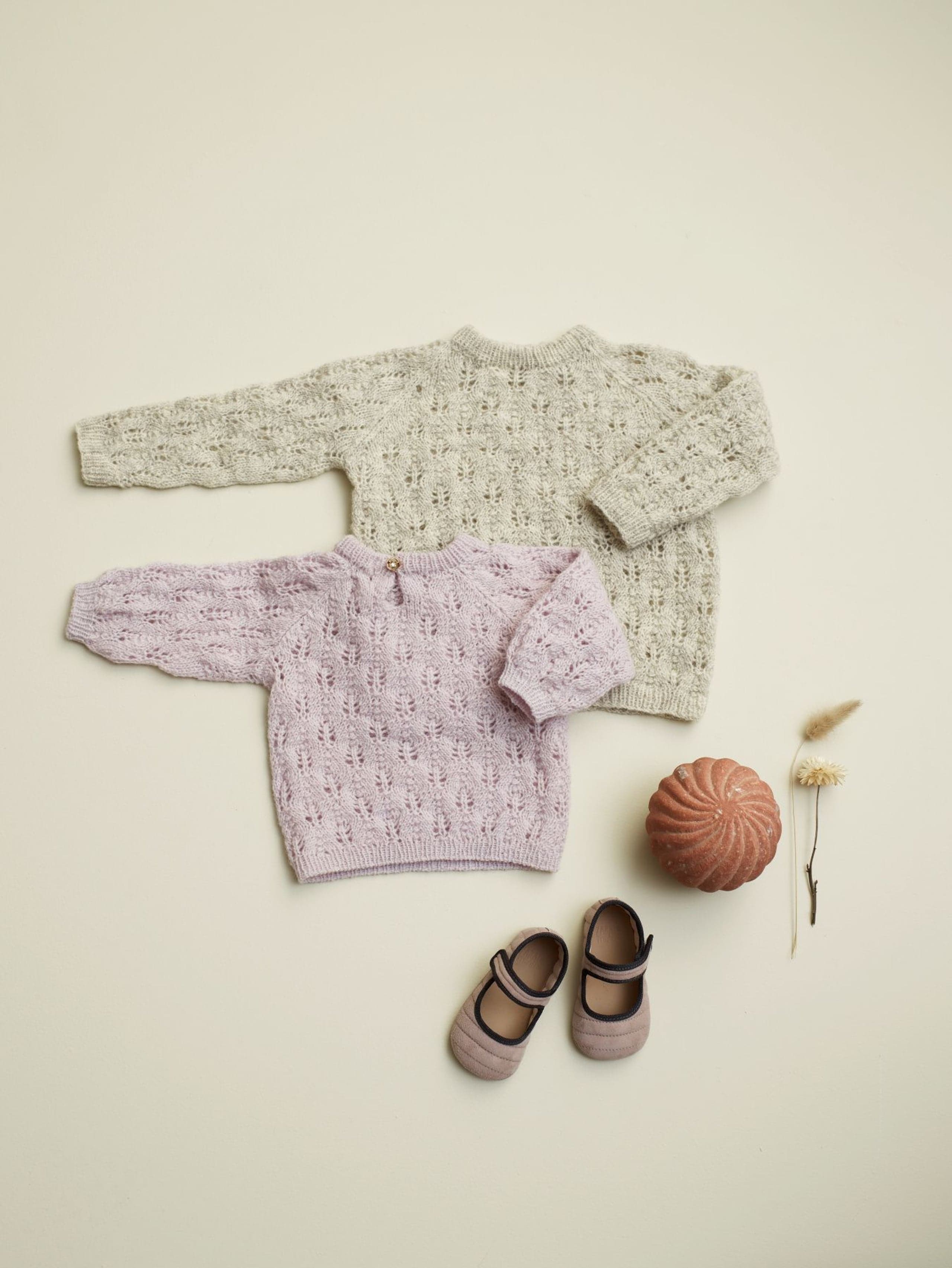 Garnkombinasjoner og forslag til strikkefasthet (p): Husk å strikke prøvelapp. Lamull + Plum: 20 m = 10 cm (3,5) Lamull + Alpaca Silk: 20 m = 10 cm (3) Lamull + Plum x 2: 18 m på 10 cm (4) Lamull x 2 : 18 m = 10 cm (3,5) Lamull + Tumi: 17 m = 10 cm (5) Lamull x 2 + Plum: 16 m = 10 cm (4,5) Lamull + Alpakka Lin: 14 m = 10 cm (4,5) Garnalternativer: Babygarn Inca Pandora