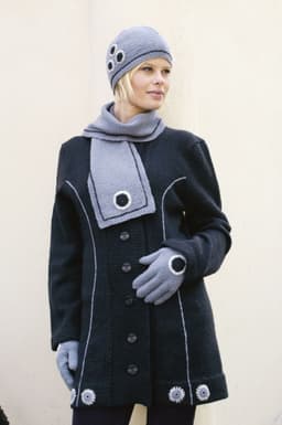 Jakke med rysjer, skjerf, lue med og uten rysjekant