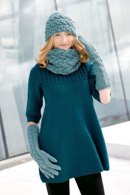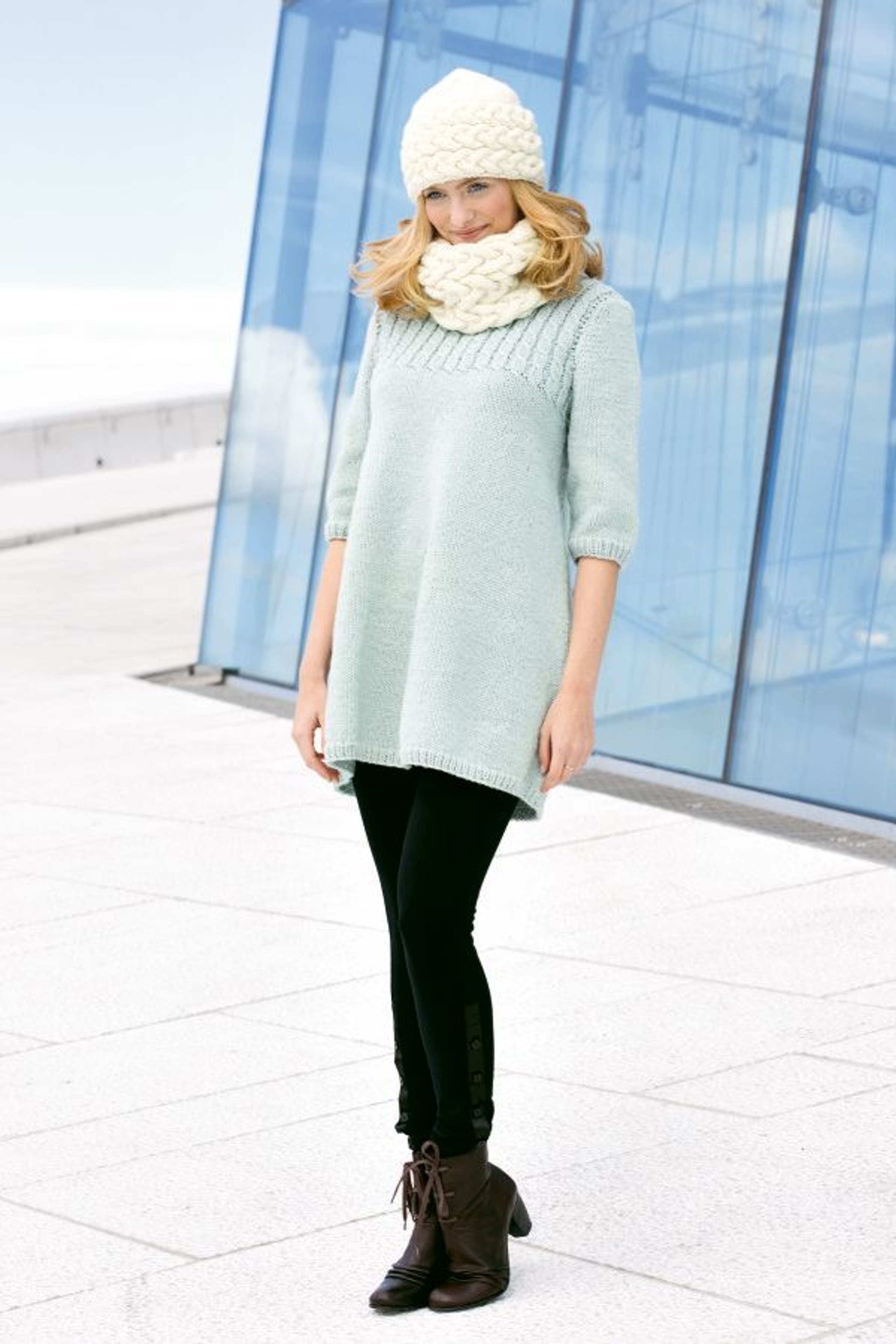 Kort genser med hette. Lang genser med firkantet halsåpning. Skjerf