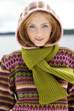 Kort genser med hette. Lang genser med firkantet halsåpning. Skjerf