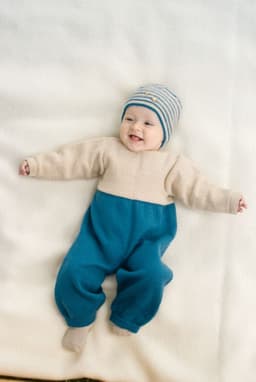 Heklet og strikket babysett. Genser, bukse og lue