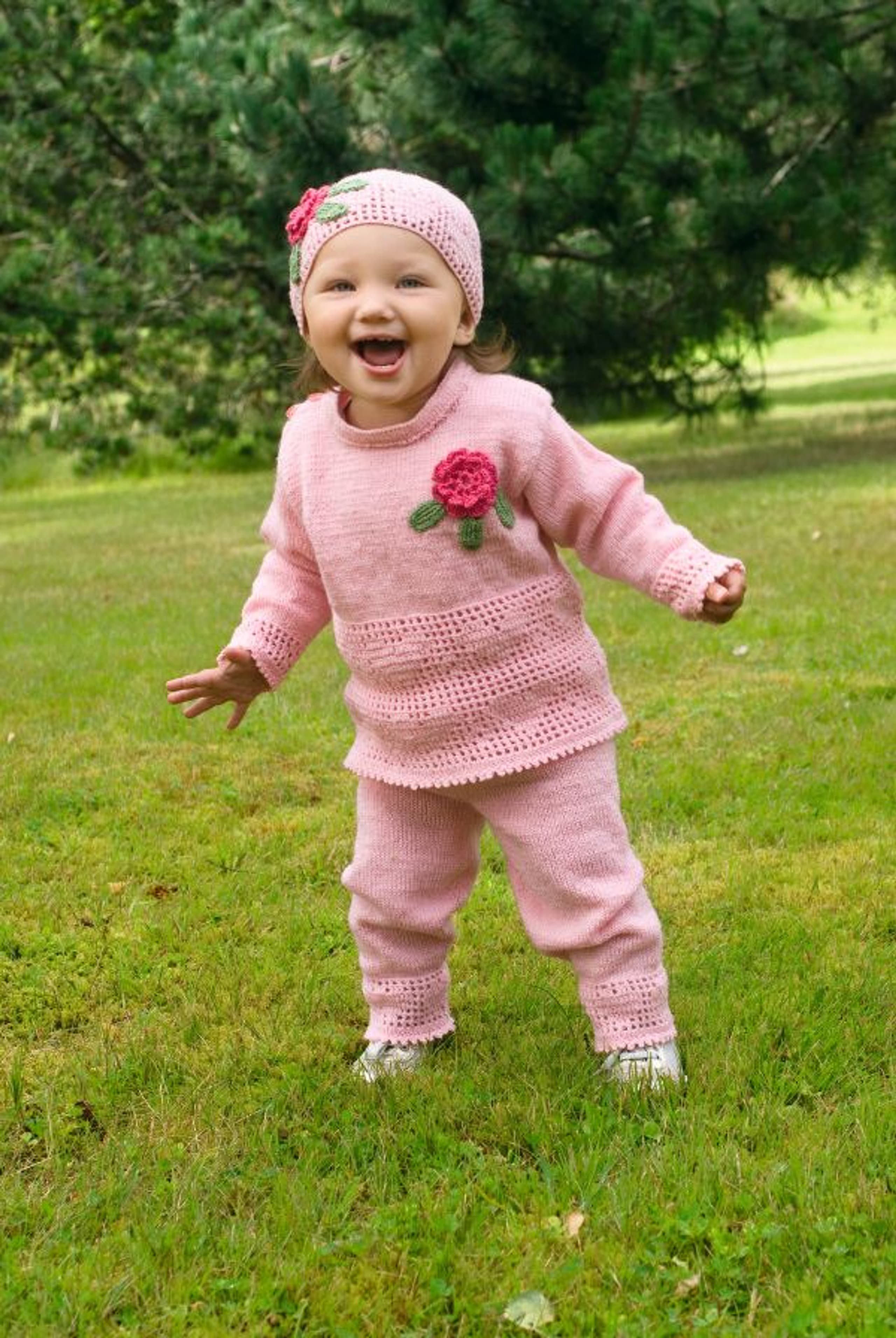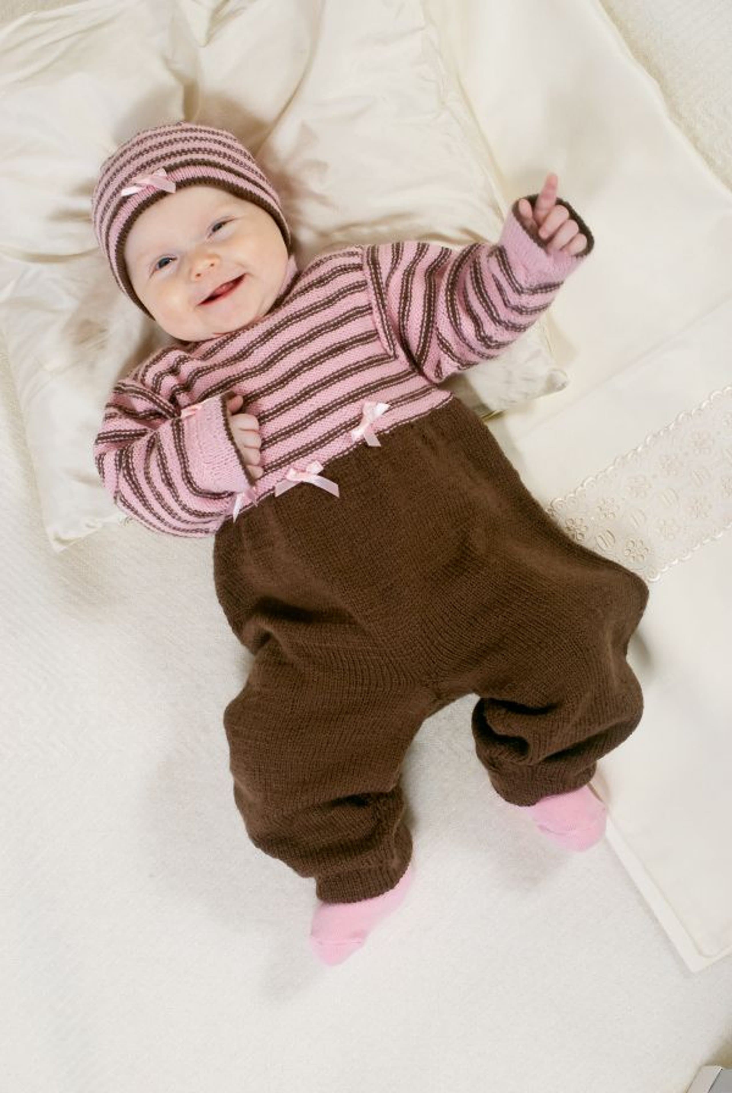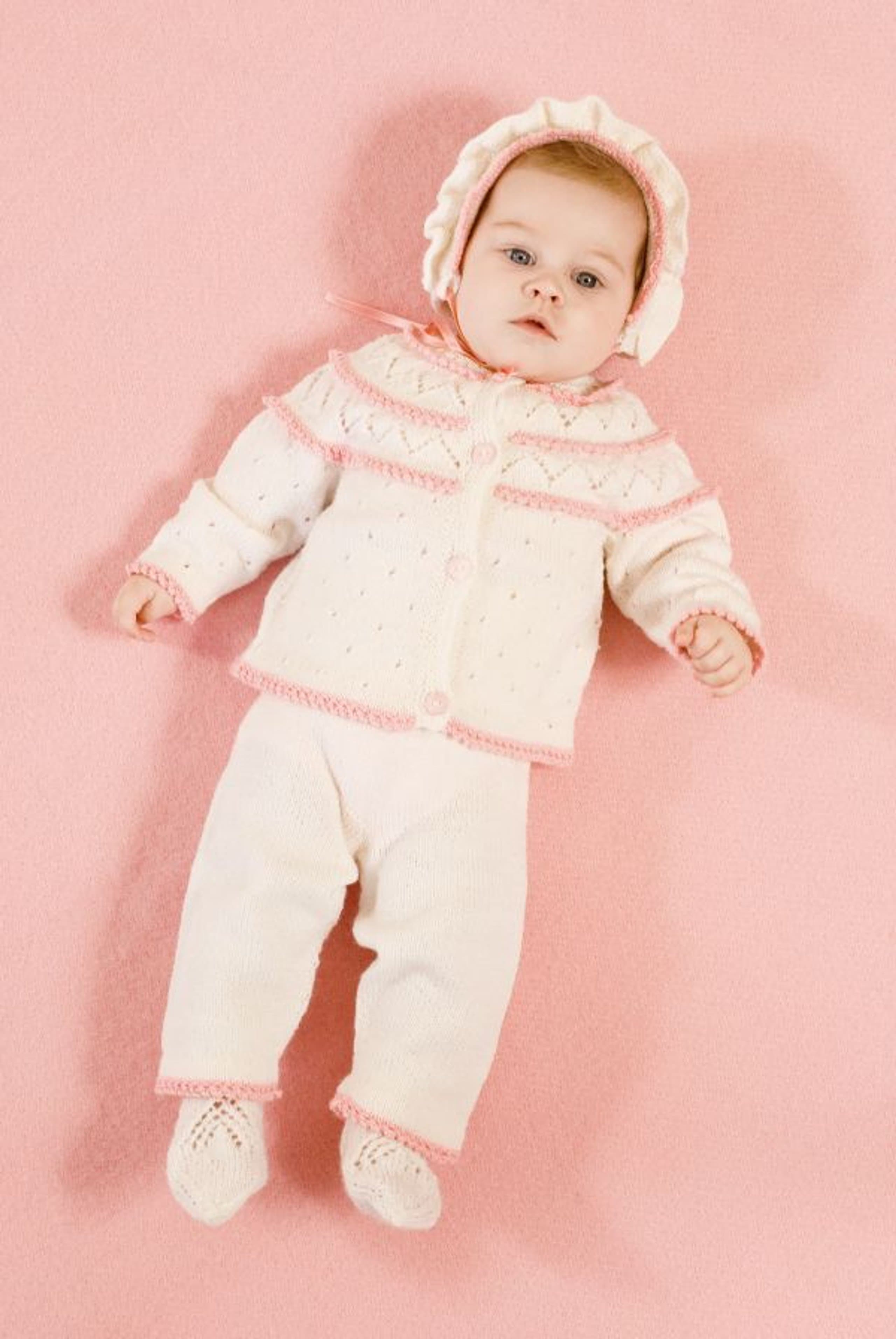 Heklet og strikket babysett. Genser, bukse og lue