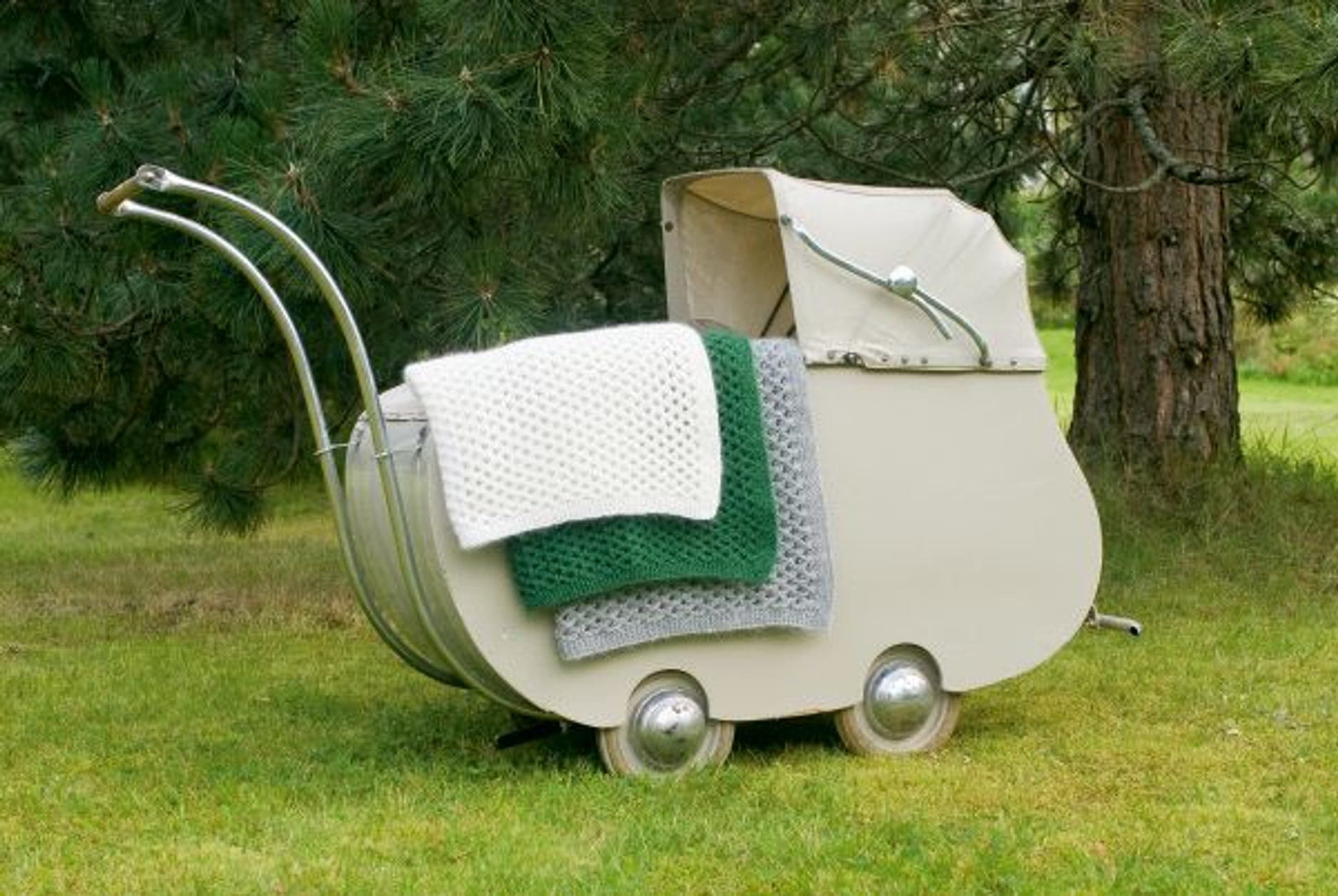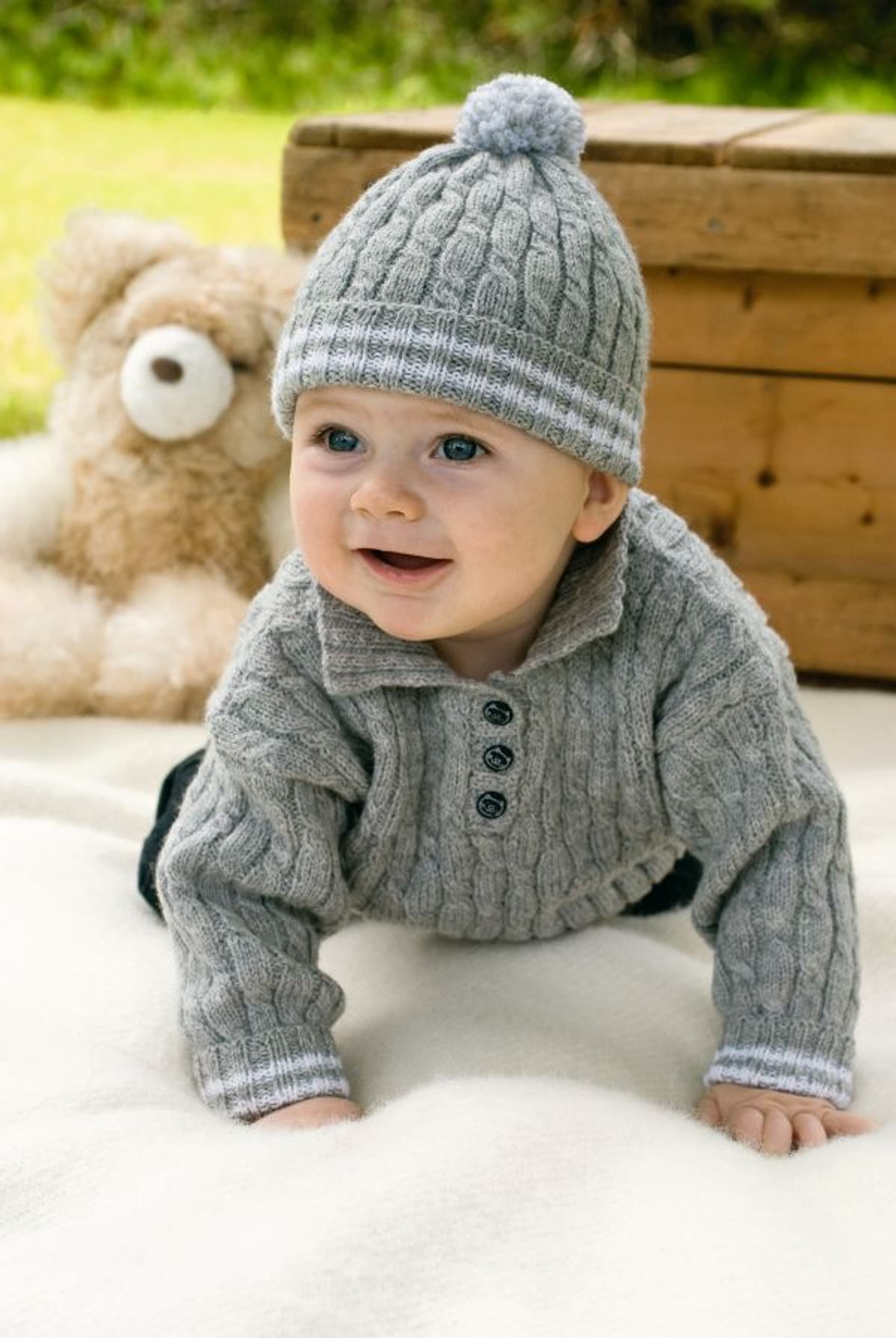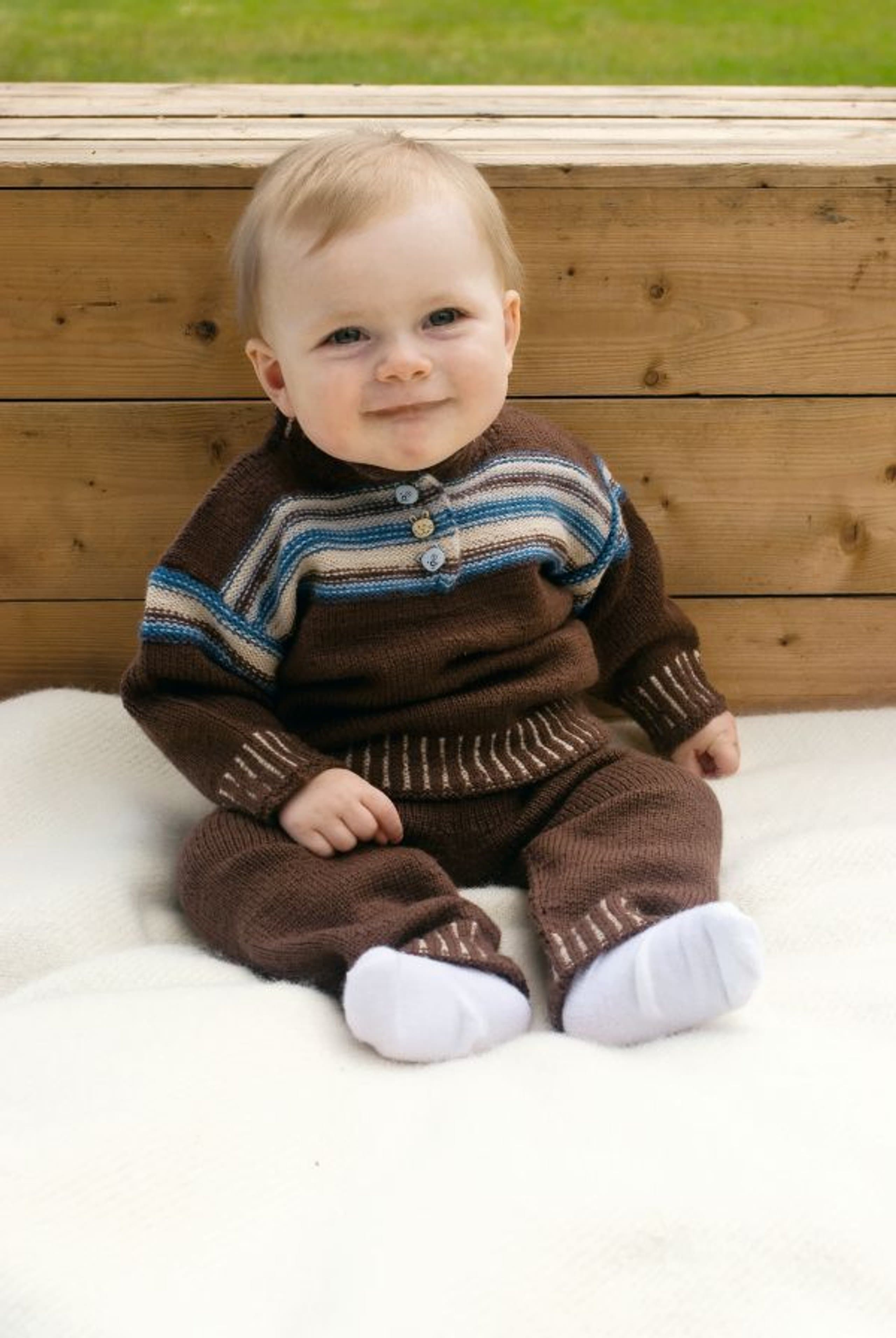 Heklet og strikket babysett. Genser, bukse og lue