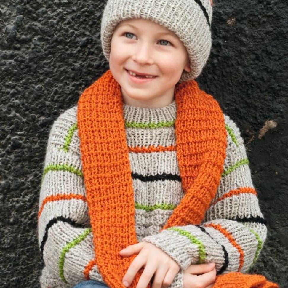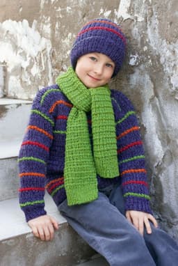 Genser i dobbelt garn, lue og skjerf