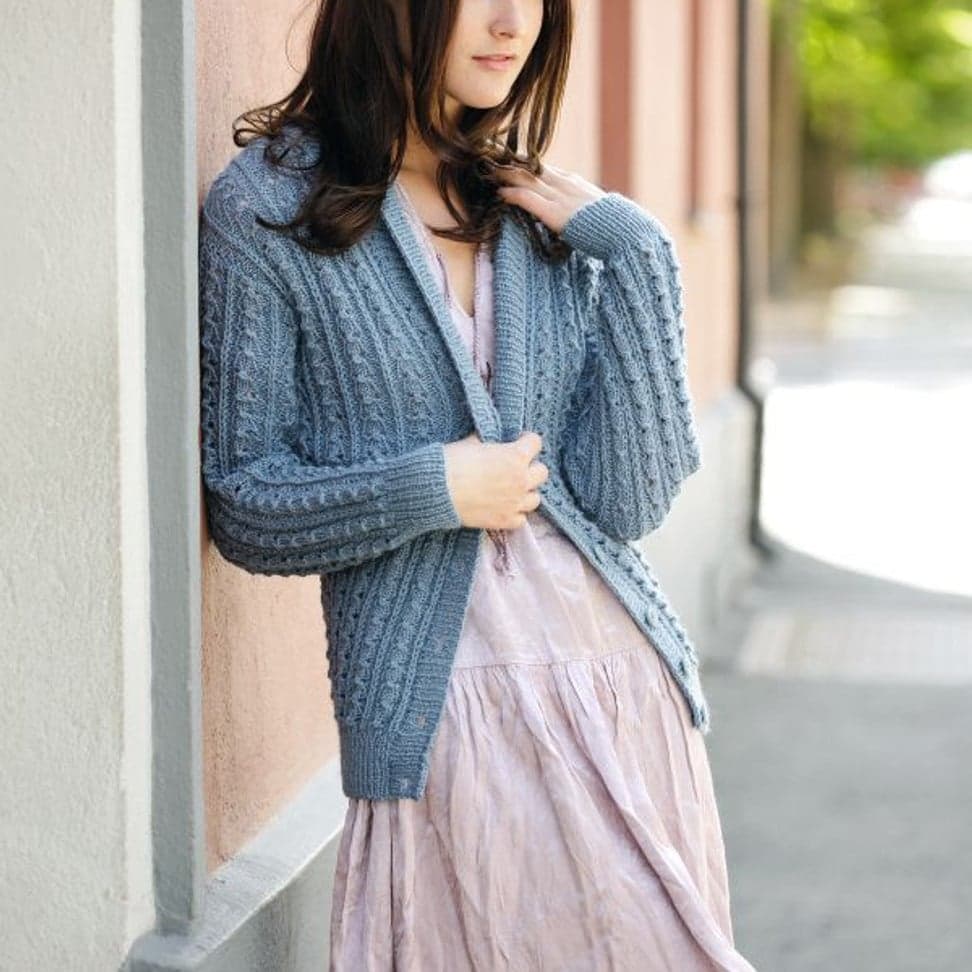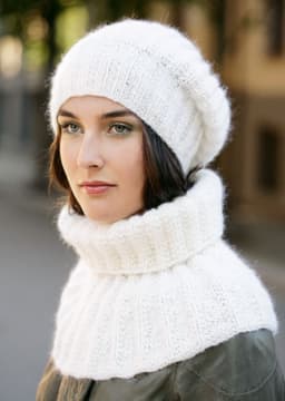 Jakke, gensere og topp med fletter og striper, lue og votter