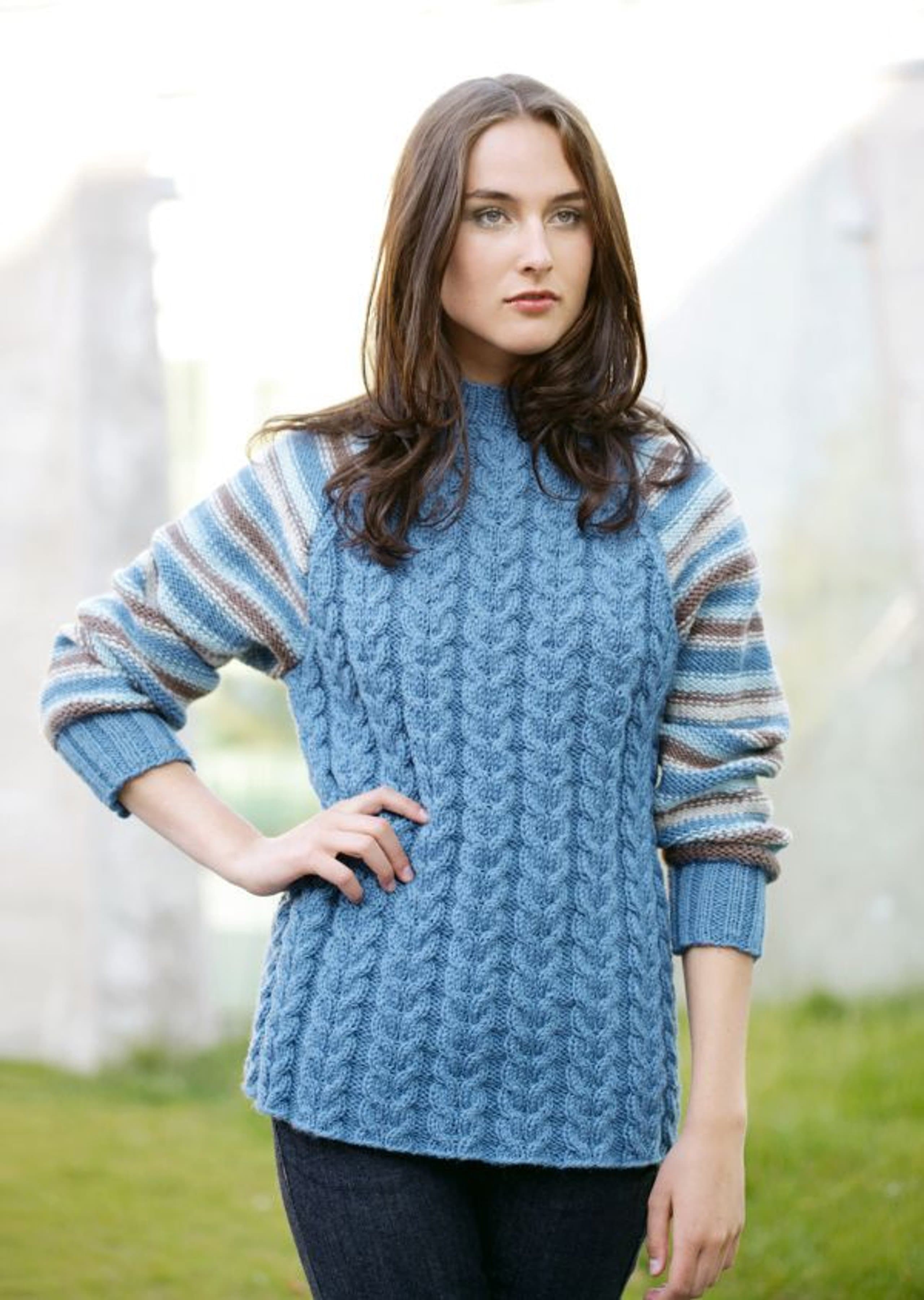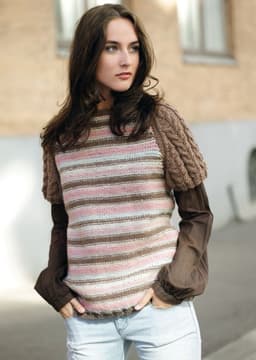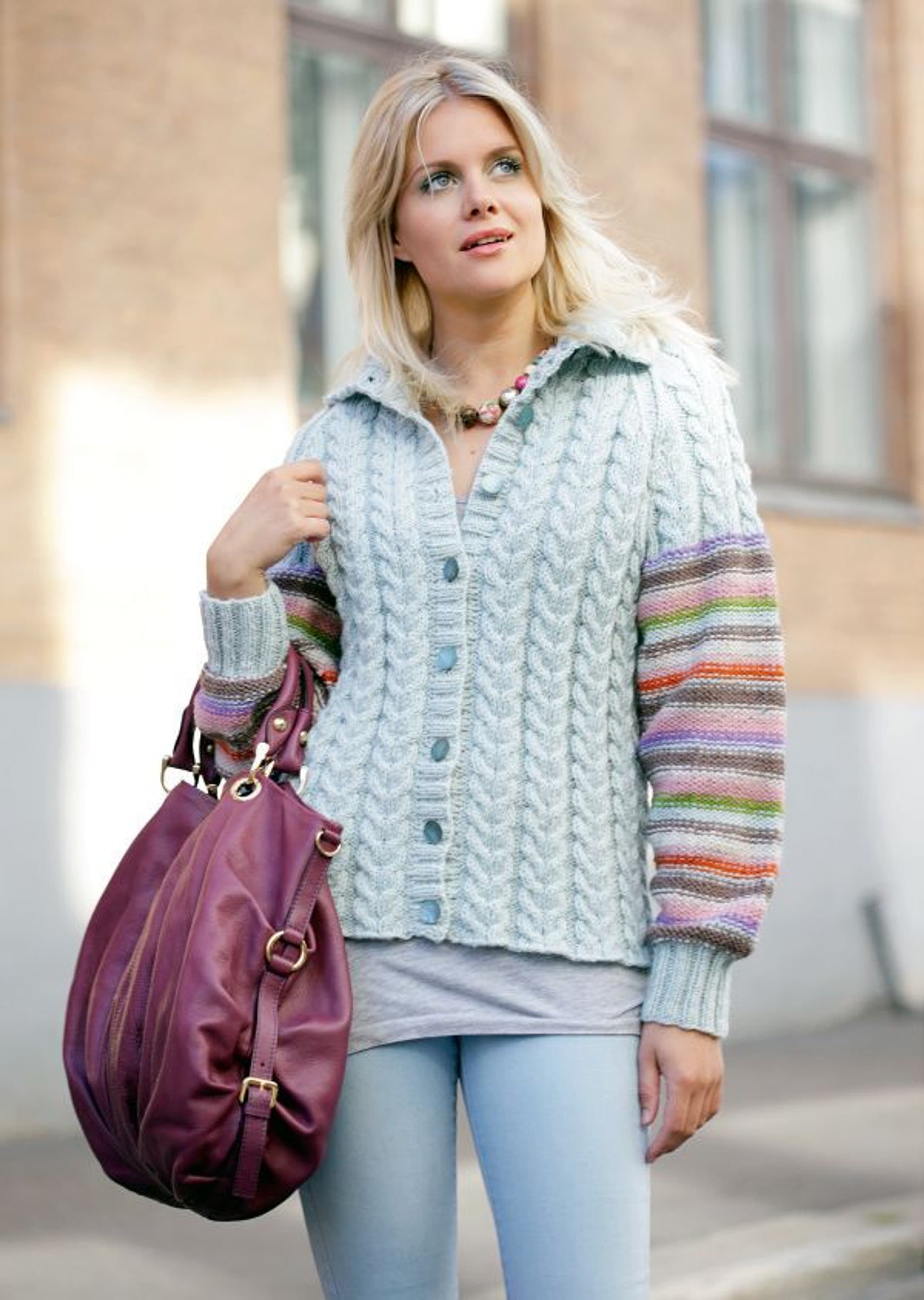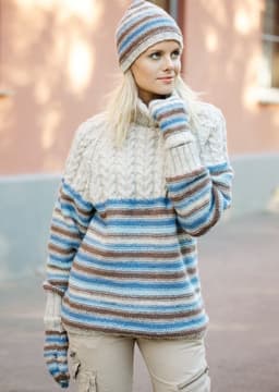 Jakke, gensere og topp med fletter og striper, lue og votter