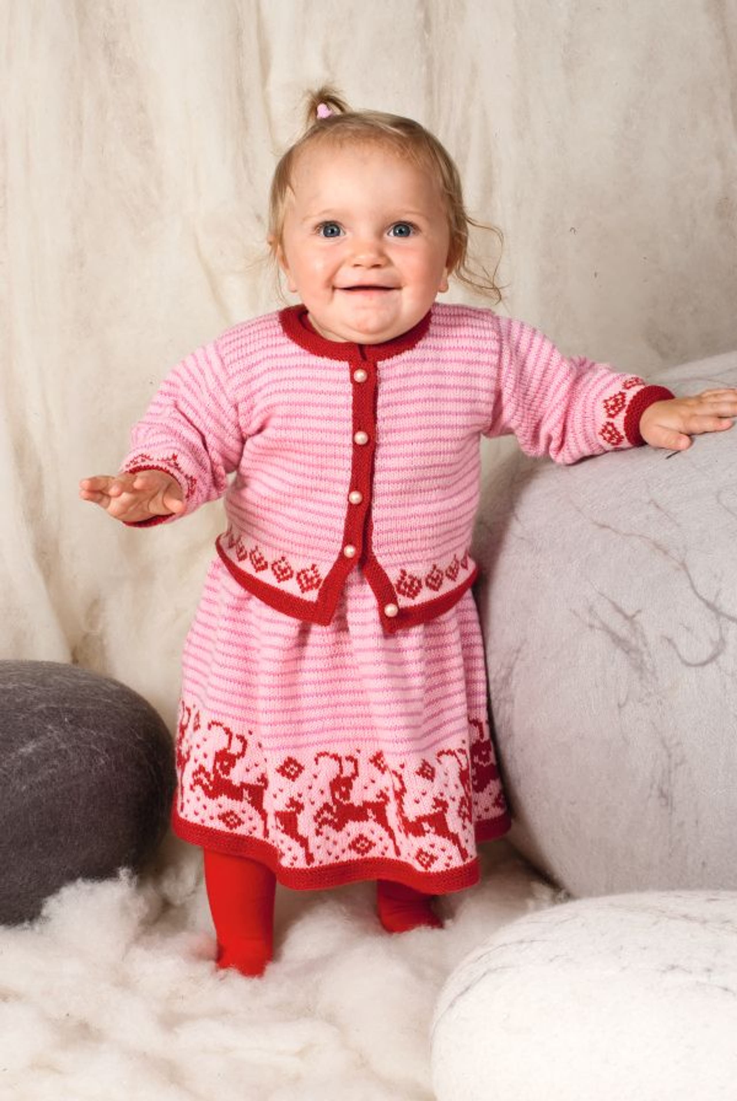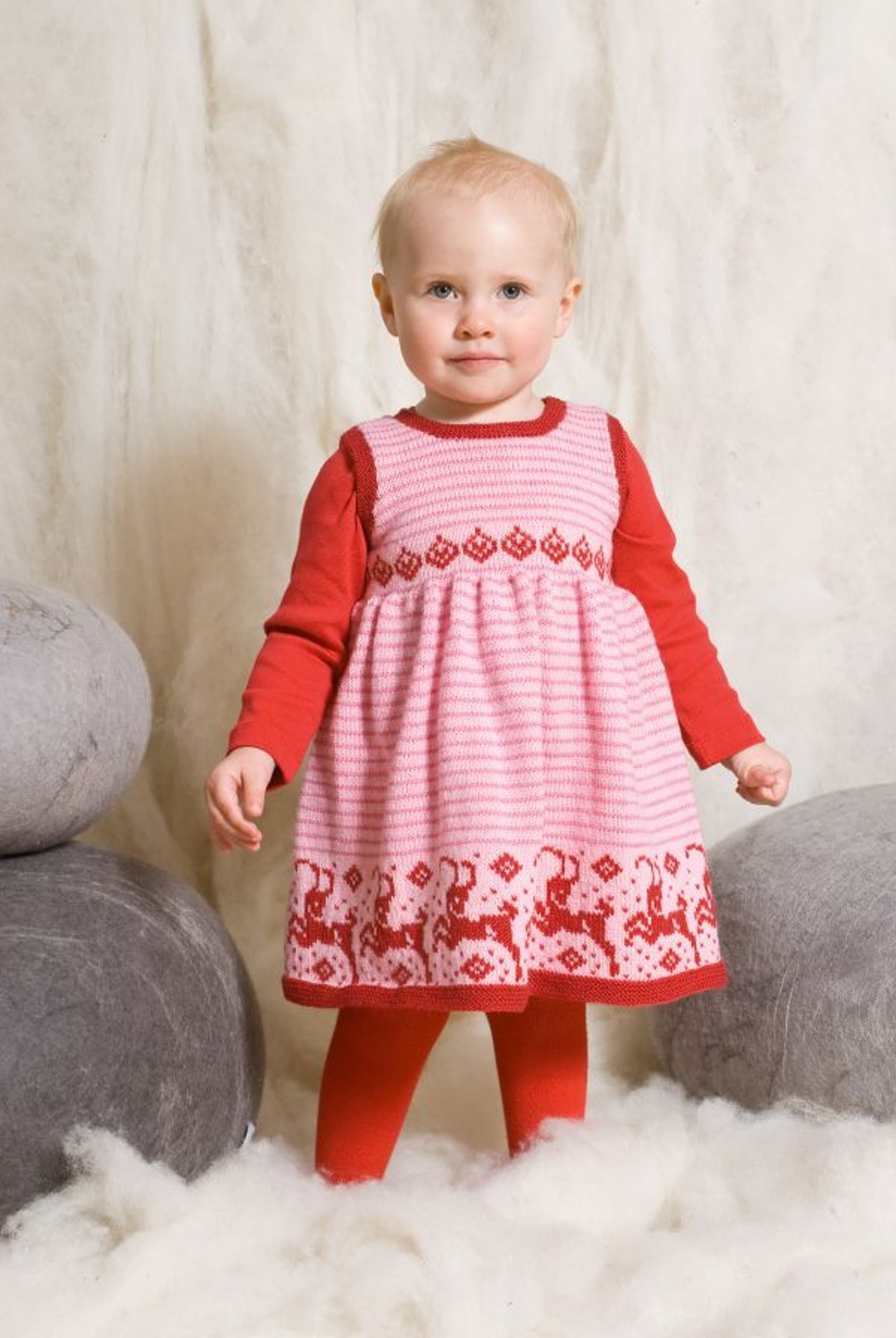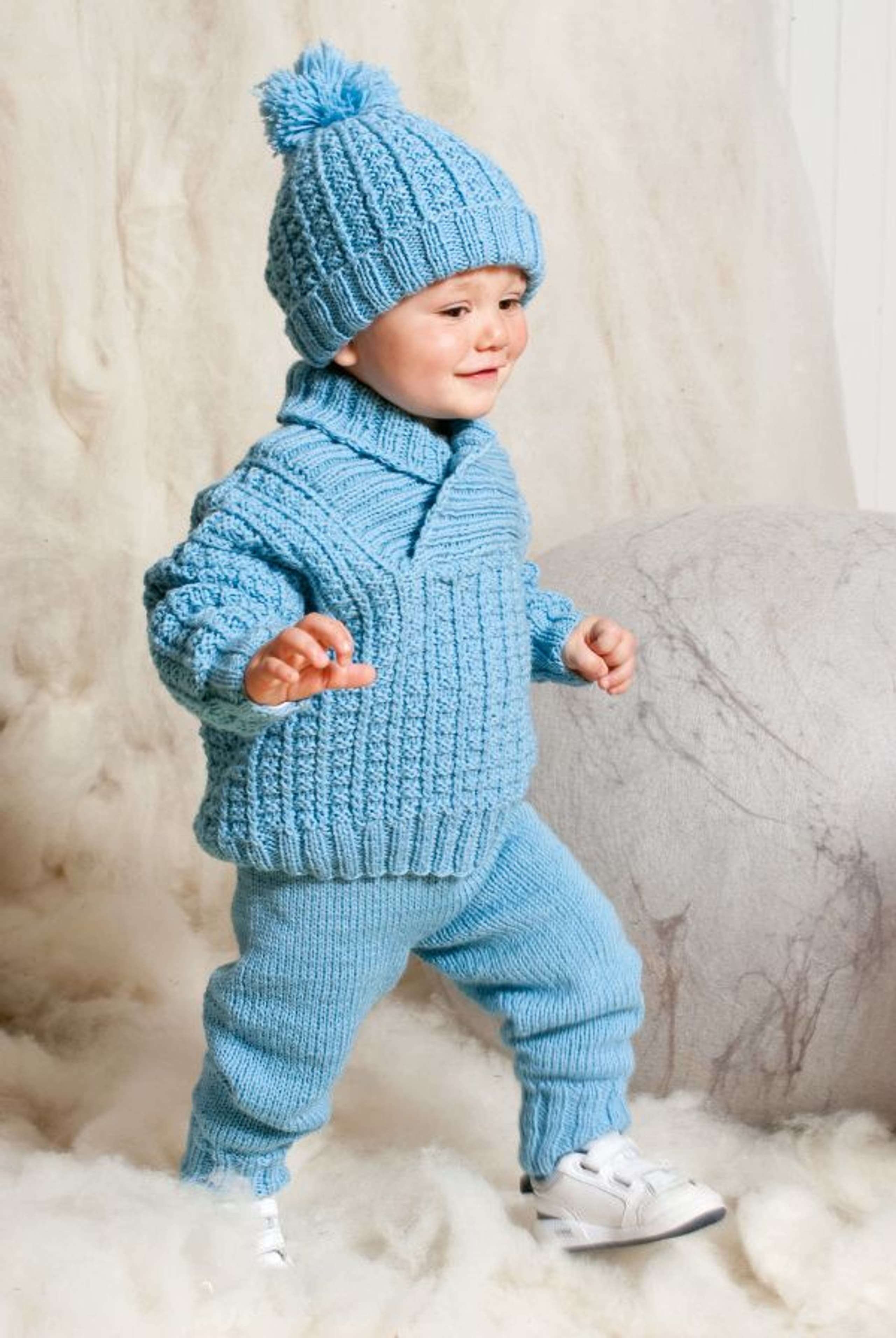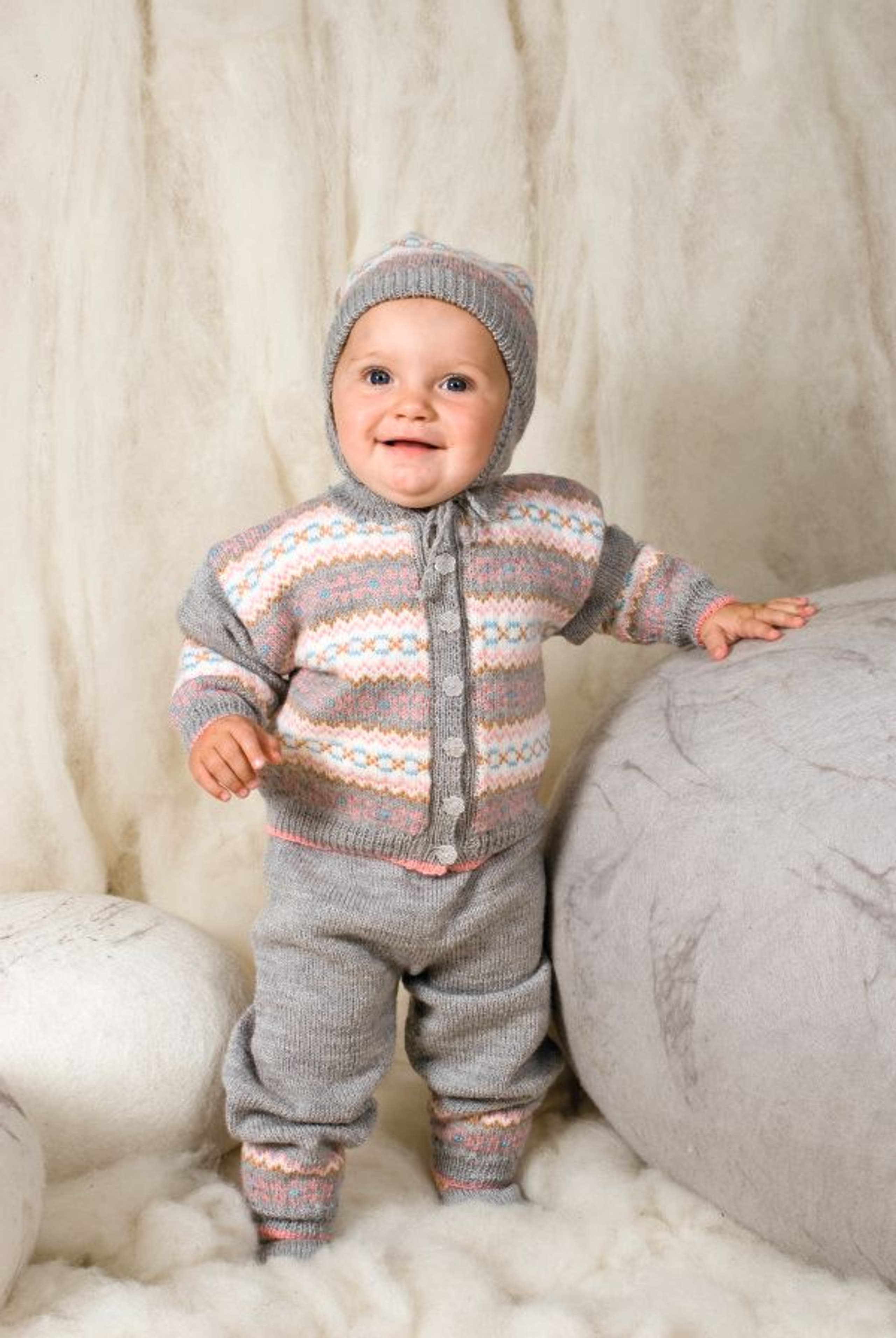 Genser og lue, jakke, bukse og kjole
