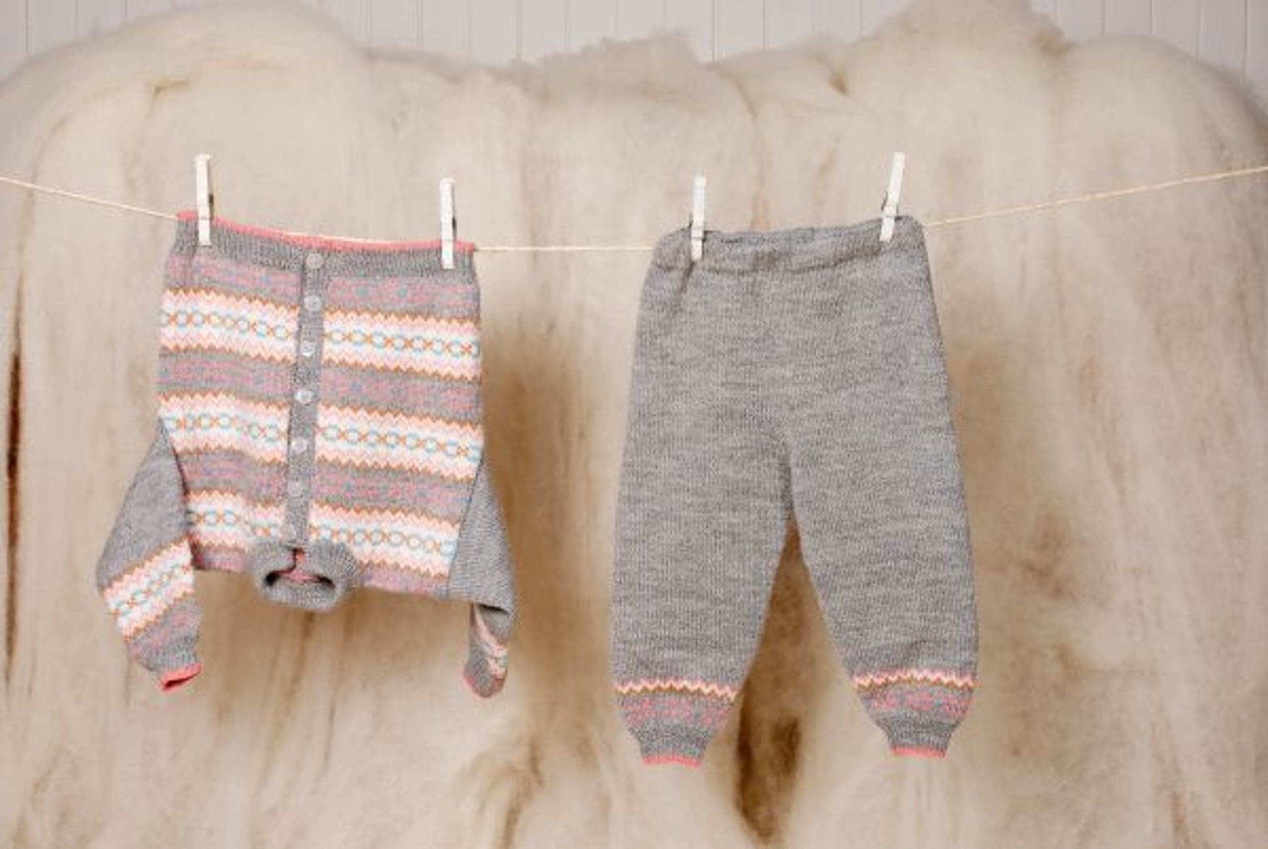 Genser og lue, jakke, bukse og kjole