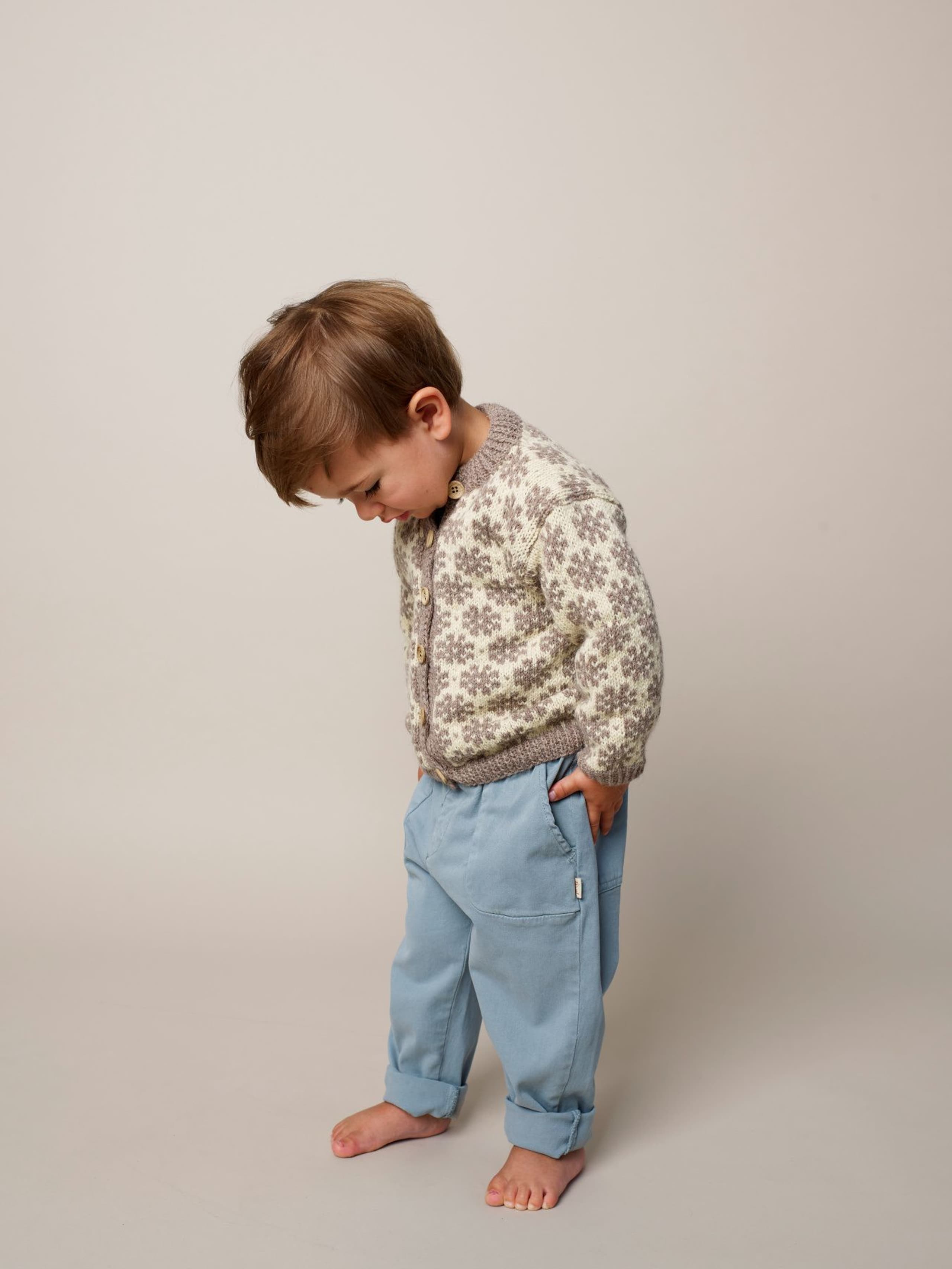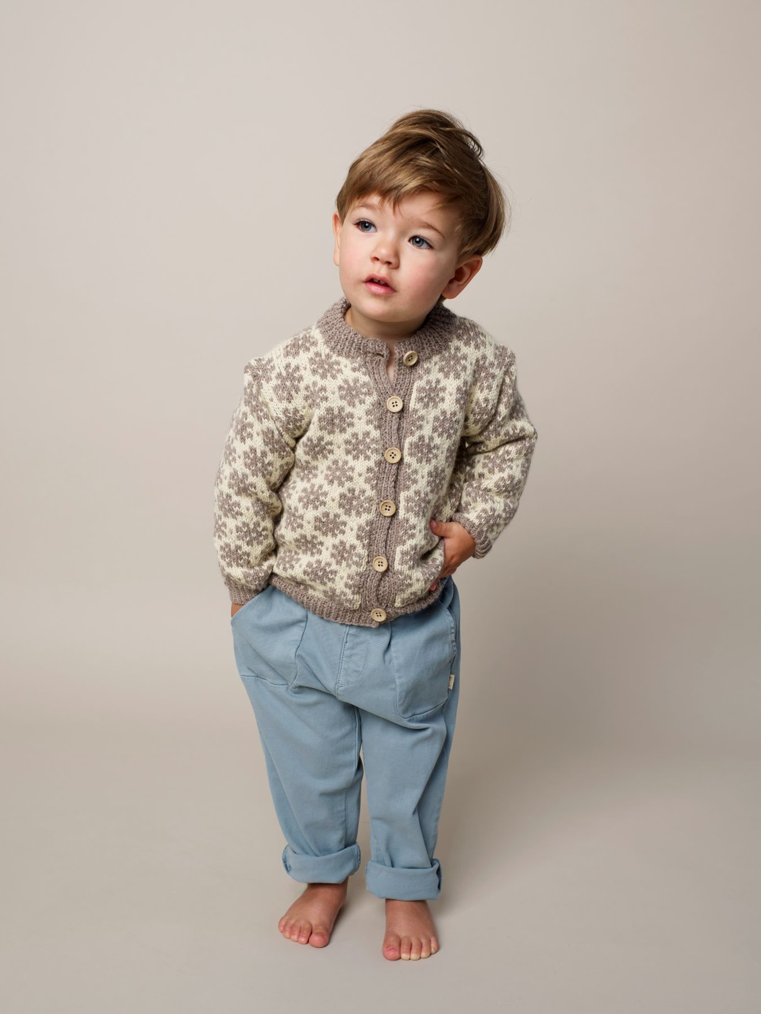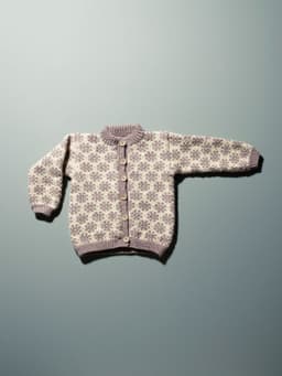 Bjørnebærjakken er helmønstret med isydde ermer. Jakken er strikket rundt og klippet opp foran, til ermer og til halsringning.