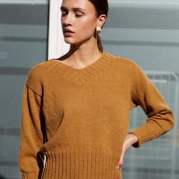 Den fine v-halsgenseren er en enkel og trendy genser med v-hals og brede ribbekanter. Genseren strikkes nedenfra og opp og har isydde ermer. Genseren har en kort passform. Ønsker du en lengre passform er det enkelt å strikke bolen litt lengre før du feller til ermehull. Pass i så fall på å beregne litt ekstra garn.