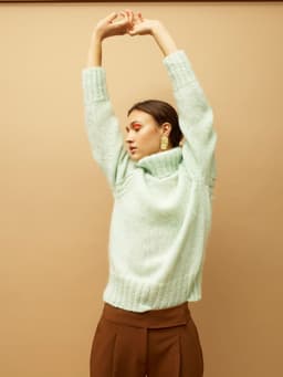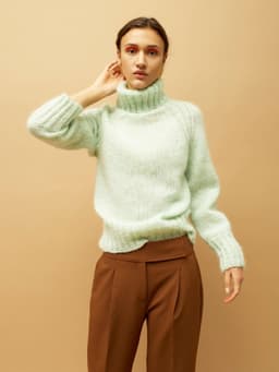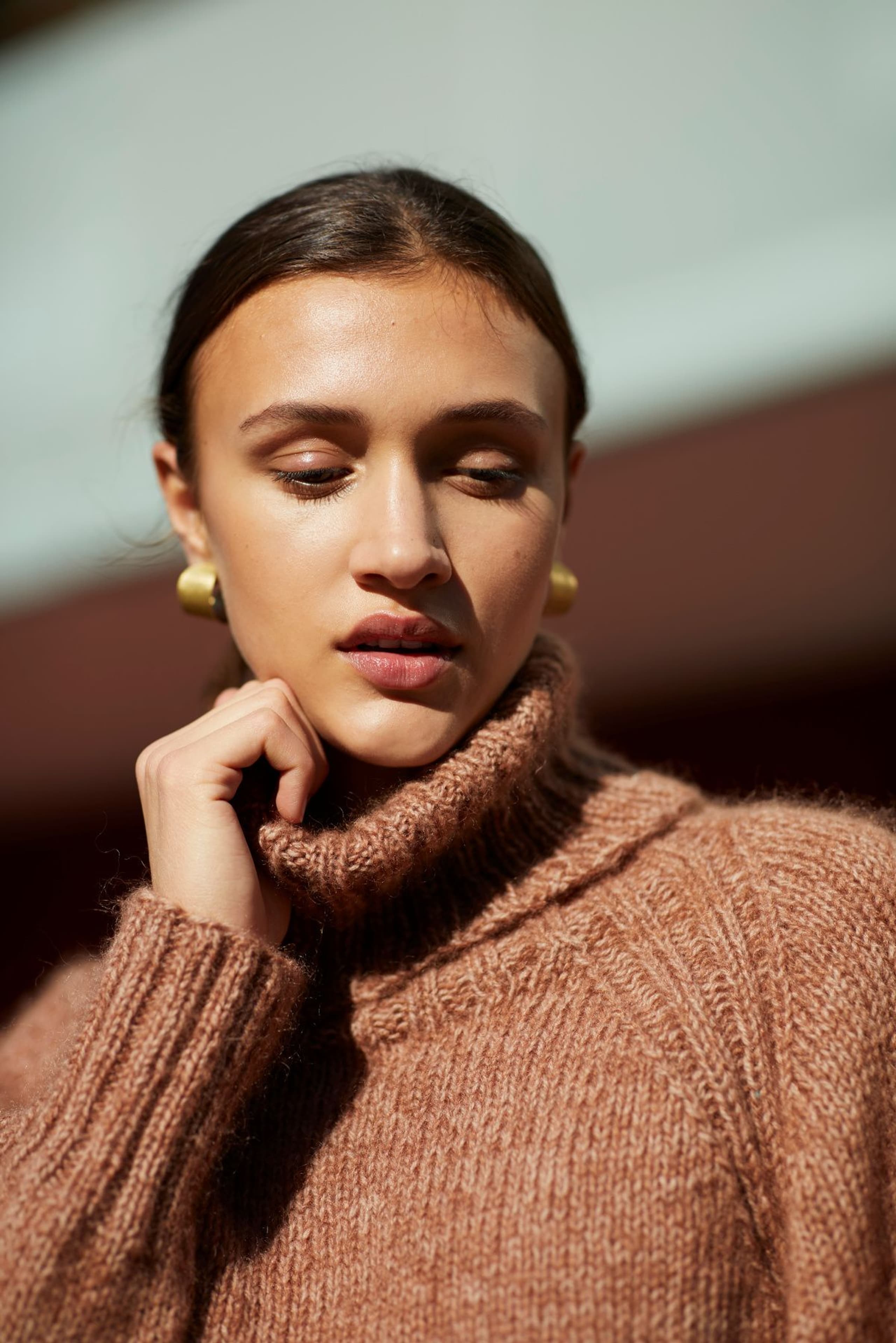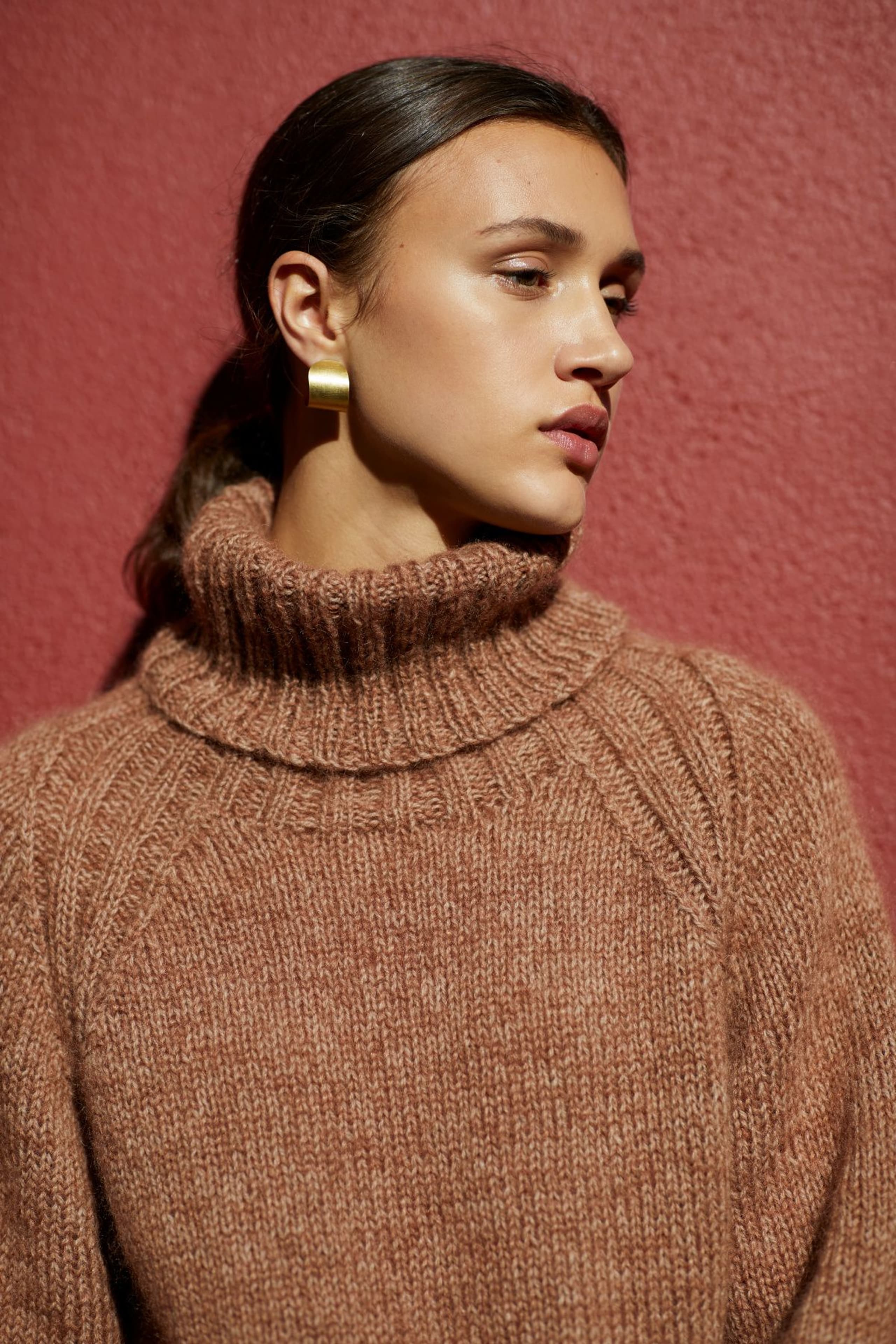 Den myke høyhalseren er en trendy høyhalset genser som passer perfekt utover høsten. Den er strikket med en tråd Lamull sammen med to tråder Plum, en deilig kombinasjon som gir et veldig godt og mykt plagg. Den er strikket nedenfra og opp, med bred raglan, brede ribbekanter og en høy hals. Ønsker du en lavere hals er det enkelt å juster høyden på halsen etter ønske.