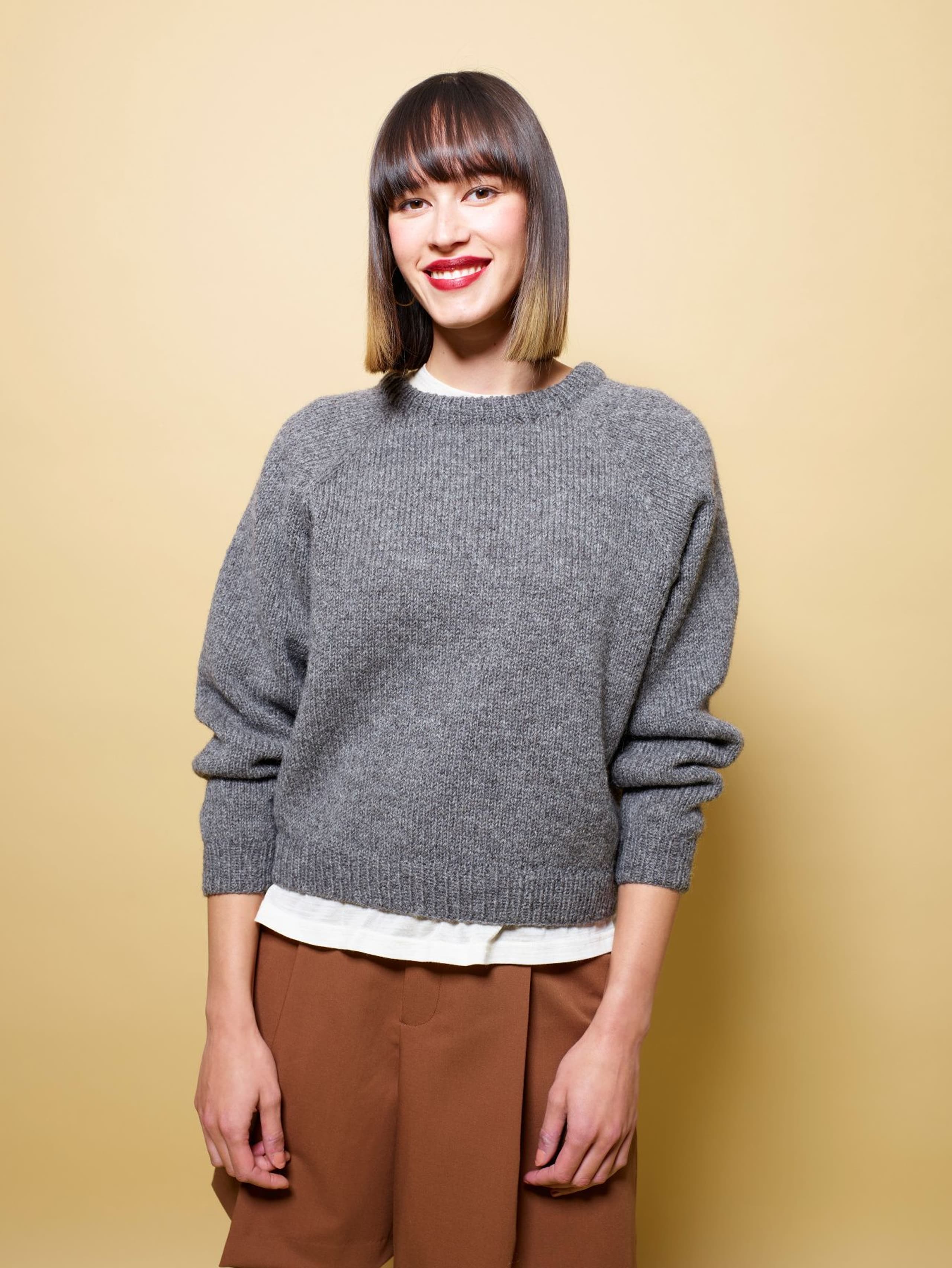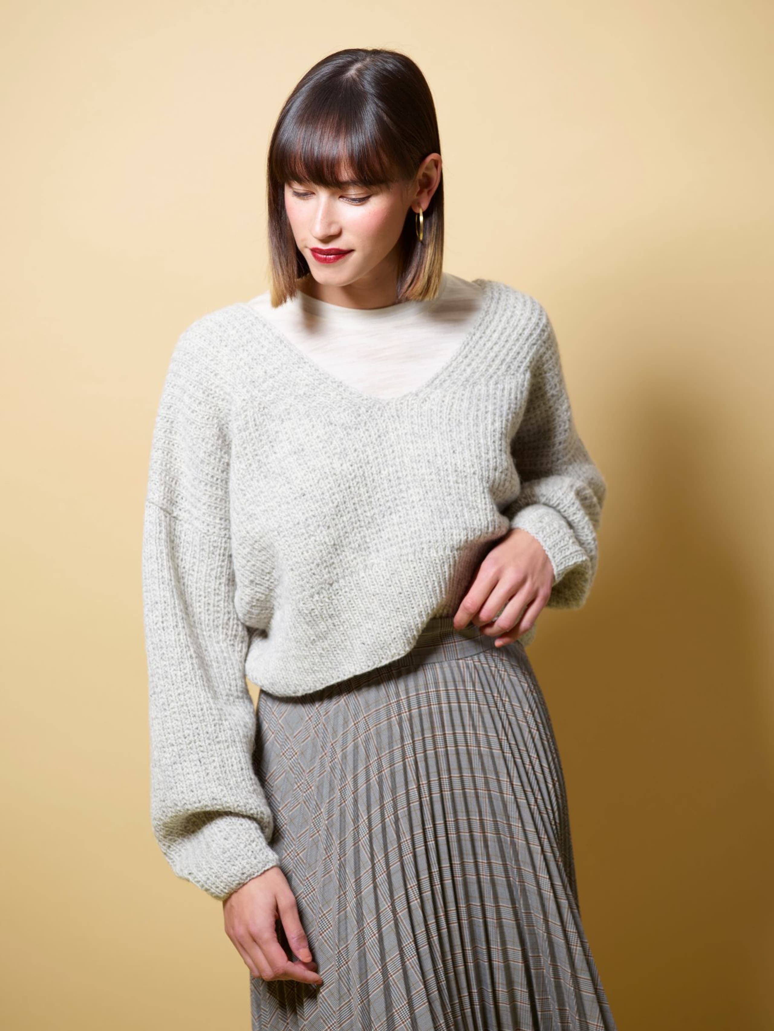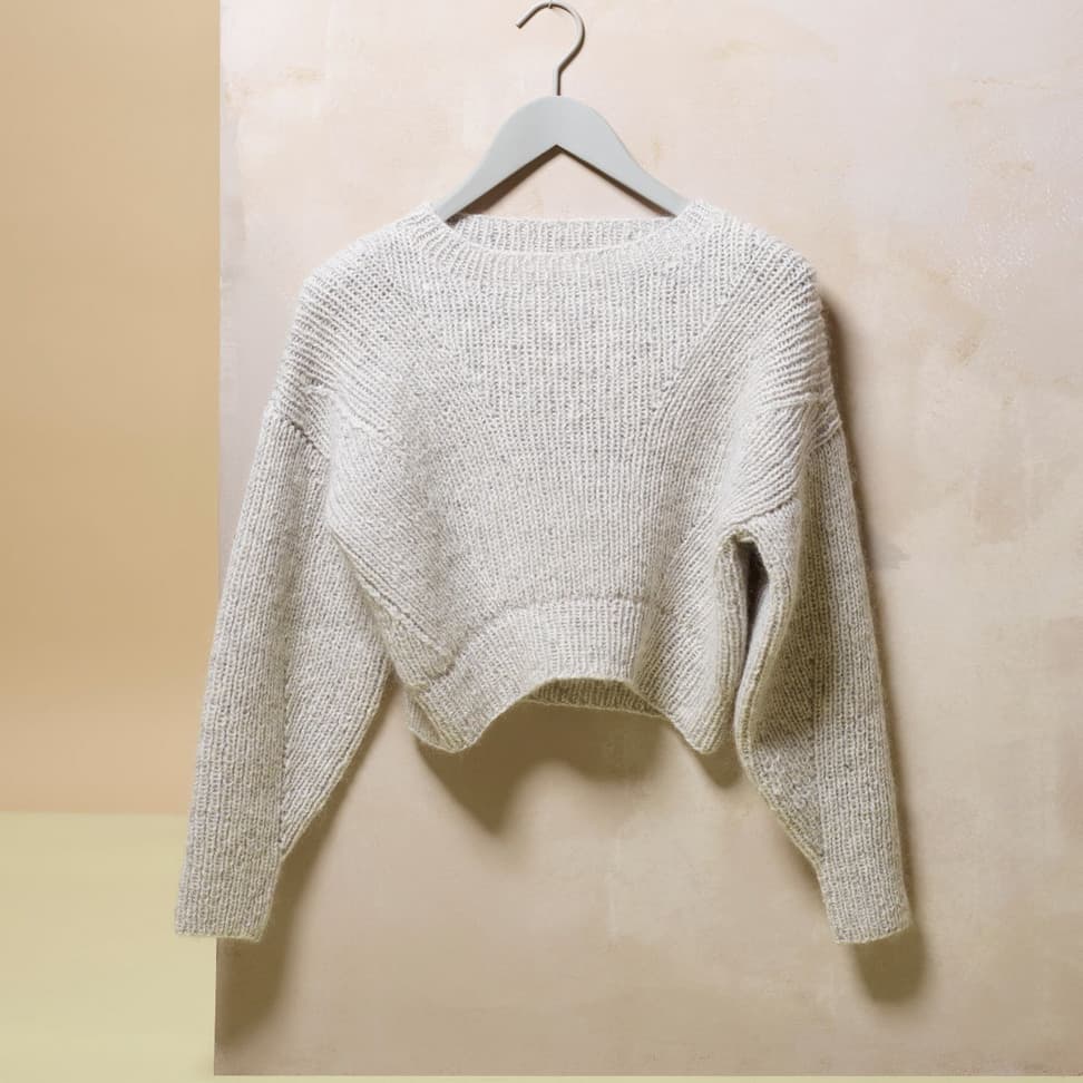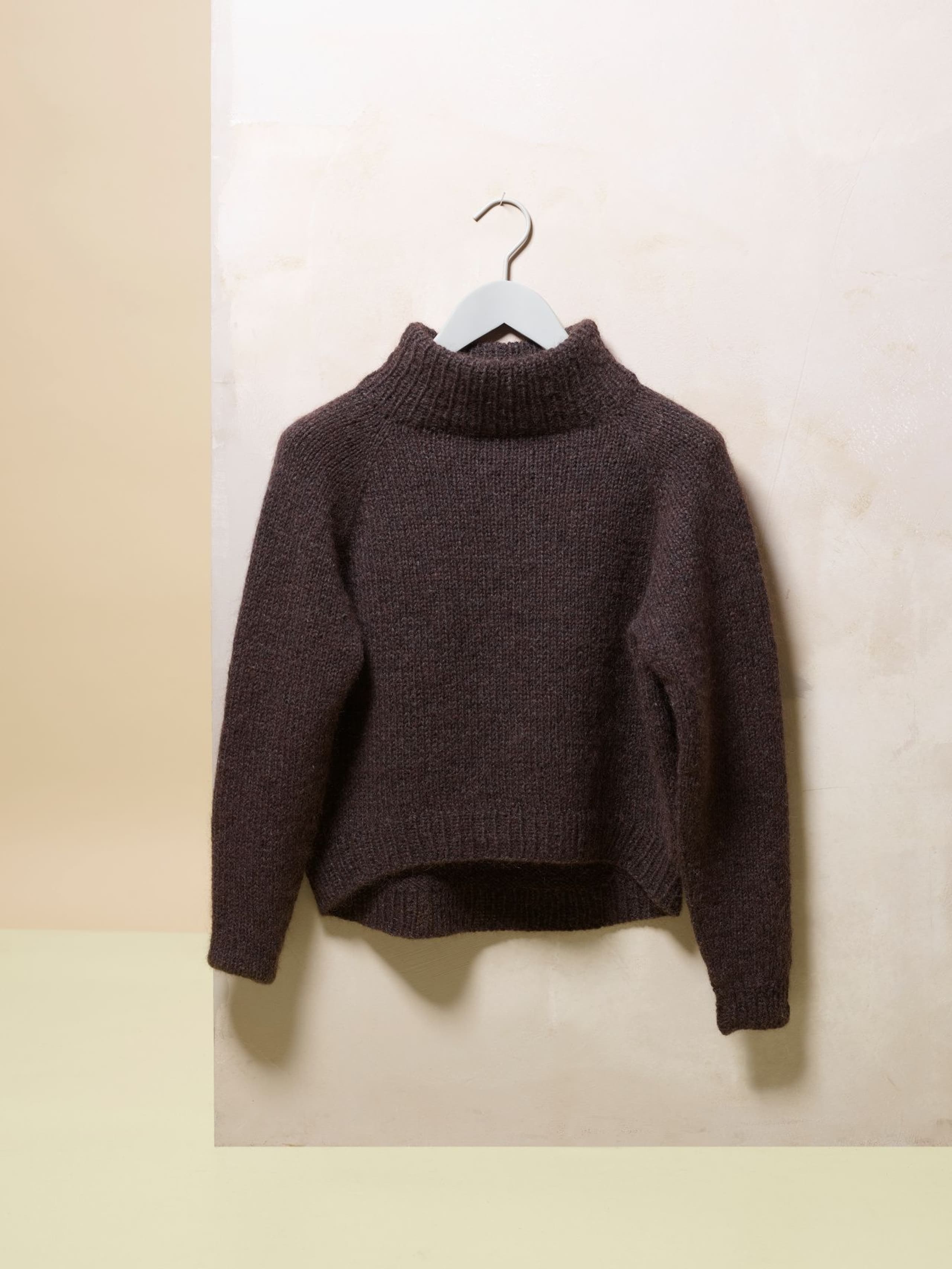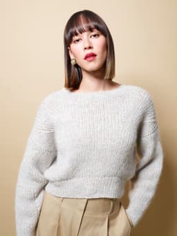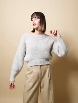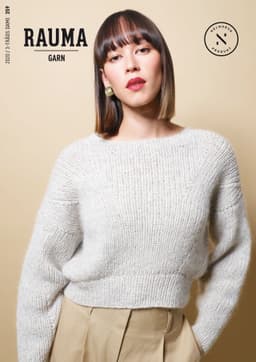 Eira er ribbestrikket genser i 3-tråds Strikkegarn og Plum. Den har en kort, vid passform, med i sydde ermer. På forstykket er det forflytninger av ribbestrikken som danner bølger. Hvis man ønsker en lengre variant, strikk bolen lengre før diagrammet. Når det tas mål på plagget, pass på at arbeidet har rett vidde.