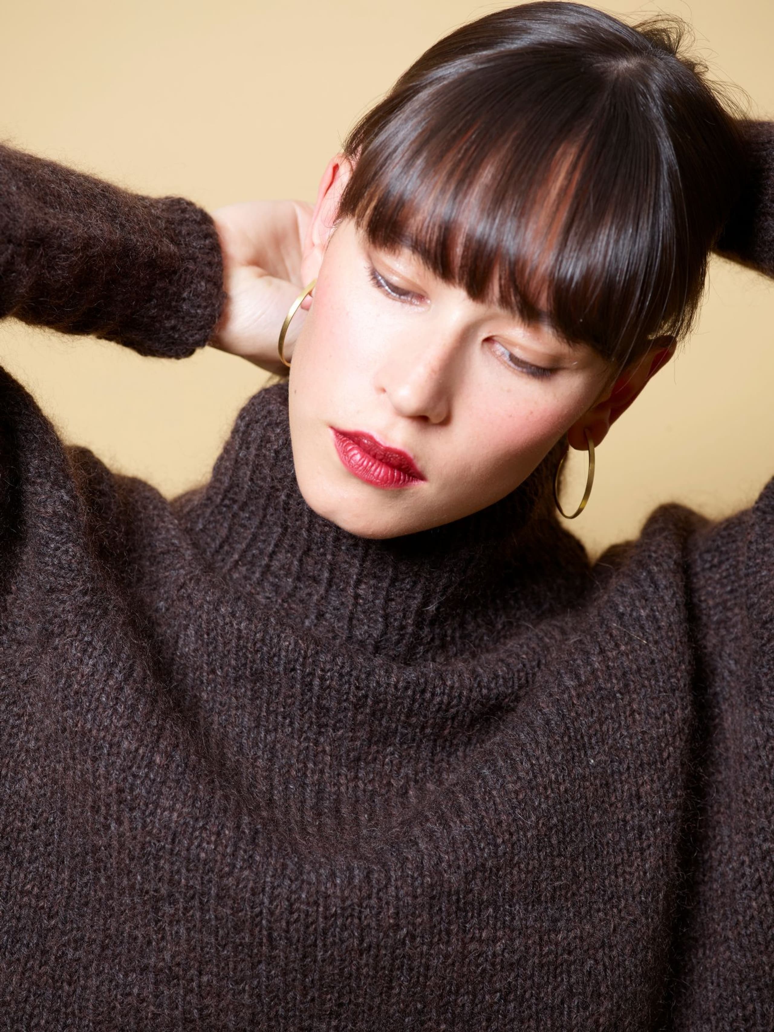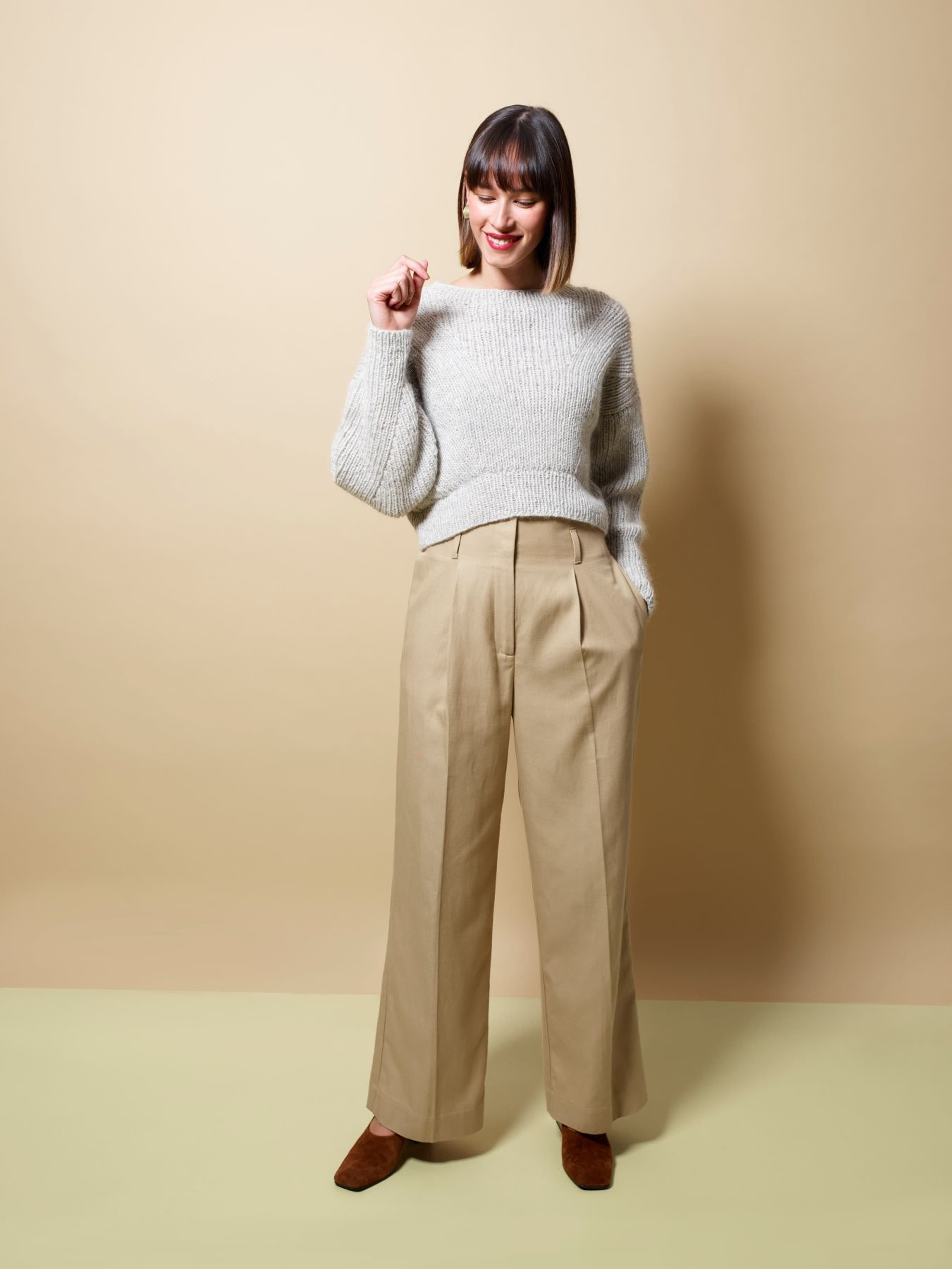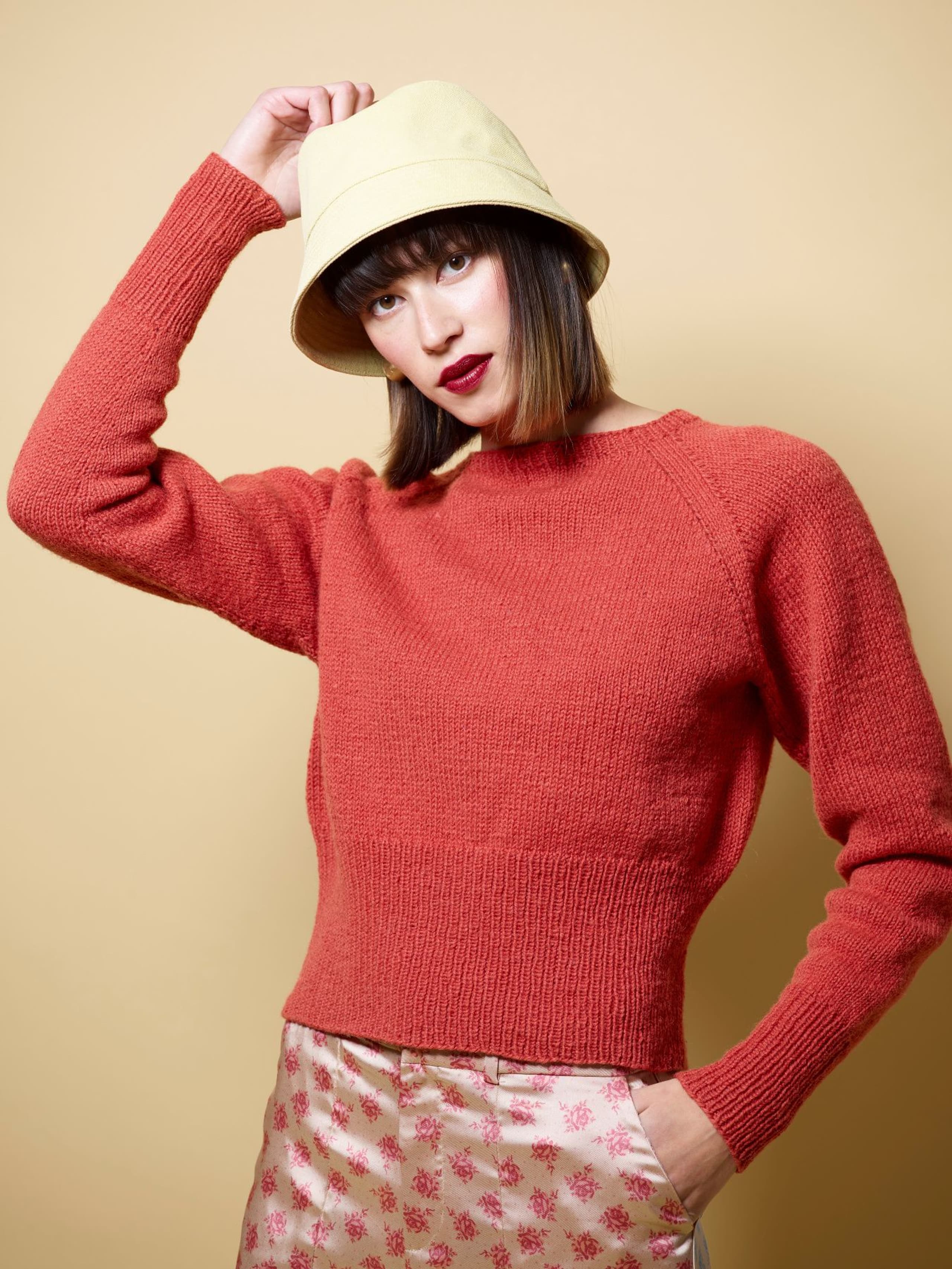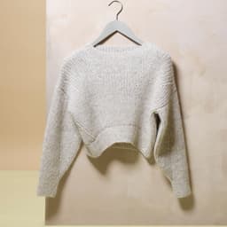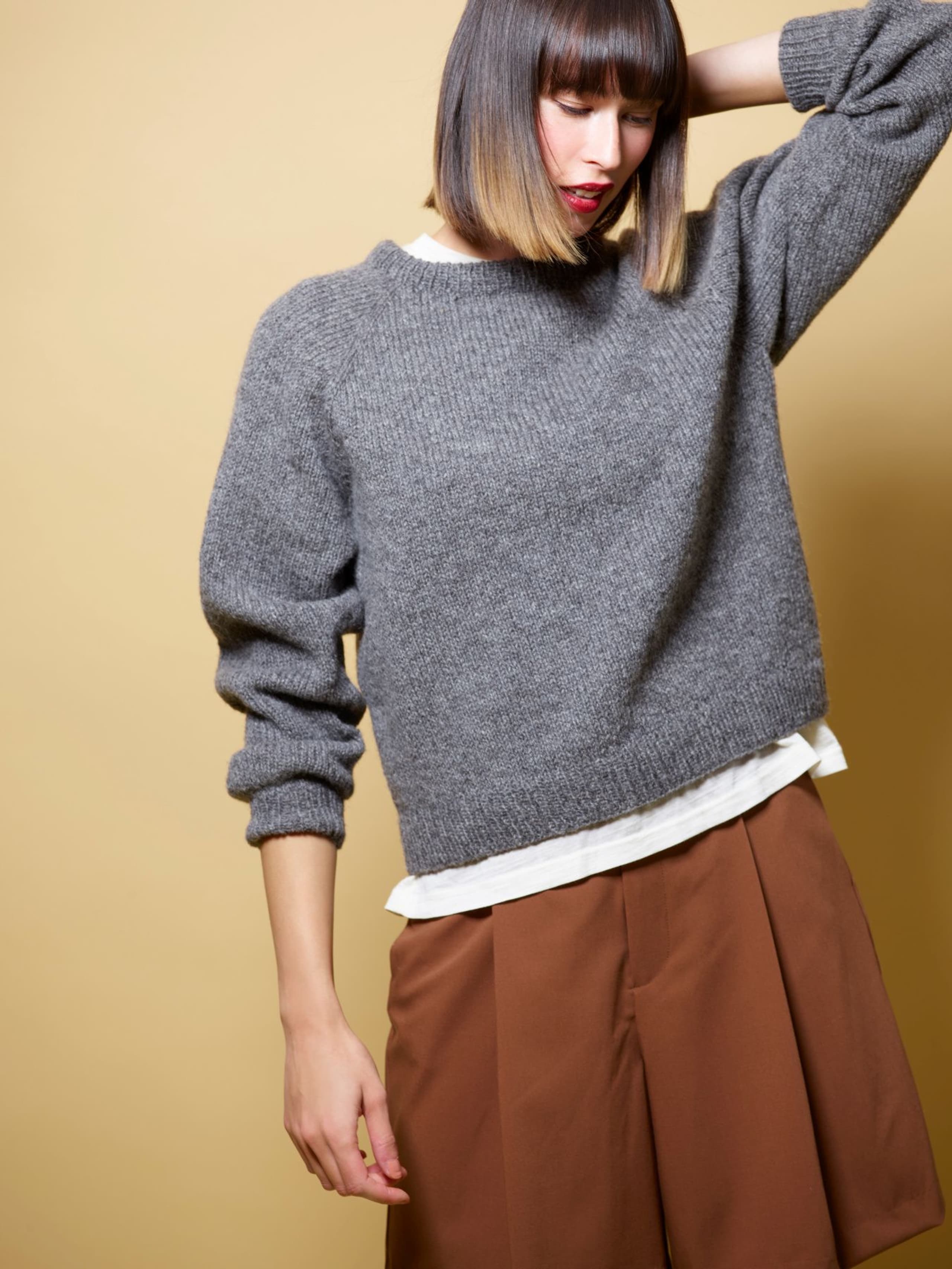 Eira er ribbestrikket genser i 3-tråds Strikkegarn og Plum. Den har en kort, vid passform, med i sydde ermer. På forstykket er det forflytninger av ribbestrikken som danner bølger. Hvis man ønsker en lengre variant, strikk bolen lengre før diagrammet. Når det tas mål på plagget, pass på at arbeidet har rett vidde.