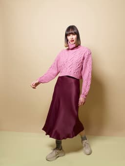 Istragenseren er en høyhalset genser med fletter og isatte ermer.Genseren er vid og kort.