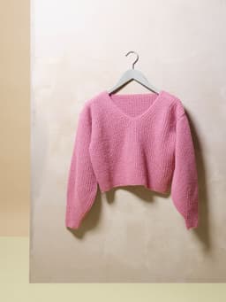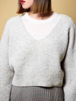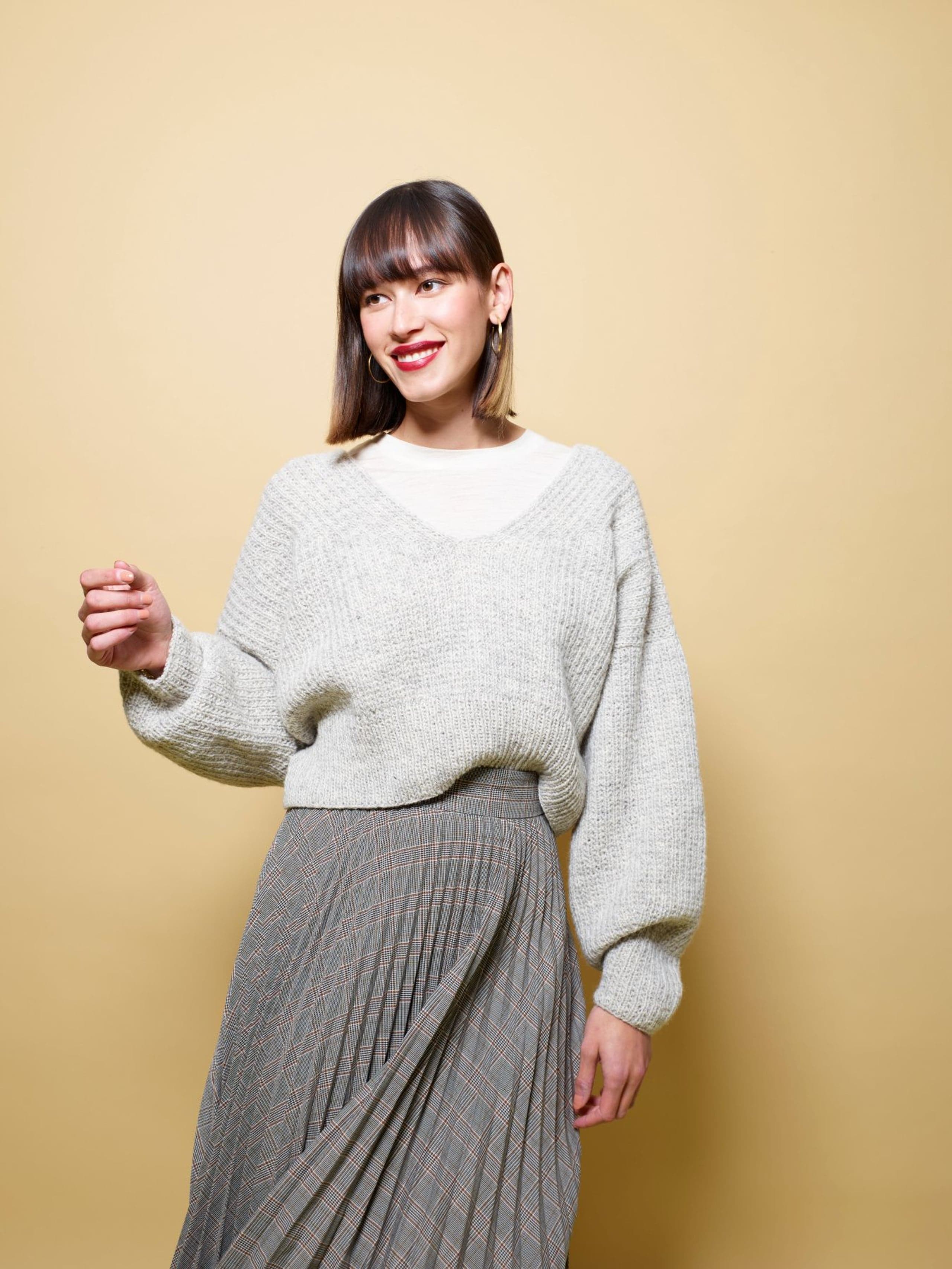 Imsa er en ribbestrikket genser med en litt annen vri på v- hals fellingene. Genseren har isatte ermer.