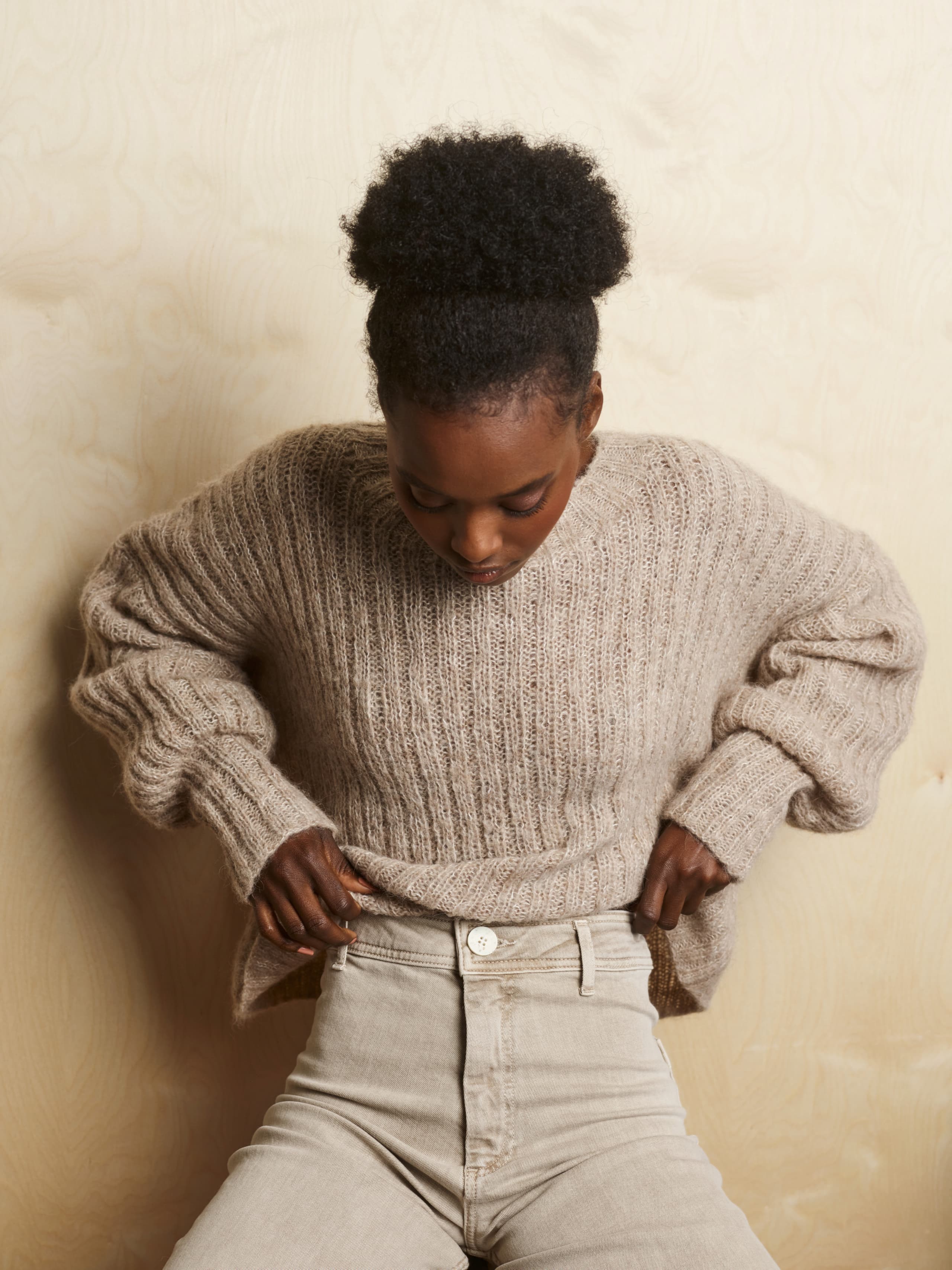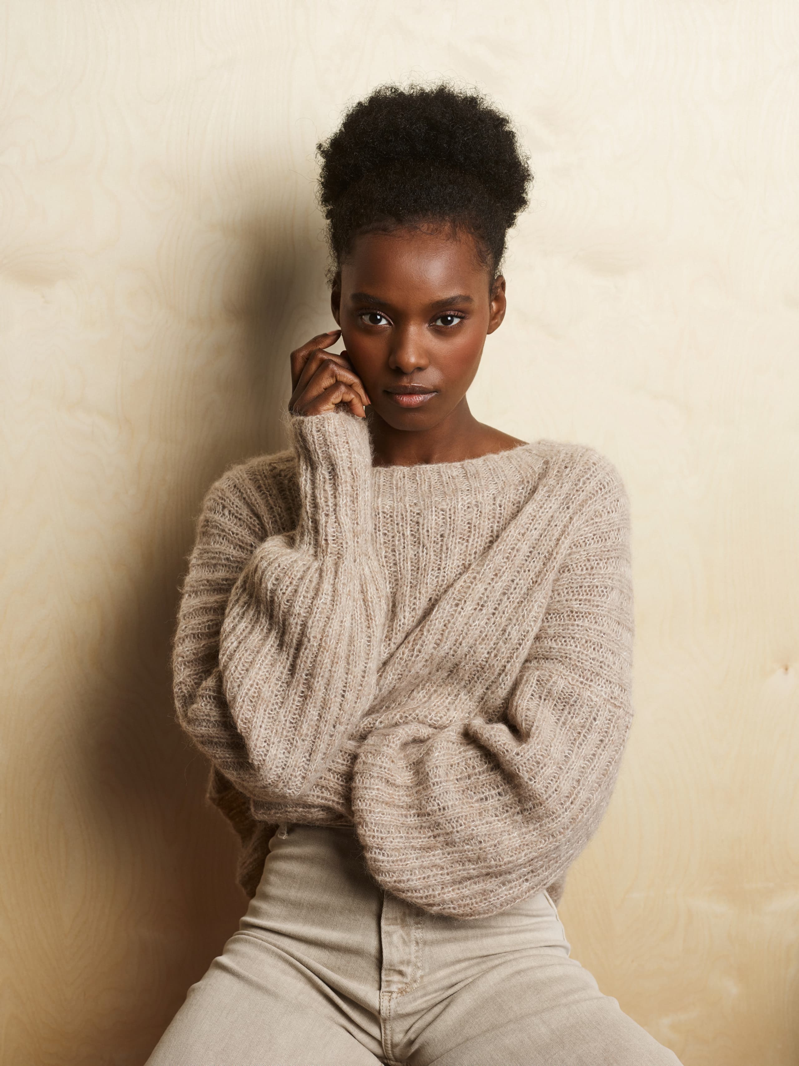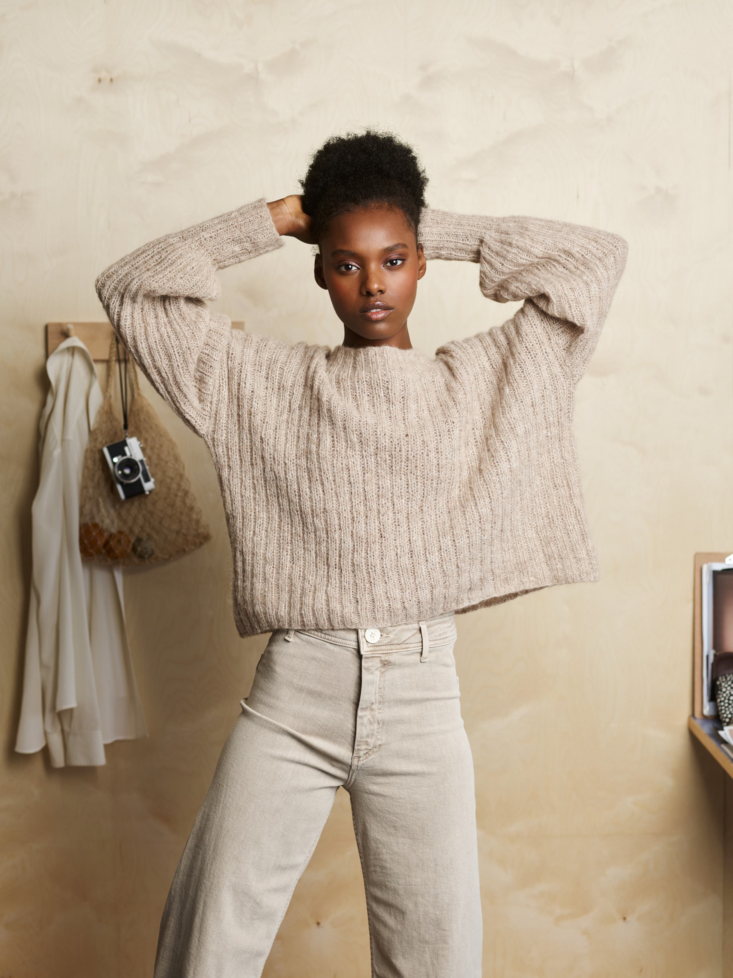 Erles kosegenser er en vid og kort modell med rund hals og vide ermer. Den strikkes nedenfra og opp i ribbestrikk. Masker til ermene strikkes opp langs ermehullet og ermene strikkes «nedover». Ermene har lange mansjetter som er fine både med og uten oppbrett. Alpakka Lin har lite spenst og «spretter» ikke tilbake i fasong slik mange garnkvaliteter gjør. Vær derfor forberedt på at plagget kan utvide seg noe – spesielt om det er strikket løst, og ta dette med i beregningen når du velger størrelse. Vær nøye med å ikke få for løs strikkefasthet. Damp gjerne prøvelappen din før du måler.