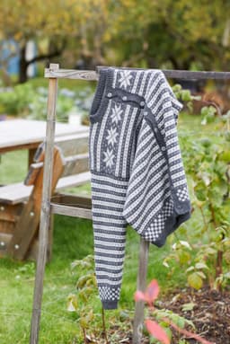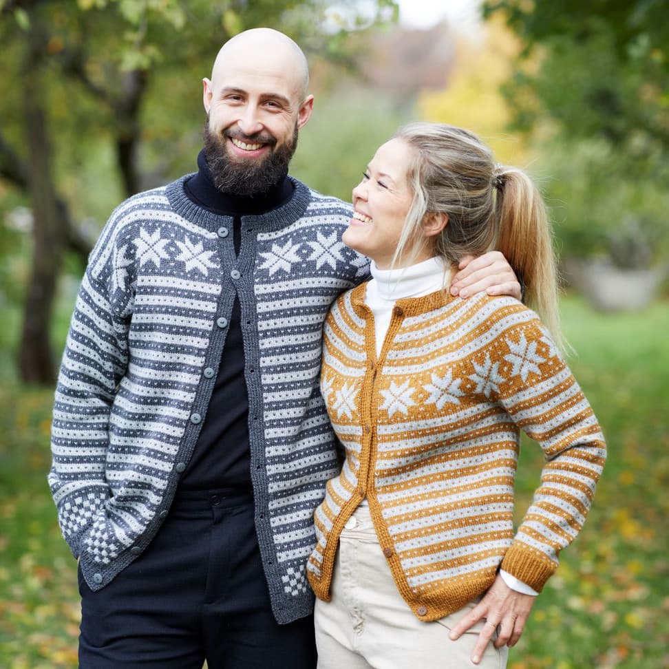 Fanamønsteret er en gammel klassiker. Denne jakken er strikket rundt på rundpinne og klippet opp midt foran til slutt. Jakken er strikket med vrangborder 1 r, 1 vr og har isydde ermer.