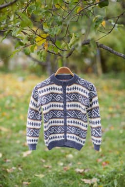 Nordlandsmønsteret er en gammel klassiker som ble lansert under andre verdenskrig. I denne versjonen har vi forenklet noe og utelatt noen av bordene fra originalen. Jakken har isydde ermer og er strikket rundt, nedenfra og opp. Åpningen foran og ermehullene er klippet opp til slutt og klippemaskene er dekket med belegg.