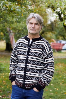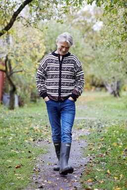 Nordlandsmønsteret er en gammel klassiker som ble lansert under andre verdenskrig. I denne versjonen har vi utelatt noen av bordene fra originalen. Kofta har isydde ermer. Den strikkes rundt, nedenfra og opp med vrangborder i 1 r, 1 vr. Ermehullene og åpningen foran er klippet opp og klippekantene er dekket av et belegg. Knappestolper strikkes og monteres til slutt.
