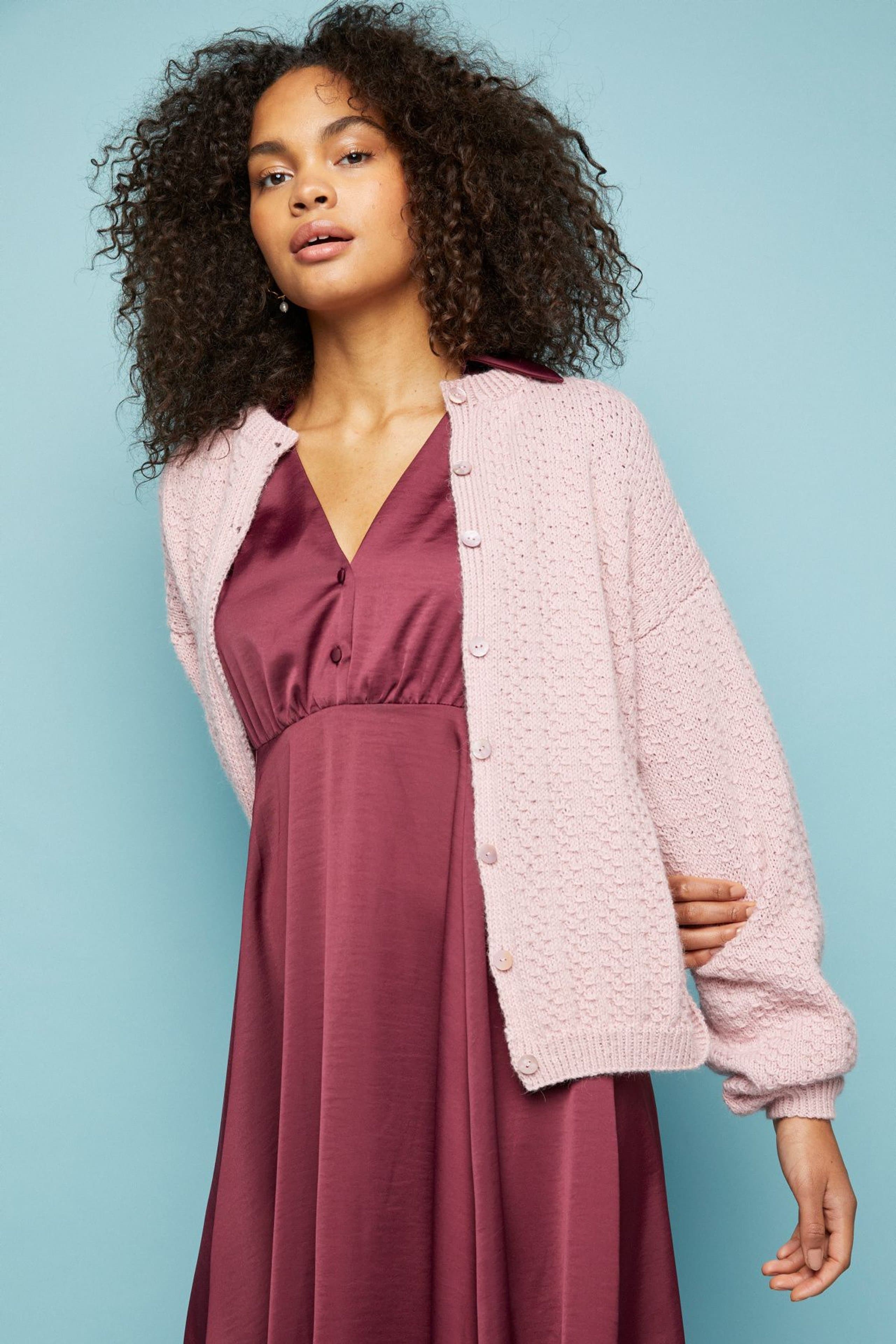 Noemiejakken har isydde ermer og en nett struktur. Jakken er strikket fram og tilbake. Bevegelsesvidde på ca 5 cm.