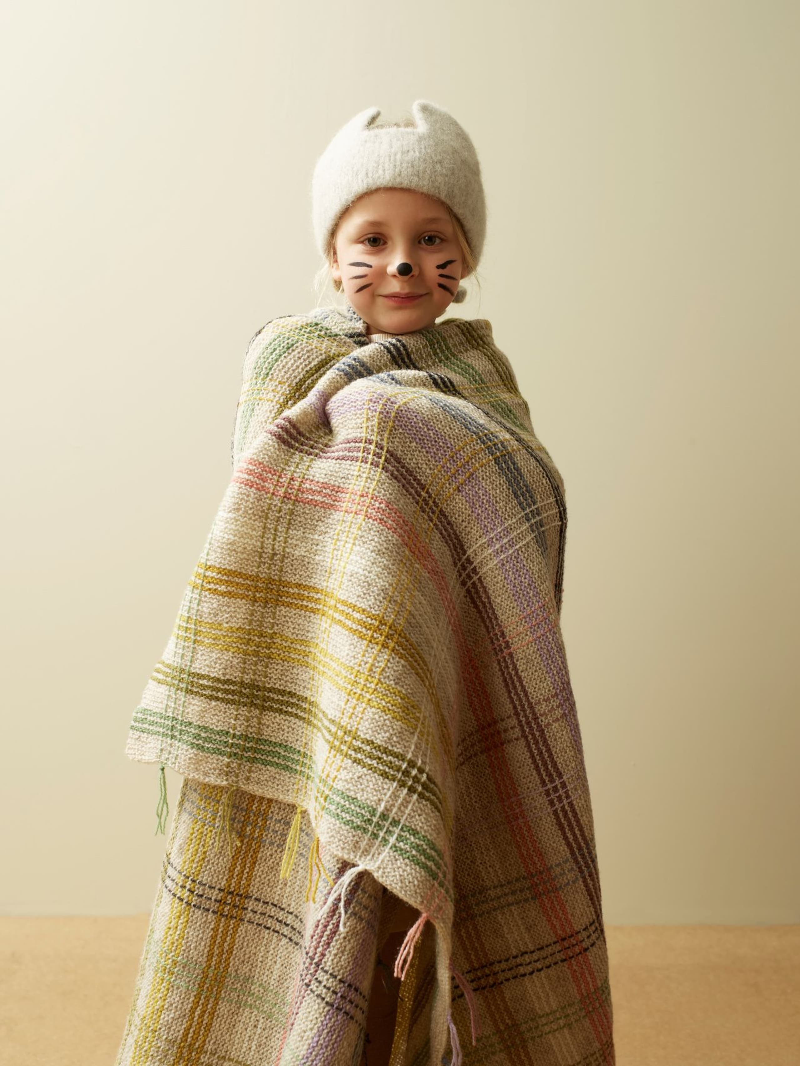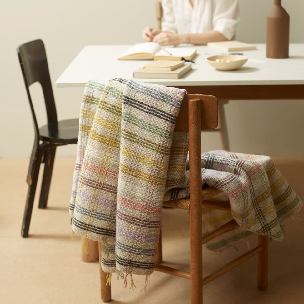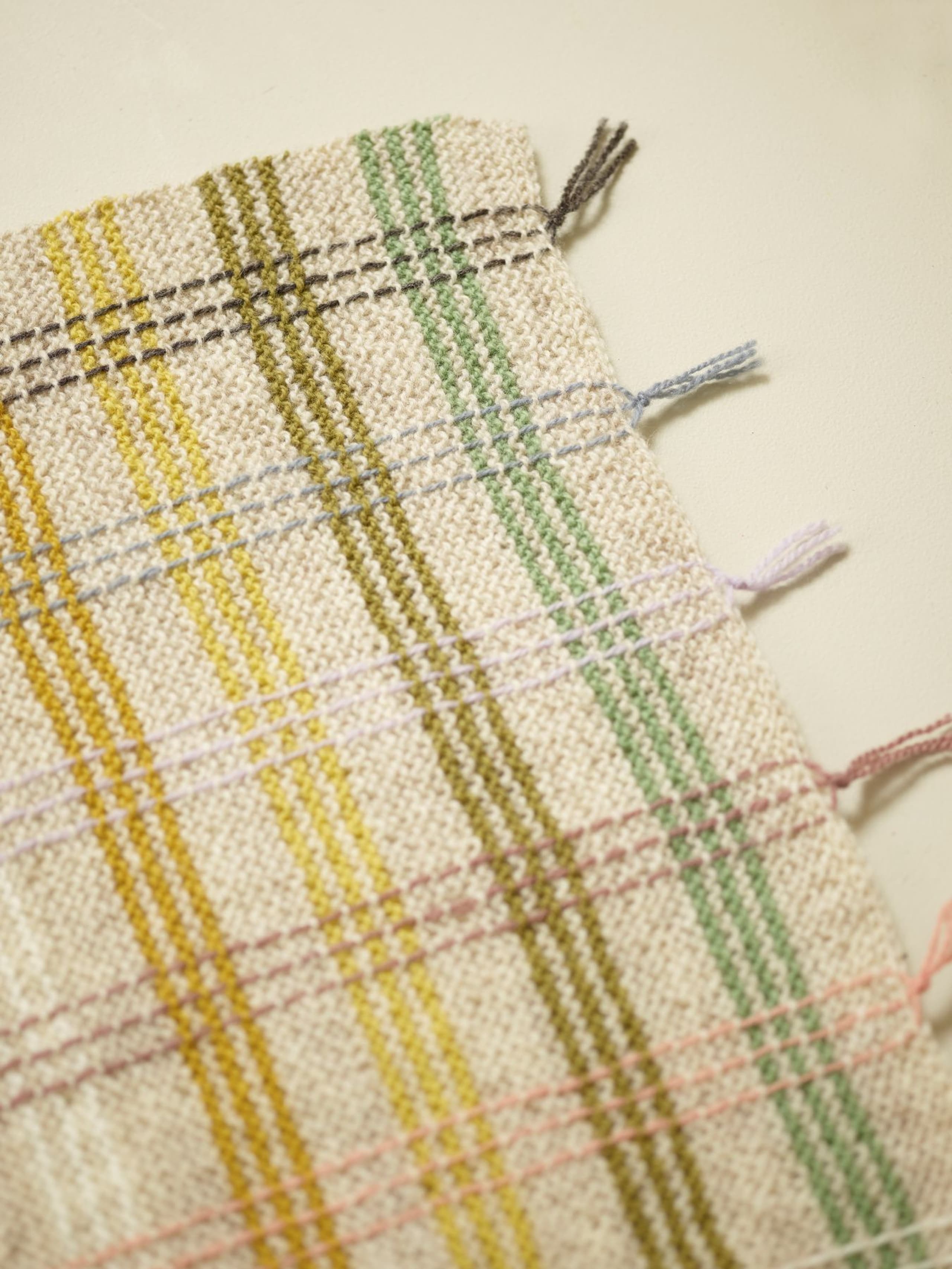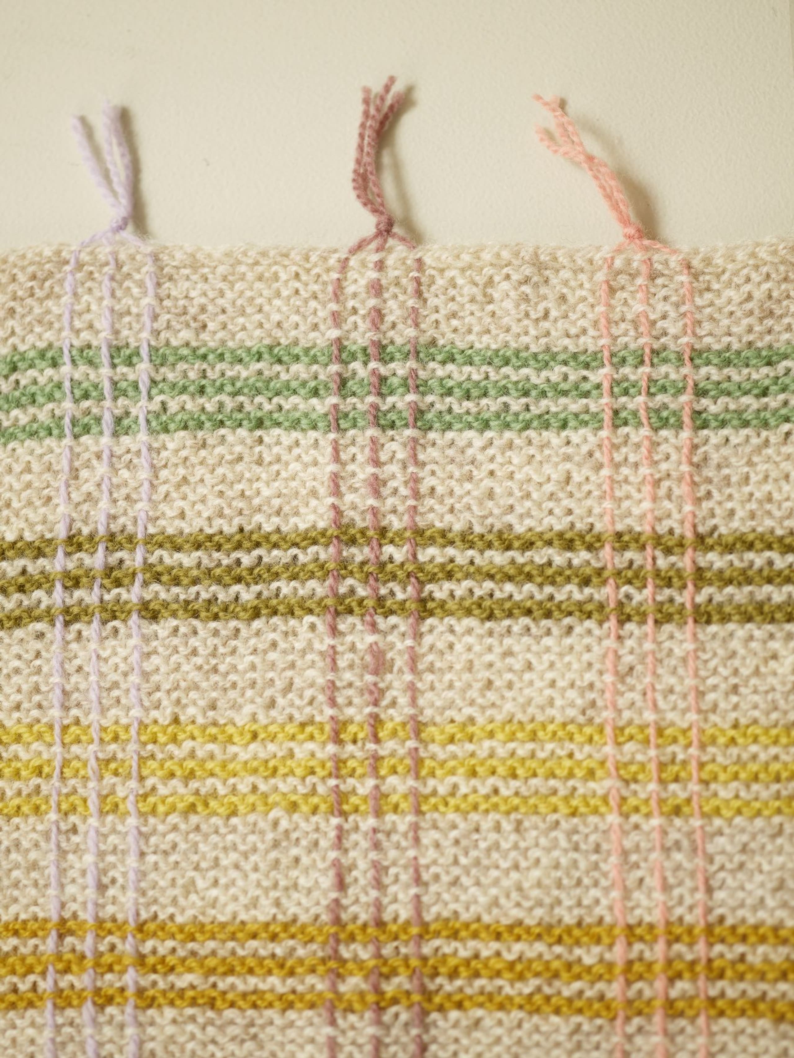 Pleddet er rillestrikket. Én hovedfarge brytes med fargerike striper. Etter pleddet er ferdig strikket, sys det inn loddrette i striper for å danne rutemønsteret. Alternativ 1 holder en vårlig palett. Alternativ 2 har et mer høstlig preg.