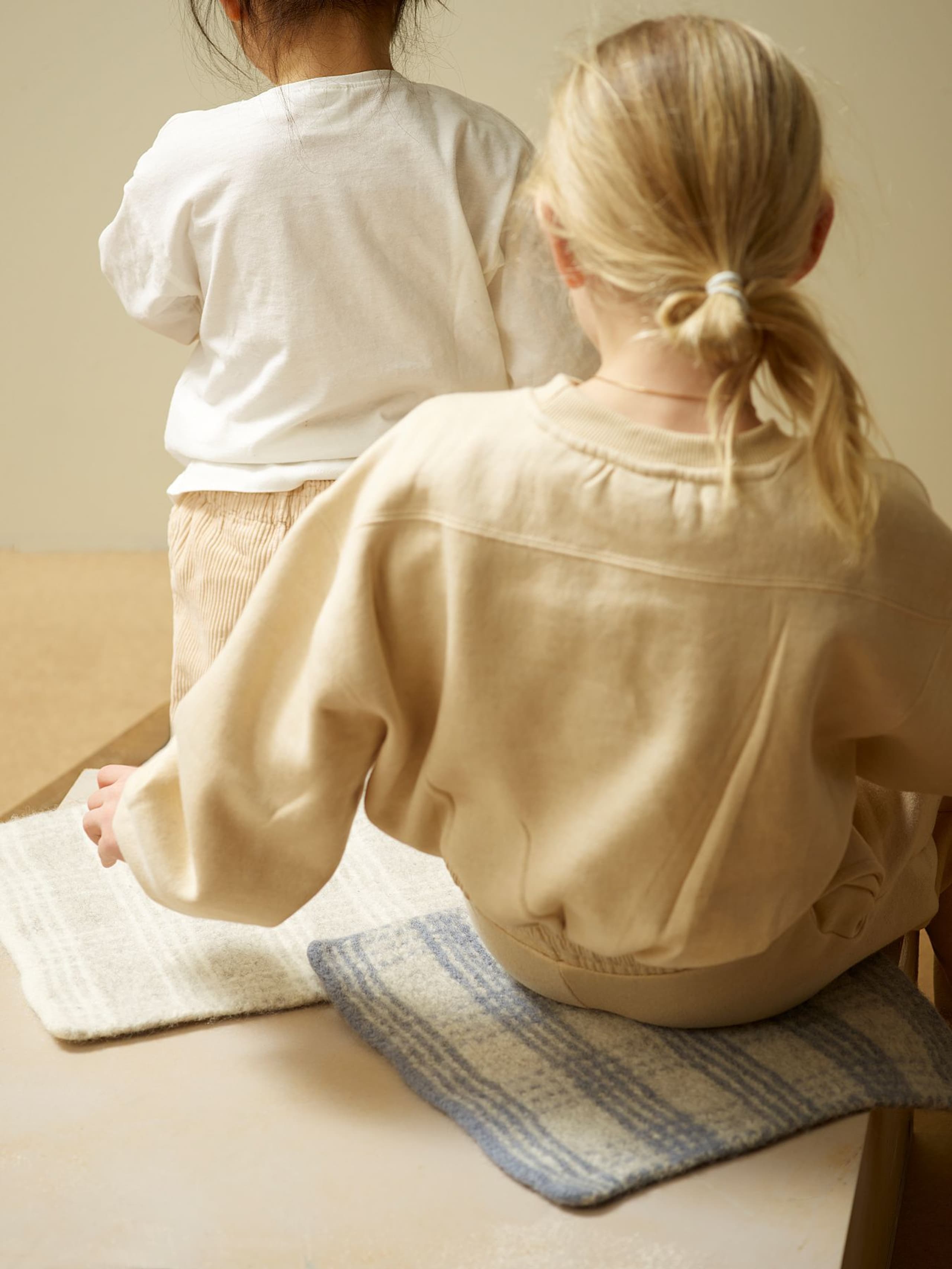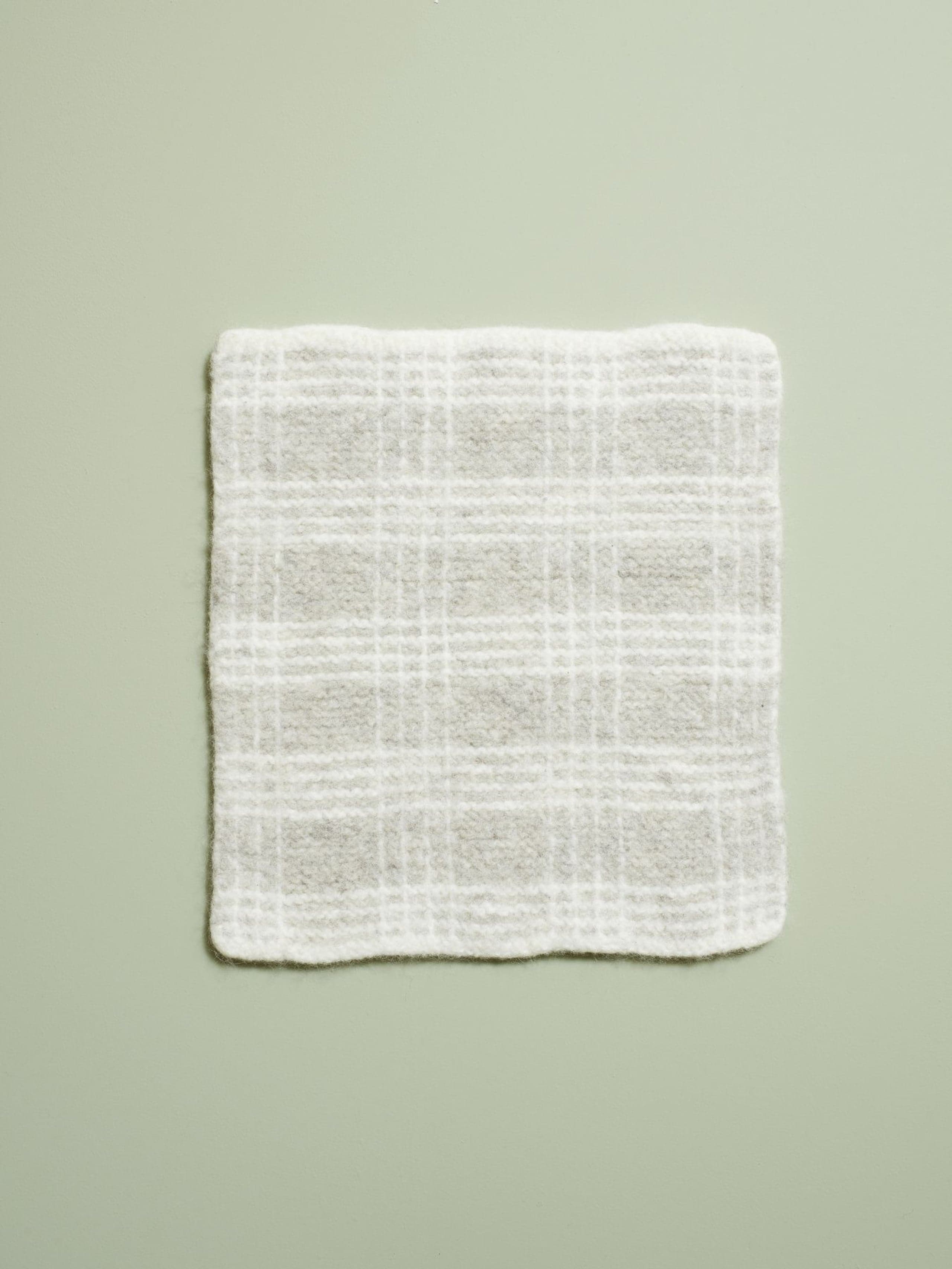 Sitteunderlaget er strikket i rillestrikk frem og tilbake i to kontrastfarger. Etter det er ferdig strikket, syr man inn garn i loddrette striper for å danne rutemønsteret. Til slutt toves sitteunderlaget. Da blir det deilig, mykt og loddent og akkurat passe tykt.