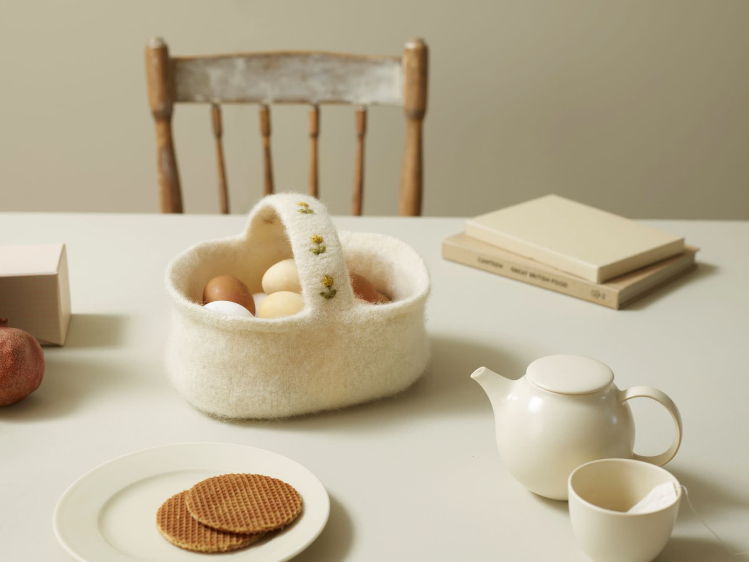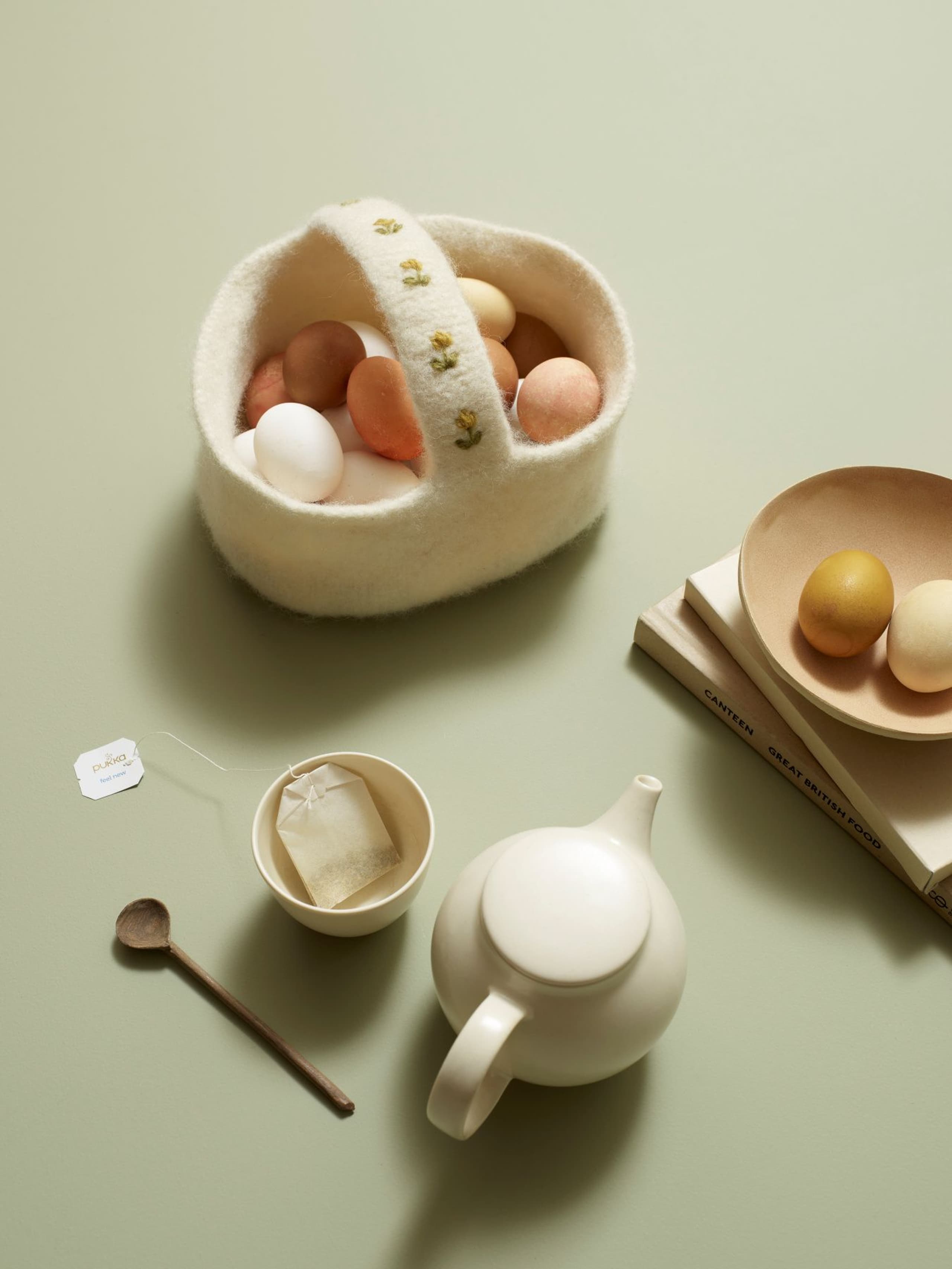 En lettstrikket kurv som kan toves og dekoreres. Bruk den til eggjakten, eller til strikketøyet. Fyll den med påskekos, en god bok og noe fint garn, og du har en nydelig påskegave. Vær oppmerksom på at bleket hvit nr 00 og svart nr 36 ikke egner seg til toving.