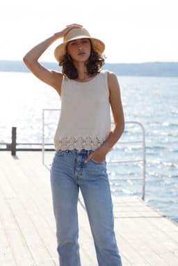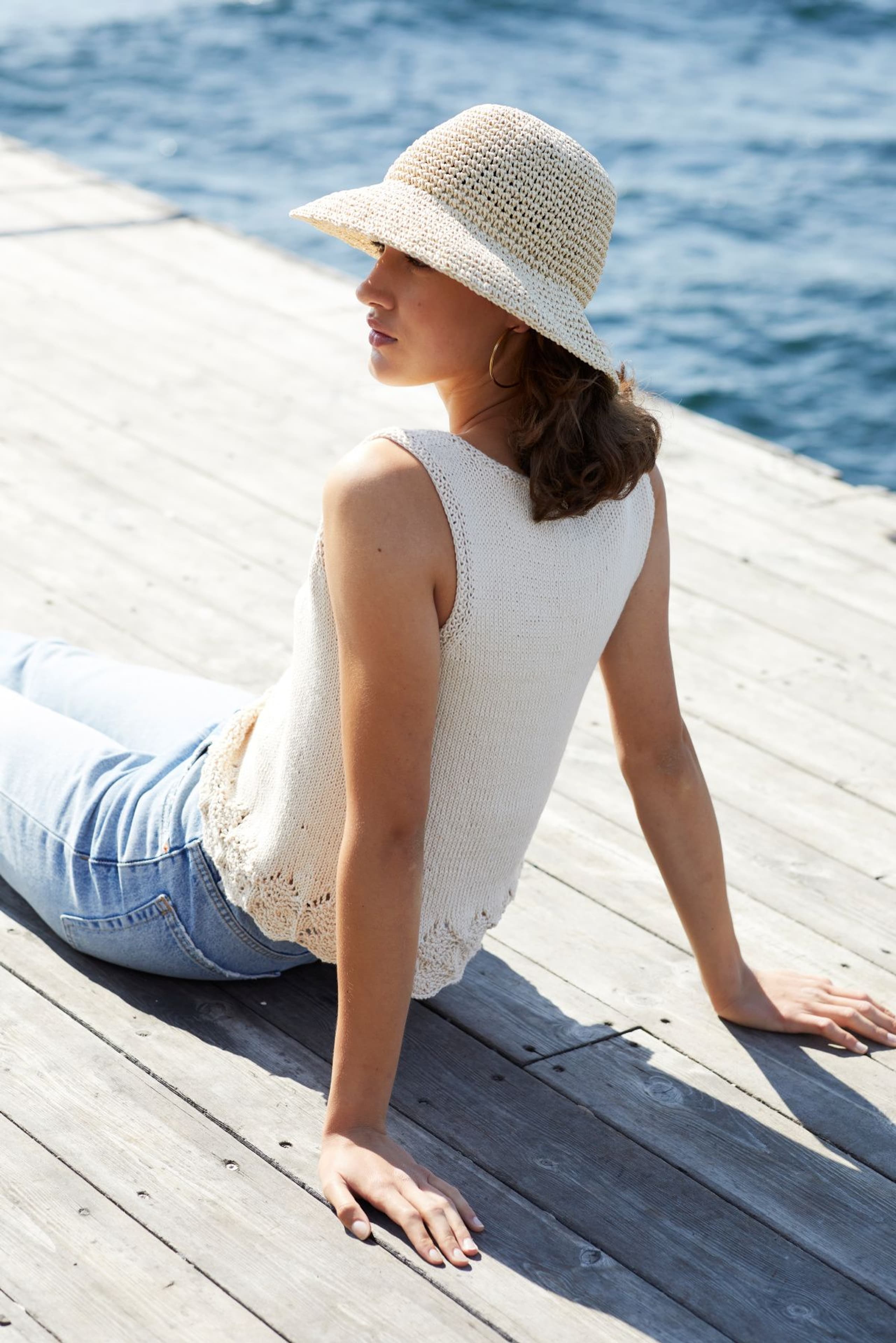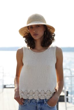 Enkel topp uten ermer med hullmønster nederst i kanten. Strikket i glattstrikk, nedenfra og opp. Fra ermehullet strikk for - og bakstykket hver for seg frem og tilbake.