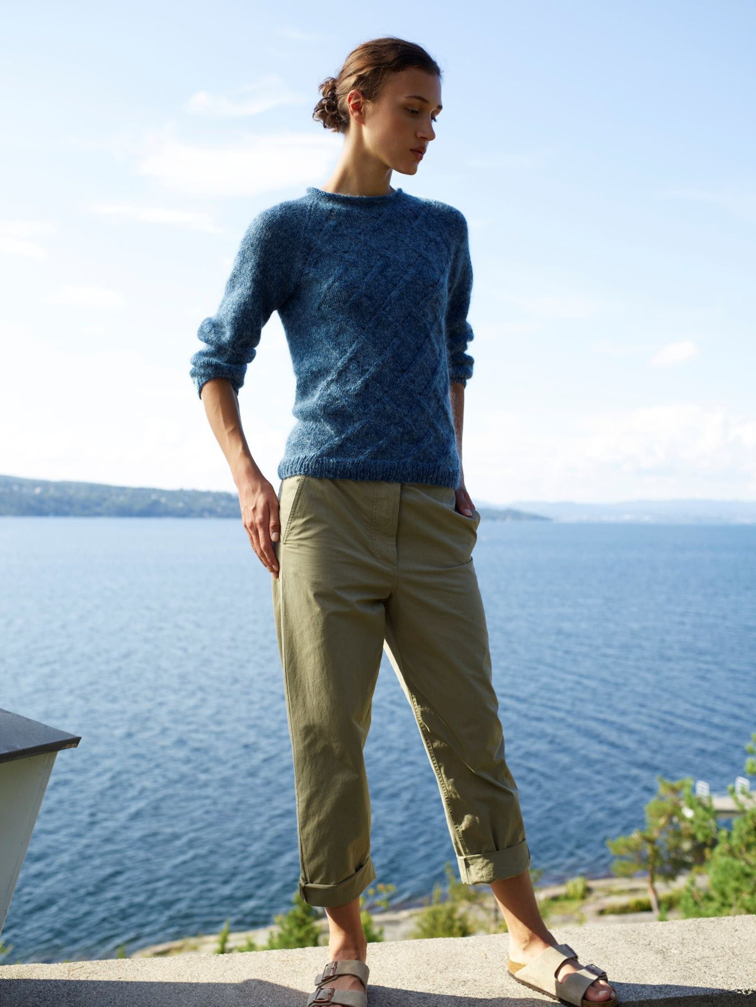 Hele genseren strikkes med to tråder, en av hver kvalitet. Genseren strikkes rundt nedenfra og opp med raglanfelling og med flettemønster foran på bolen. Genseren har rund halsringning med rullekant. Genseren har en tenkt bevegelsesvidde på 8 cm.