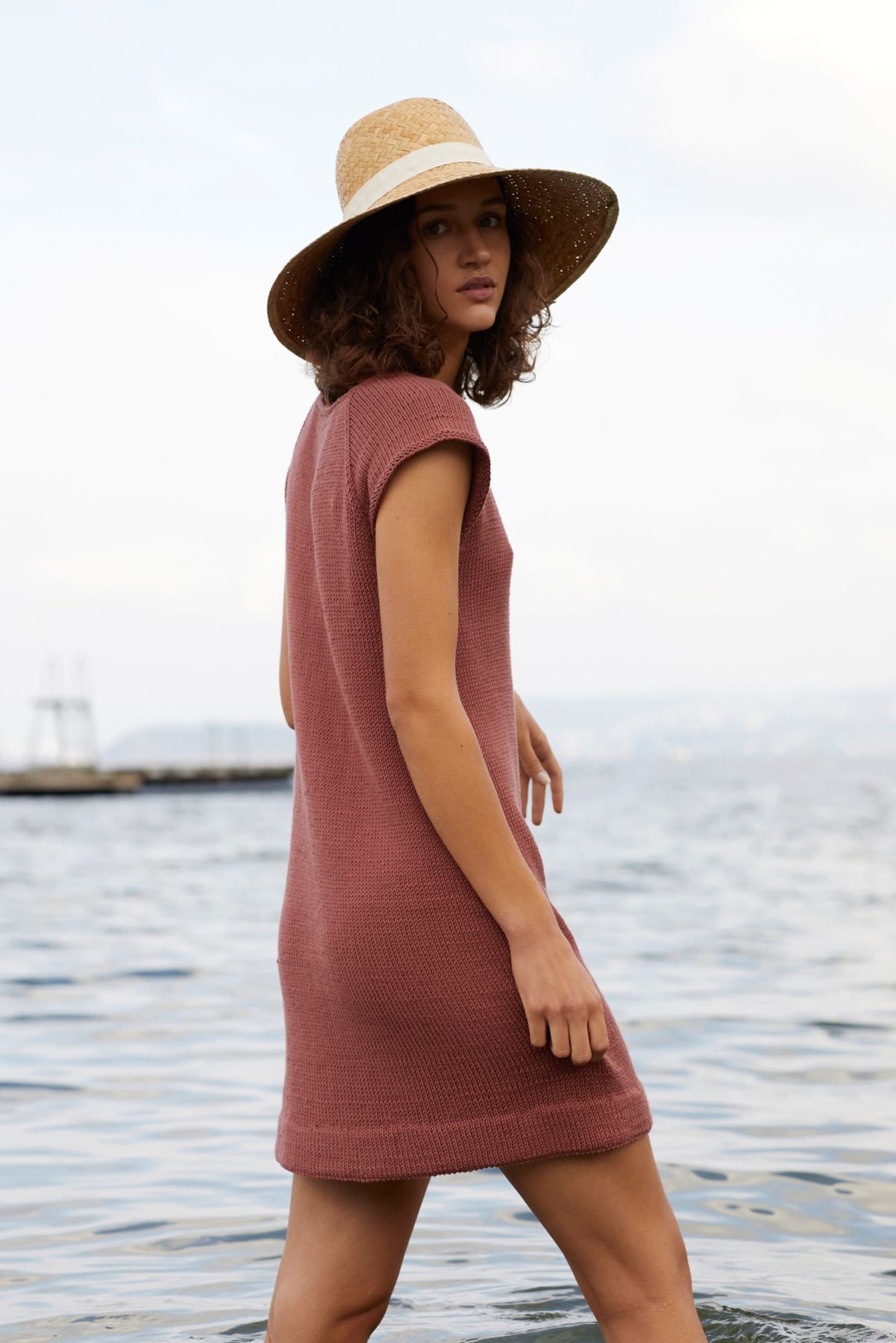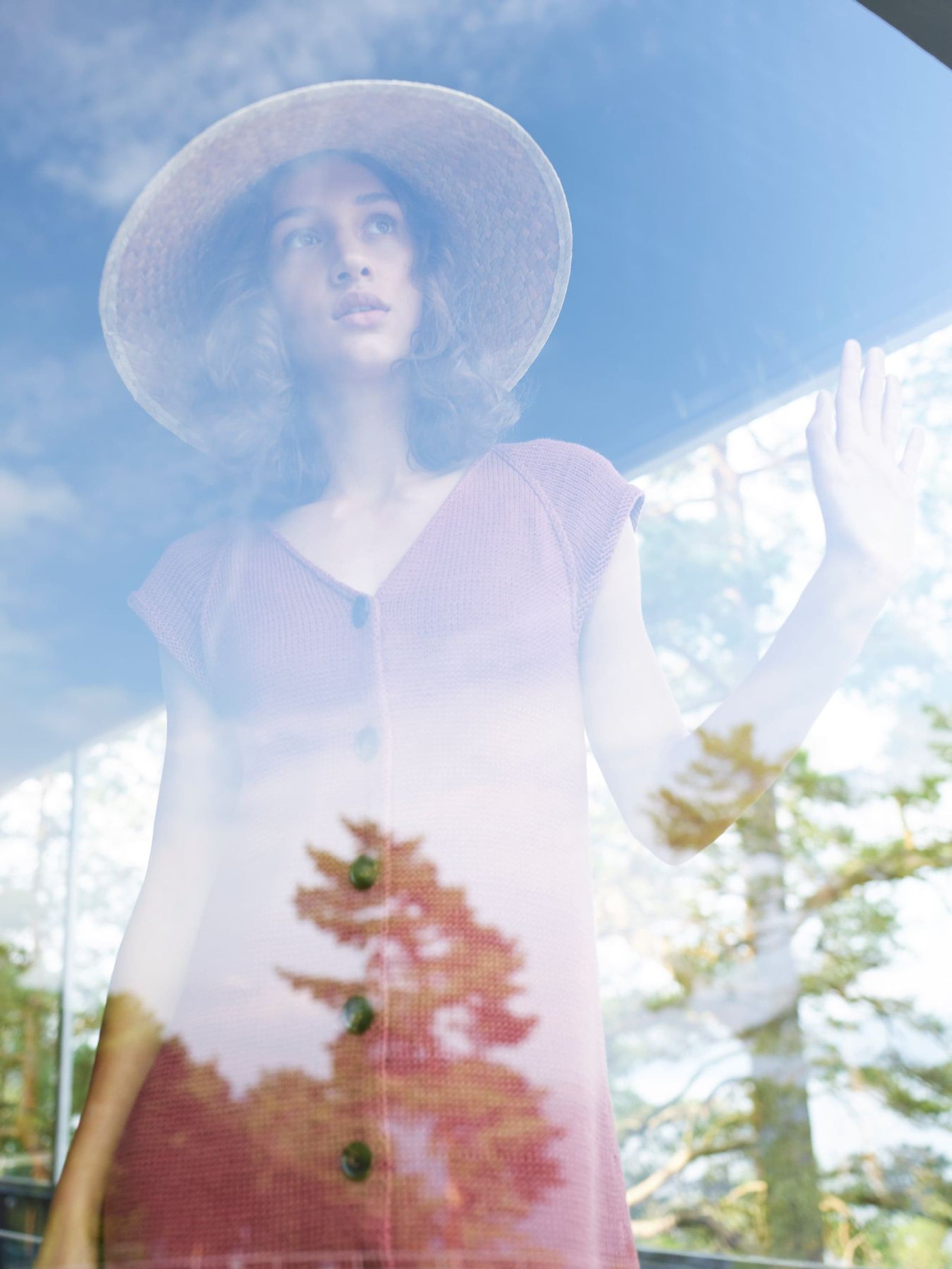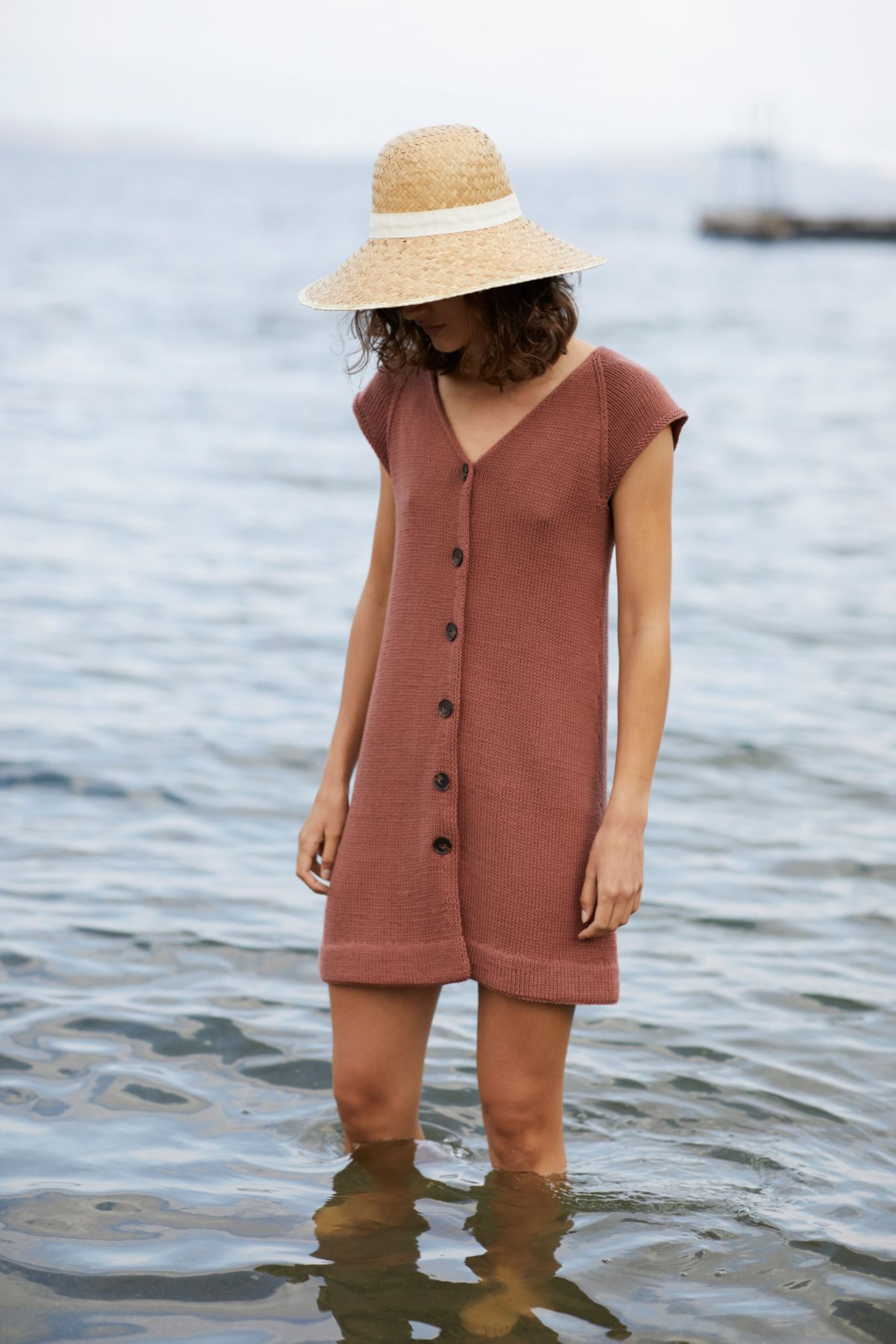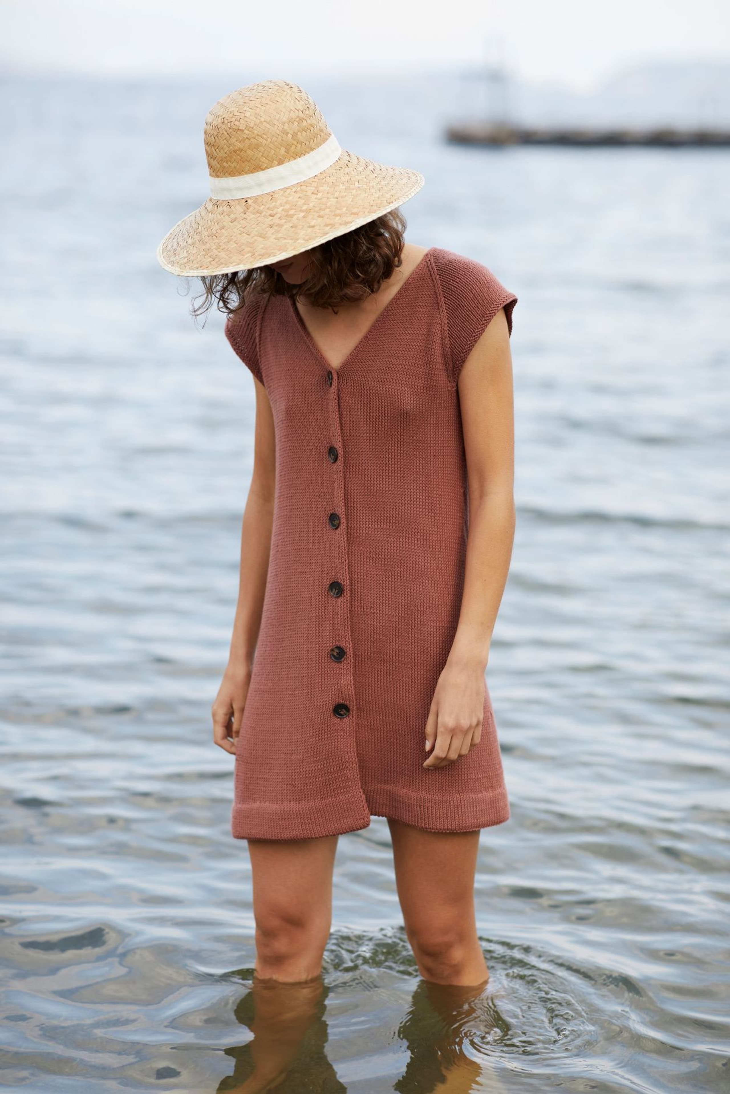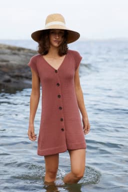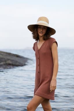 Kjole med v-hals, korte ermer og raglanfelling. Den strikkes frem og tilbake nedenfra og opp. Den har åpning foran med knapper. Knapphullene lages oppover etter hvert, derfor er det lett å regulere avstanden mellom knapphullene. Ønskes kjolen lengre, må lengden mellom knapphullene tilpasses og det må beregnes mer garn. Kjolen har en tenkt bevegelsesvidde på 8 cm.