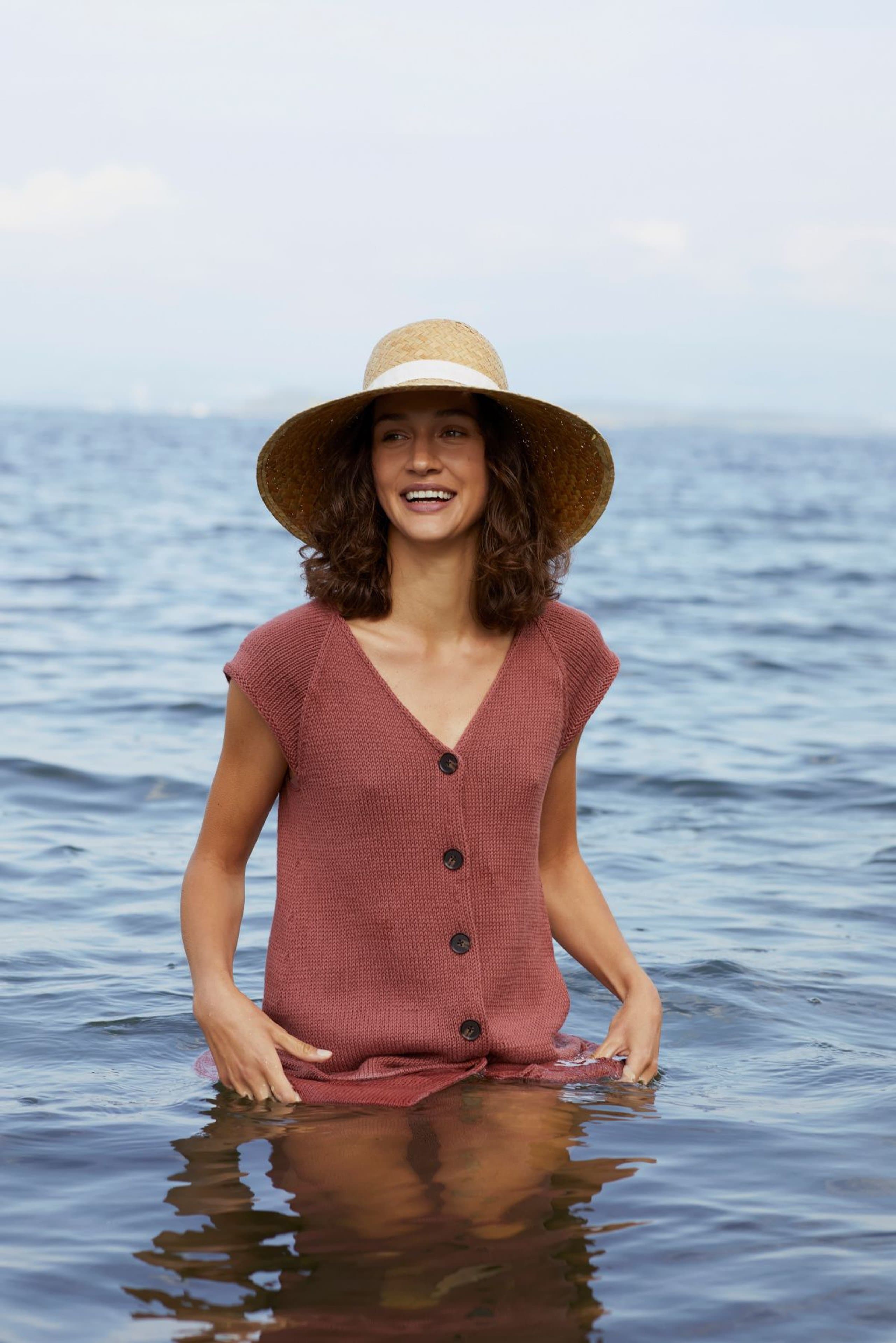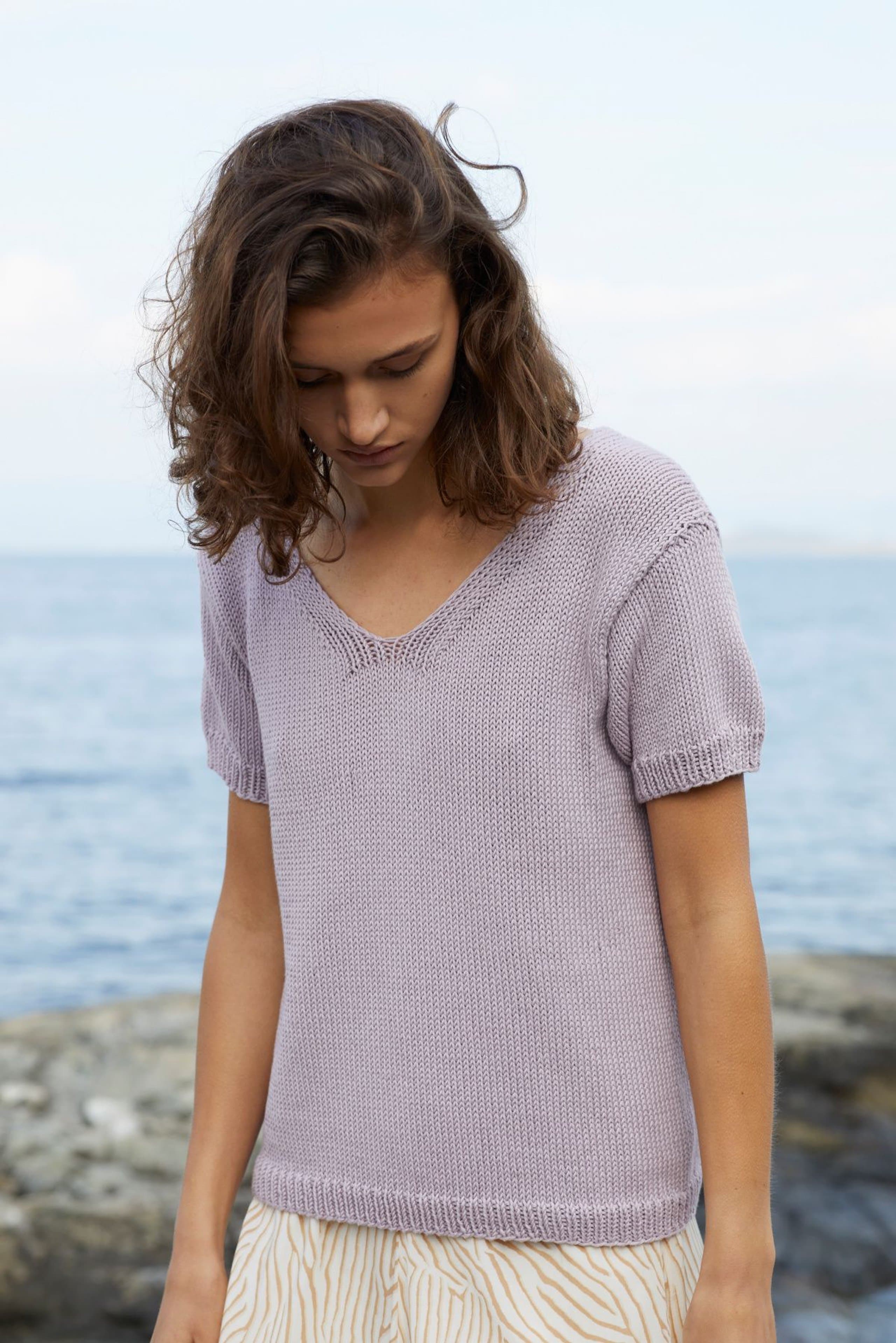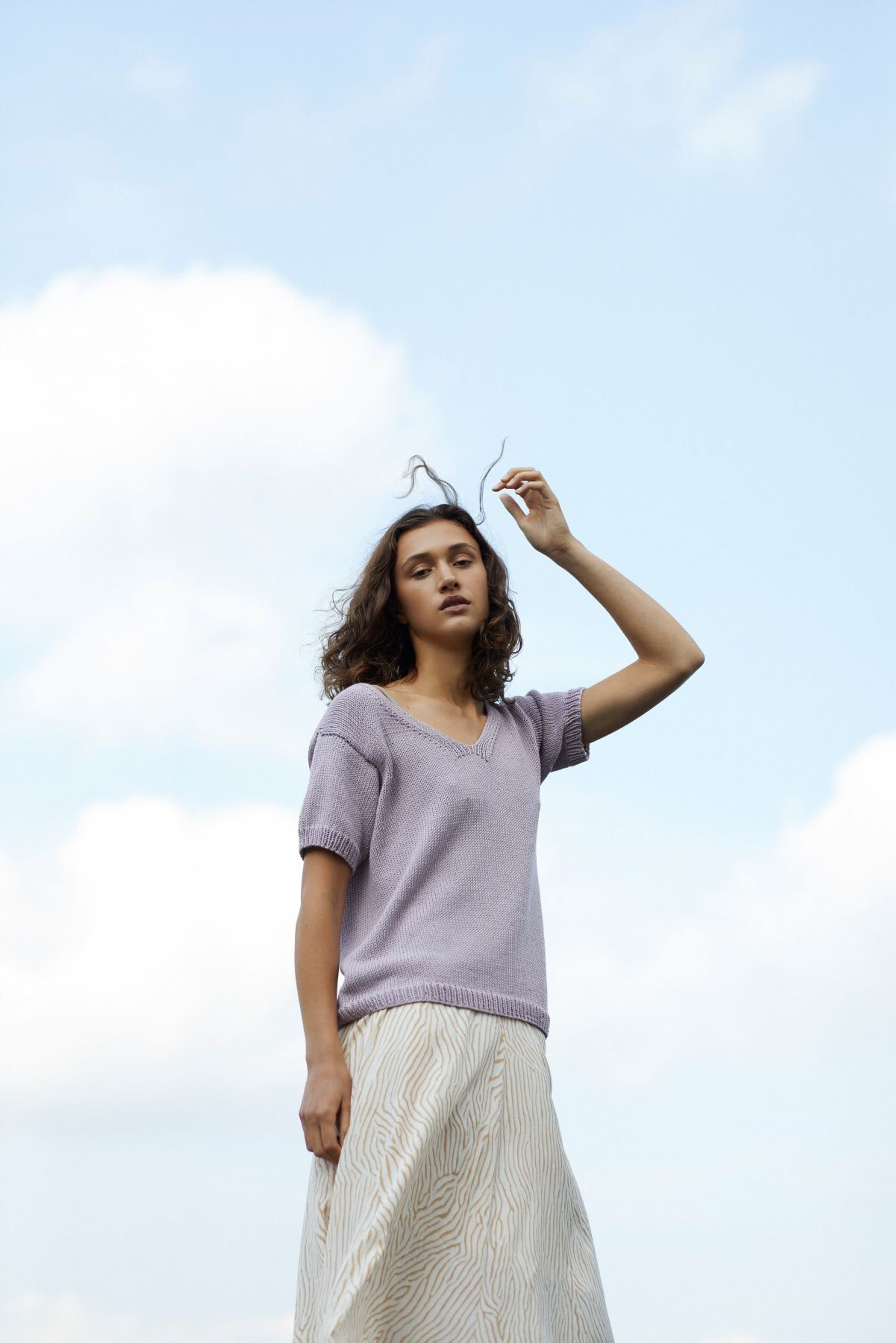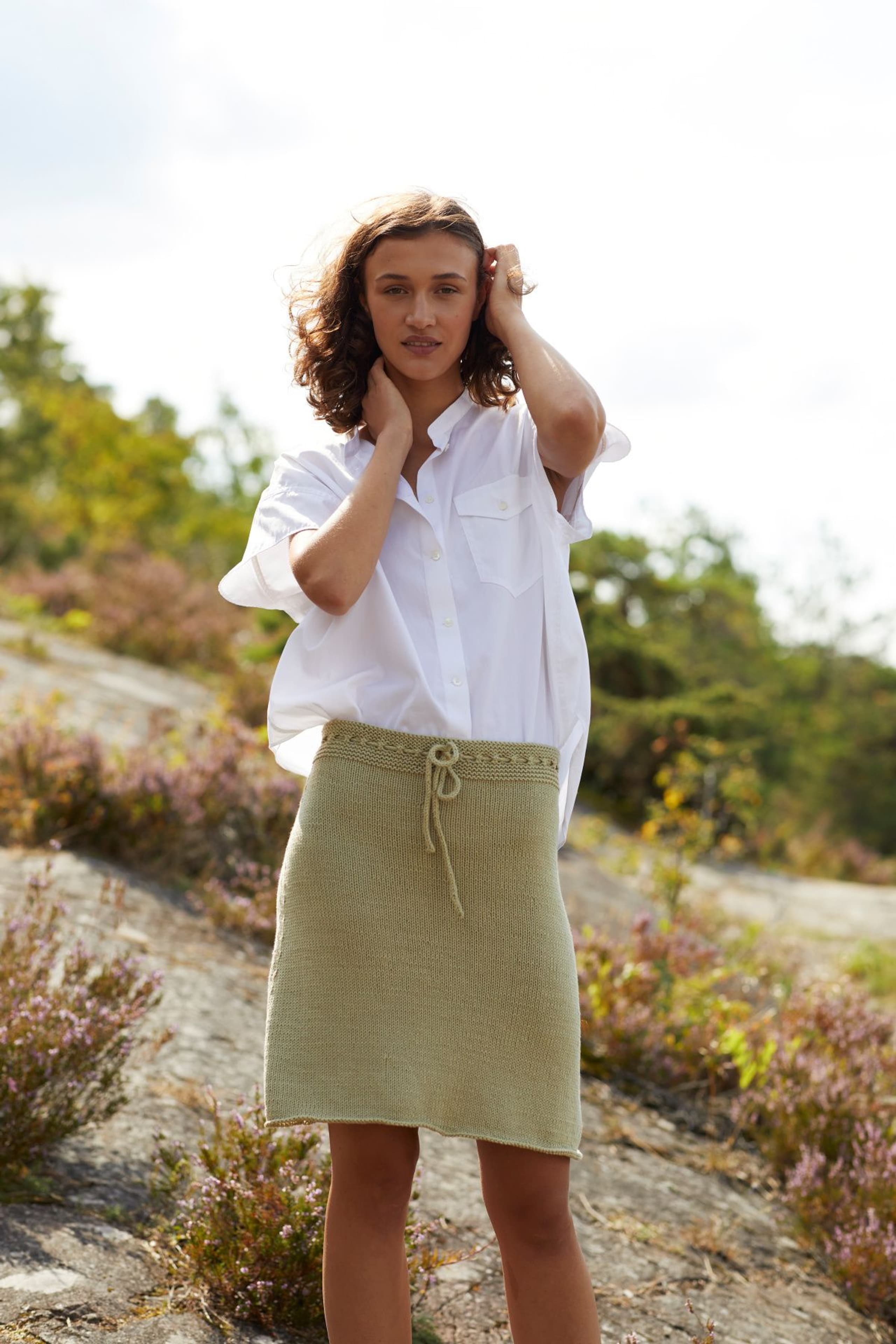 Kjole med v-hals, korte ermer og raglanfelling. Den strikkes frem og tilbake nedenfra og opp. Den har åpning foran med knapper. Knapphullene lages oppover etter hvert, derfor er det lett å regulere avstanden mellom knapphullene. Ønskes kjolen lengre, må lengden mellom knapphullene tilpasses og det må beregnes mer garn. Kjolen har en tenkt bevegelsesvidde på 8 cm.