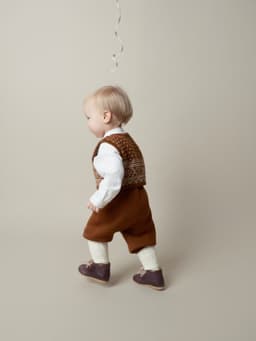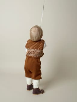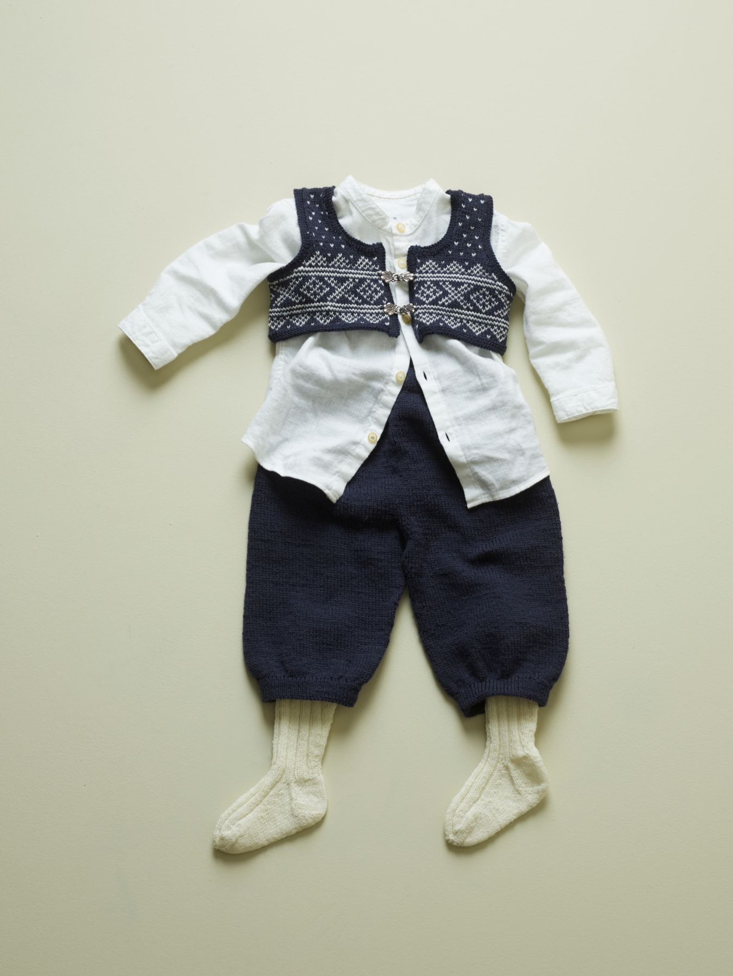 Vesten strikkes rundt nedenfra og opp, med åpning foran. Åpningen foran syes og klippes opp før forkantene strikkes på. Vesten lukkes med hekter. **Tilbehør**: 2 sett tinnhekter, Gry nr 40.