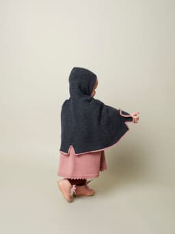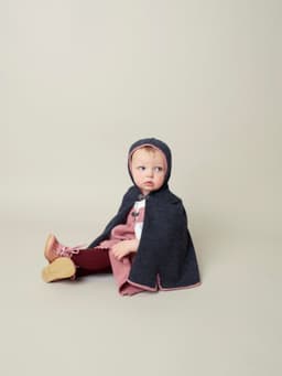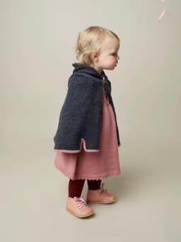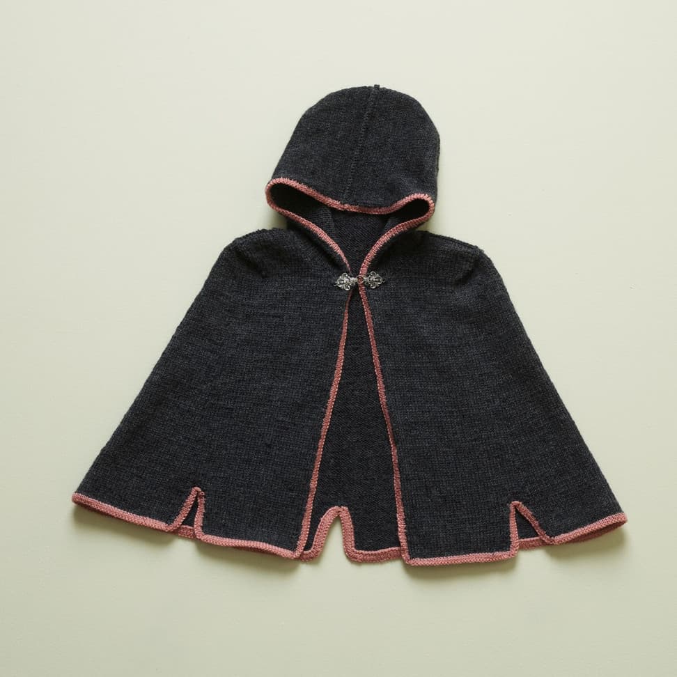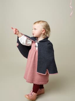 Capen strikkes frem og tilbake nedenfra og opp. Den har tre splitter nederst, to foran og en midt bak. Hetten og kantene strikkes på til slutt. Den lukkes foran med hekter i halskanten. 1 sett tinnhekter, Laila nr 50