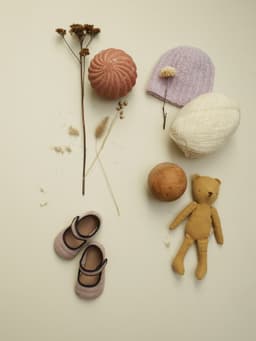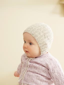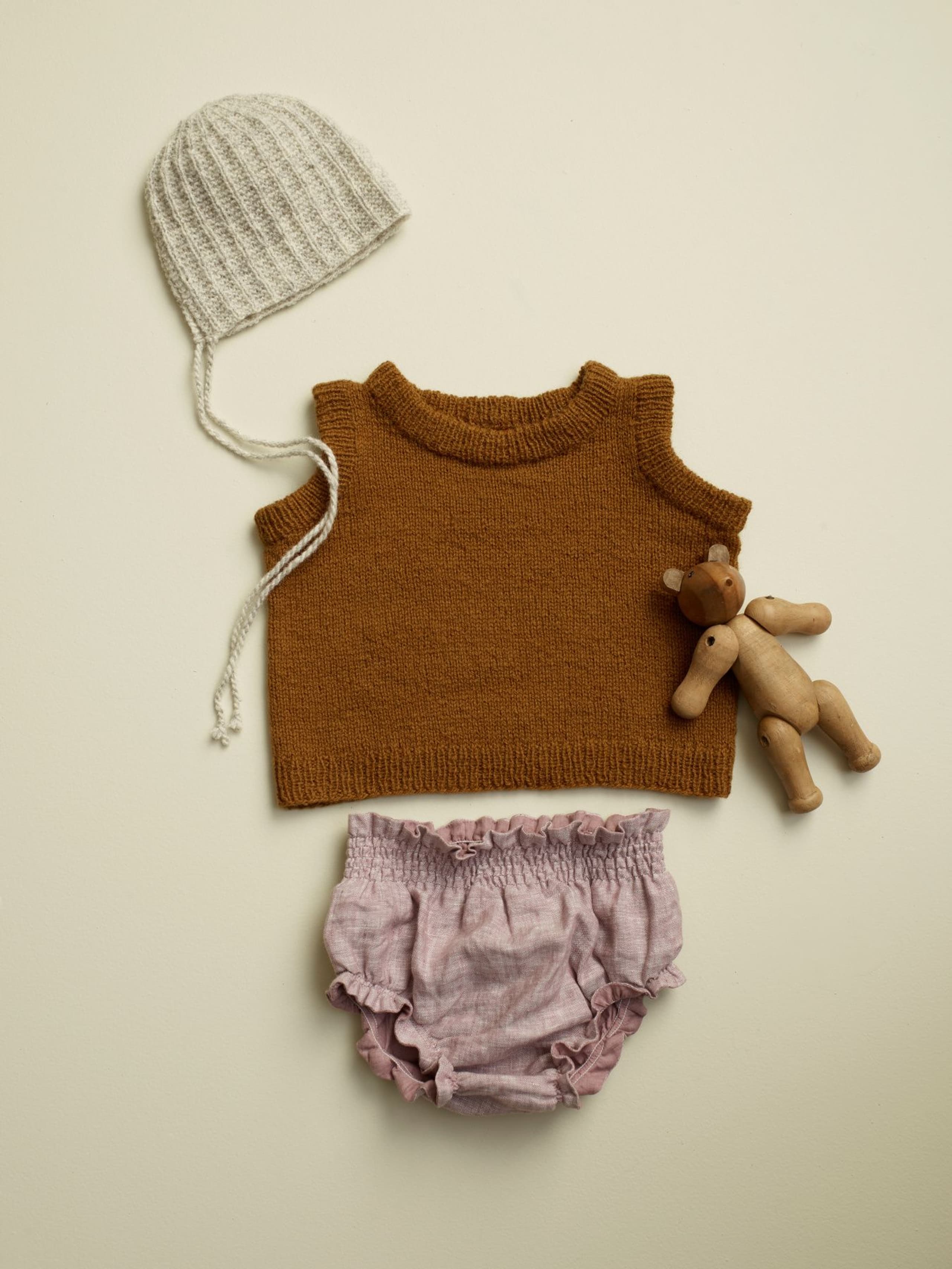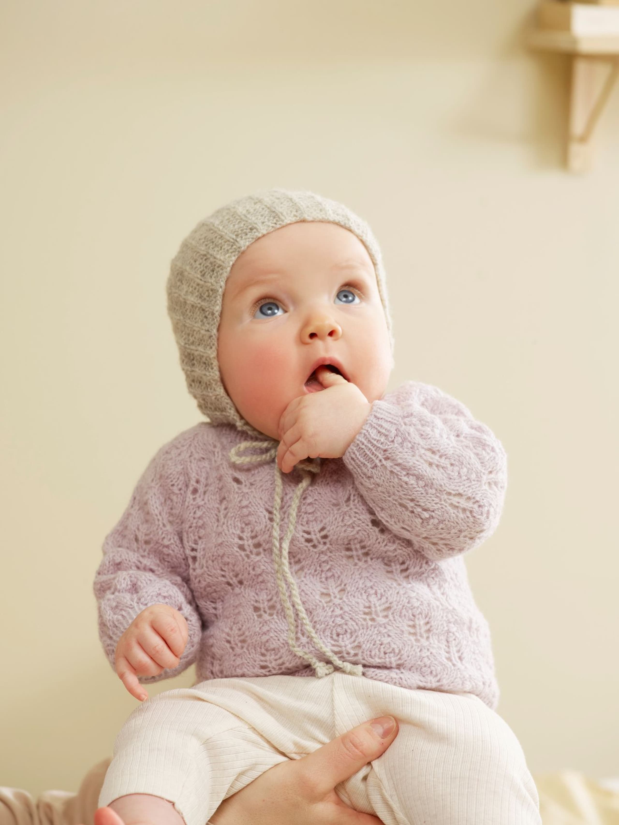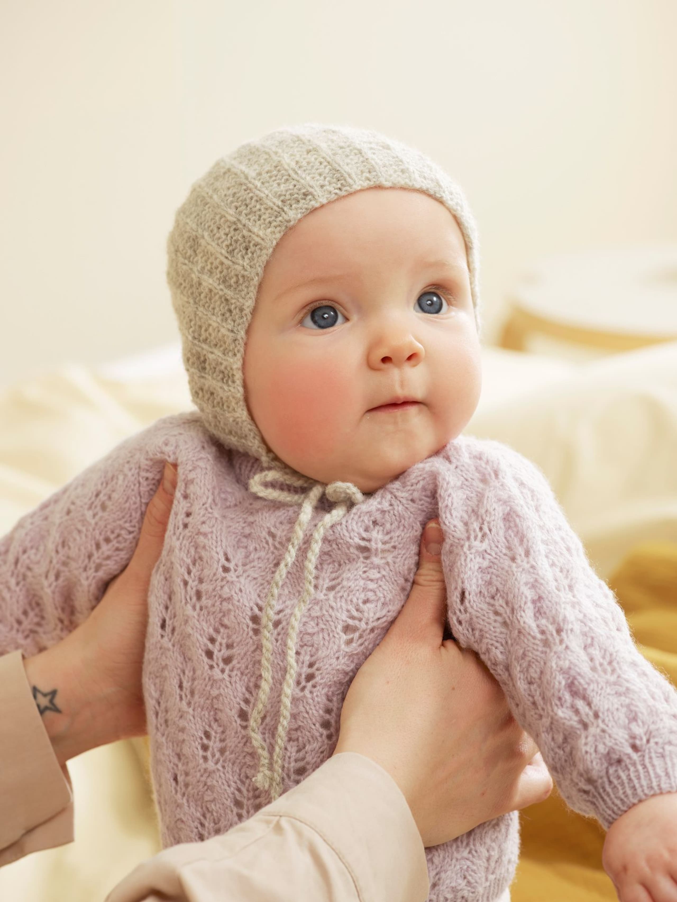 Lerkelue er en enkel rillestrikket kyse med glattstrikkete striper langs bremmen.