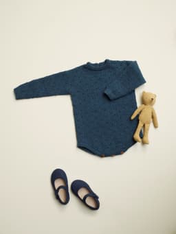 Duebodyen har et lett hullmønster over hele bodyen. Den er strikket nedenfra og opp, med raglan. For- og bakstykket strikkes hver for seg før de strikkes sammen. Det er knepping mellom bena og splitt med knapp i nakken.