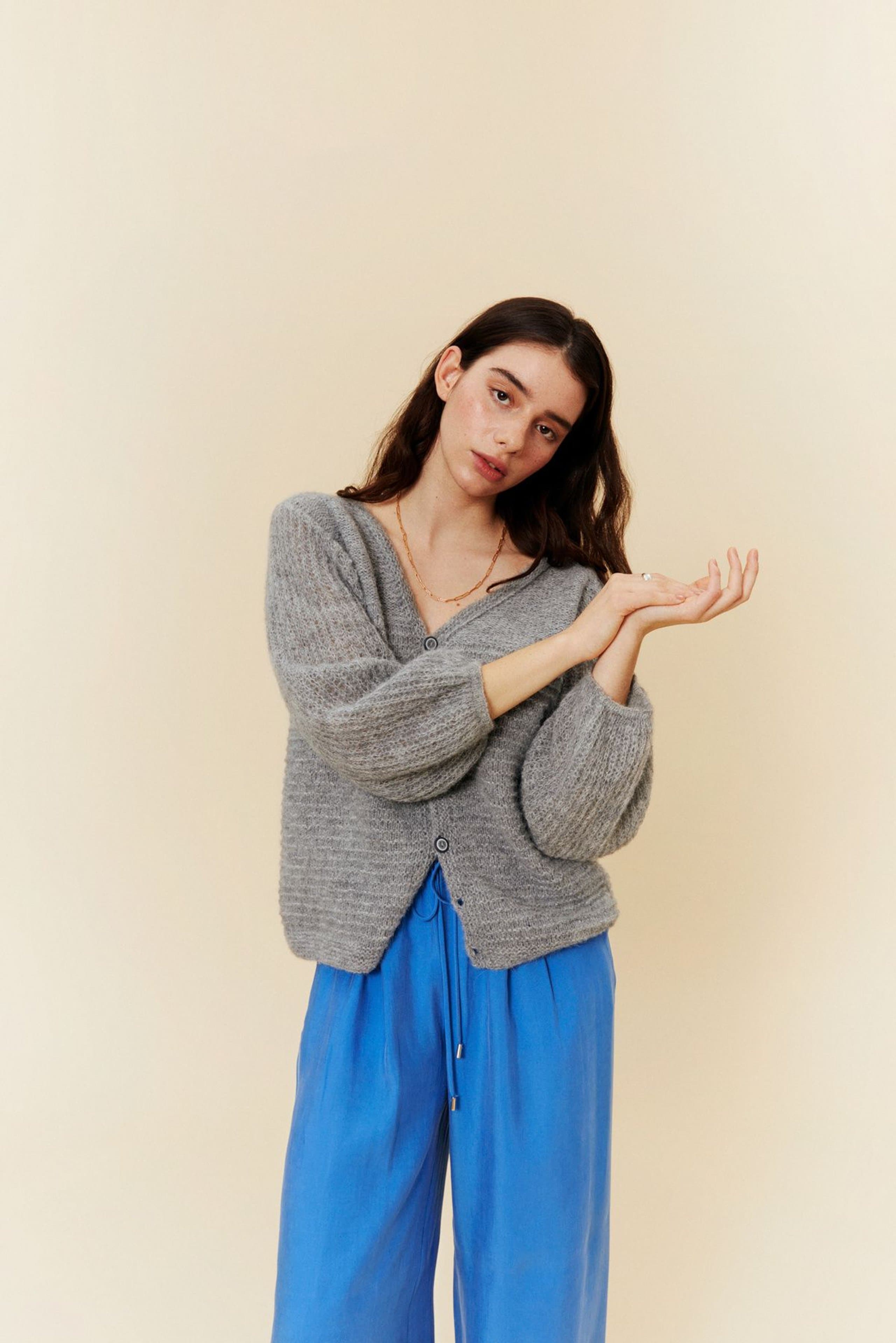 Jakke strikket med dobbel tråd i rillestrikk nederst på bol og glattstrikk øverst med vrange eller rette masker ut. Ermene er strikket med enkel tråd og i patentmønster. Alle delene er strikket frem og tilbake fra nede og opp. Ermene er sydd i til slutt, med små rynker øverst. Jakken har en tenkt bevegelsesvidde på 10 cm.