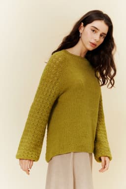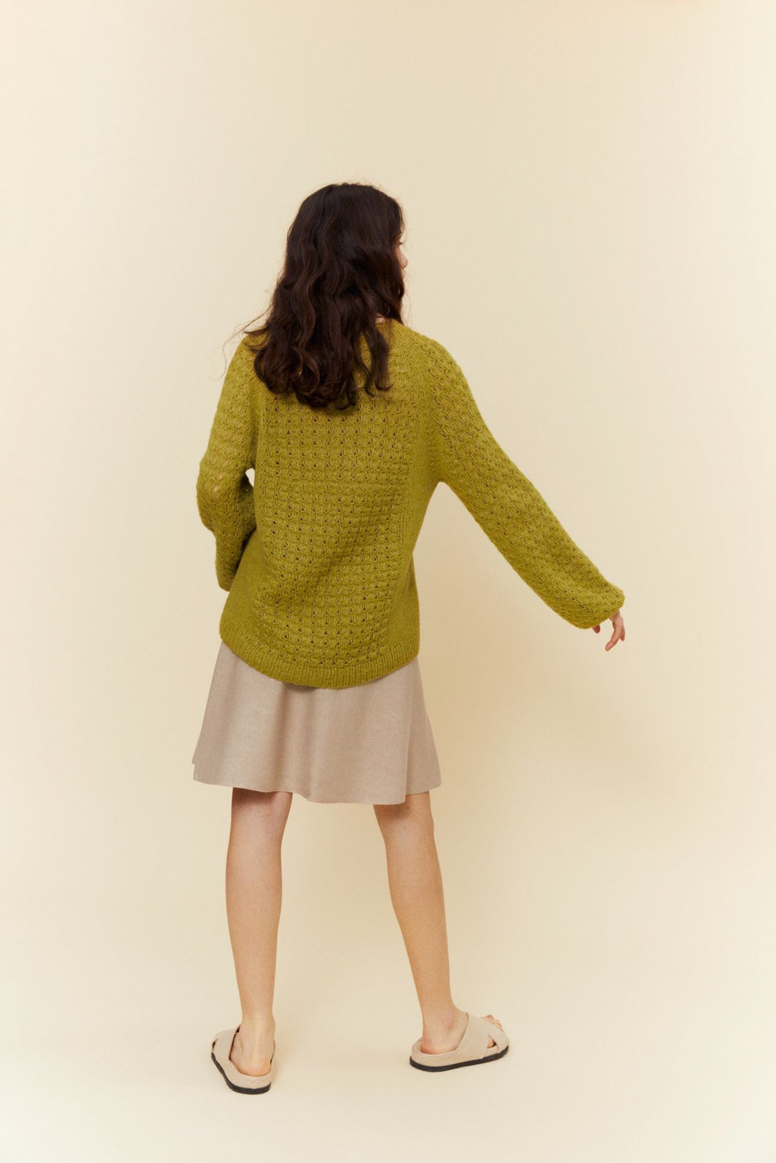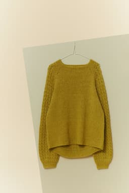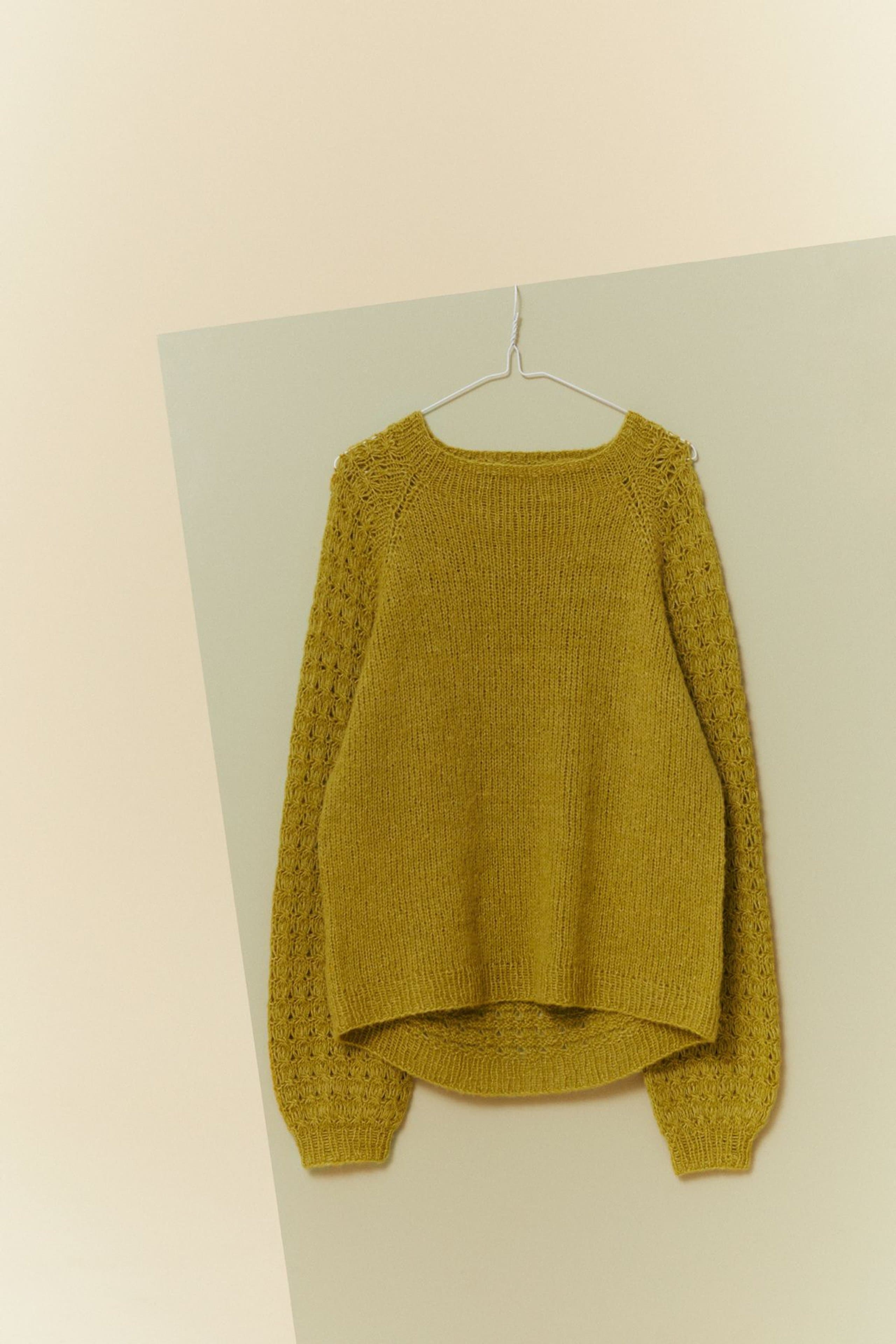 Hele genseren strikkes med to tråder. Den strikkes rundt ovenfra og ned, med mønster på hvert erme og midt bak på bakstykket. Mønsteret bygger litt mer i høyden, enn med glattstrikk. Derfor vil genseren bli lengre bak enn foran, ta derfor mål på hel lengdepå forstykket. Genseren har en tenkt bevegelsesvidde på 8 cm.