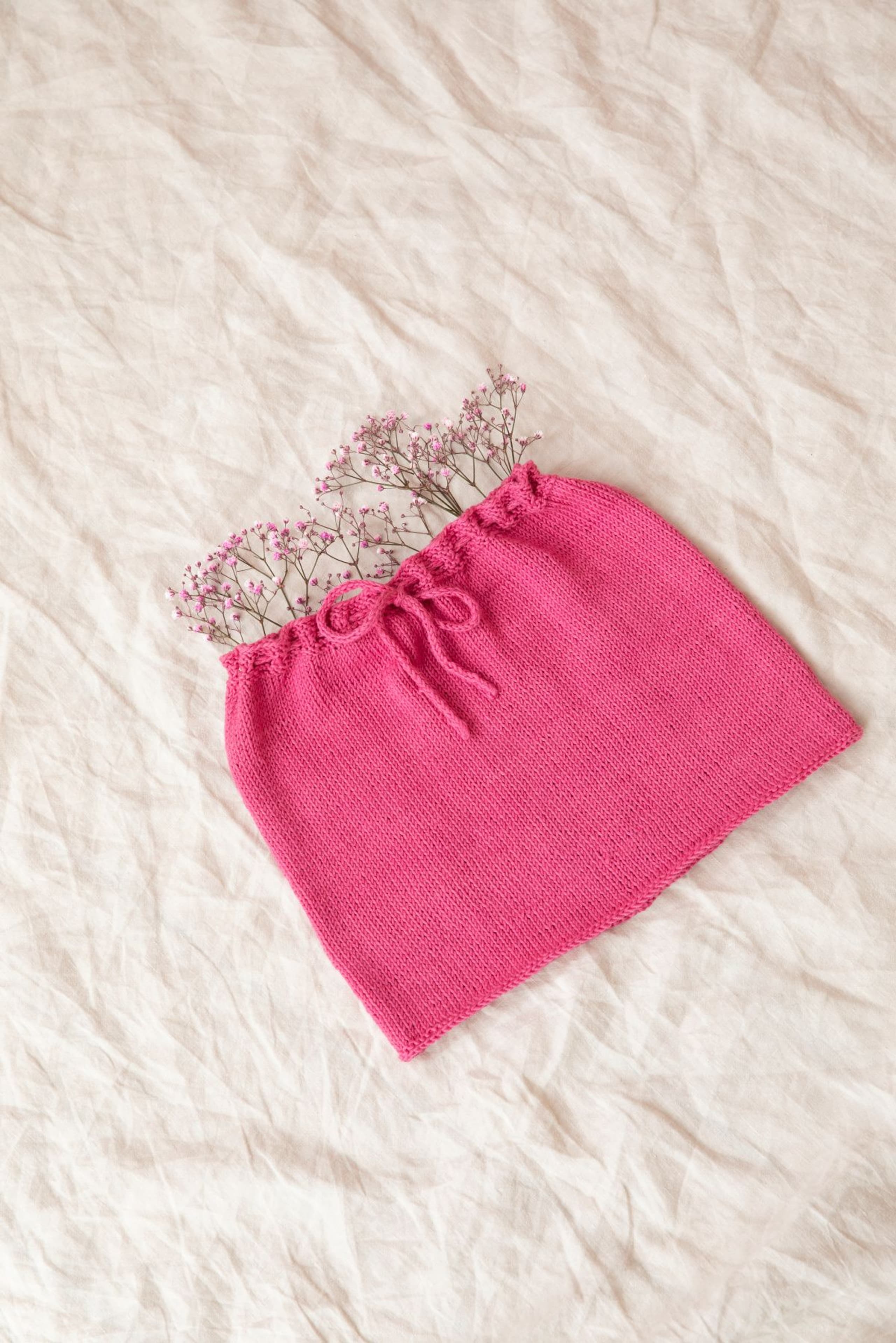 Skjørtet strikkes ovenfra og ned med riller i livet og glattstrikk videre. Skjørtet kan enkelt strikkes lengre eller kortere. Det har en strikket snor til knytting i livet.