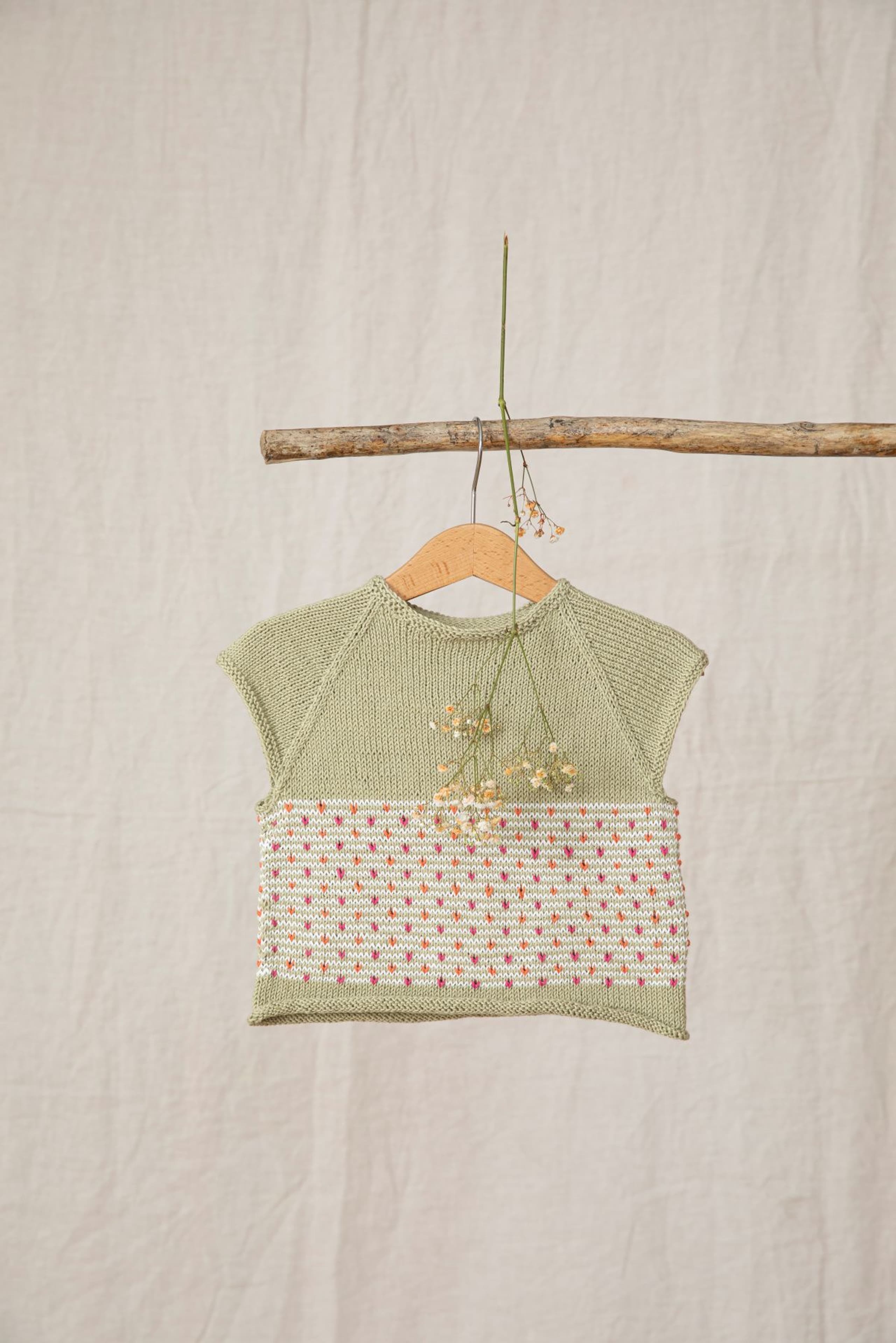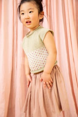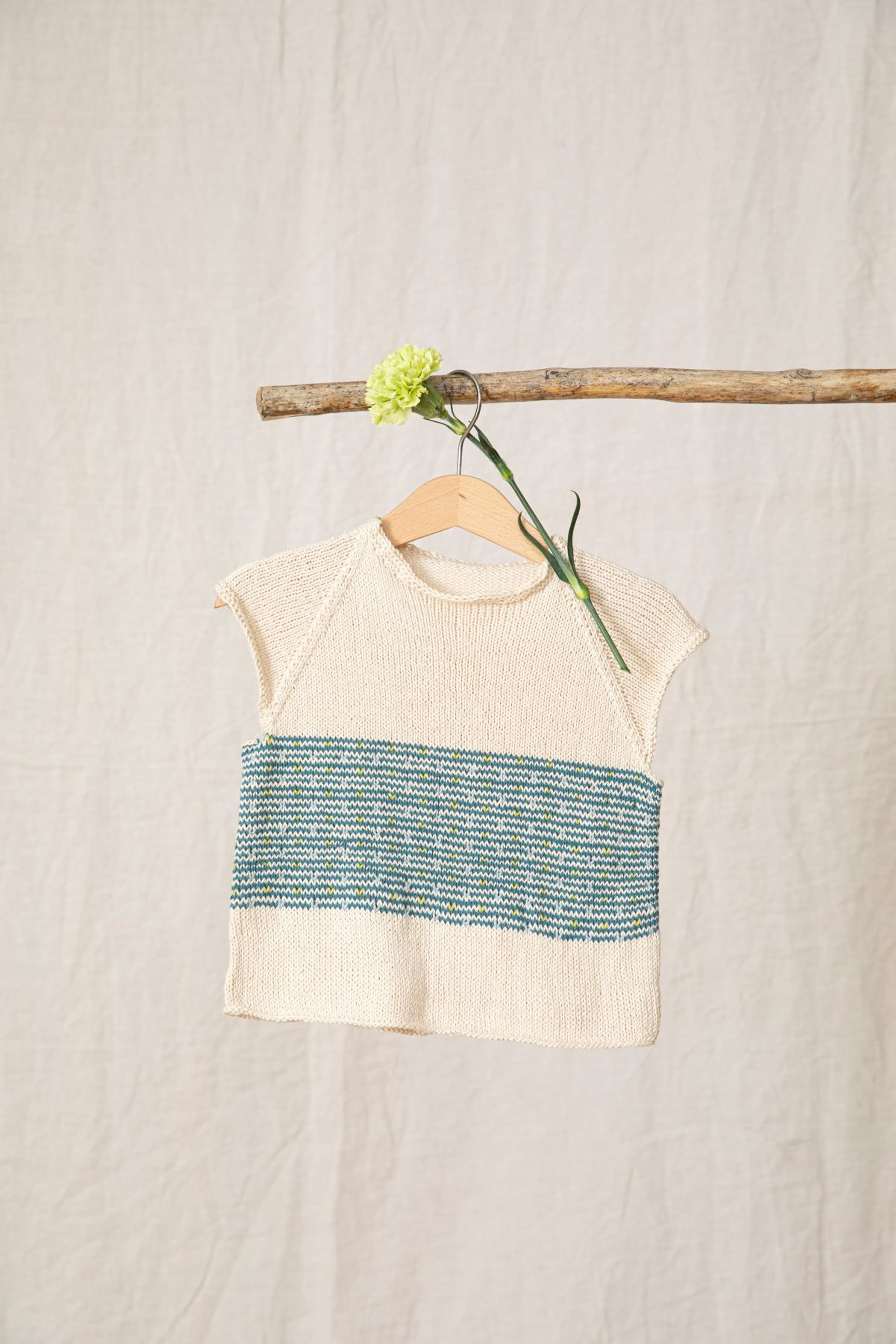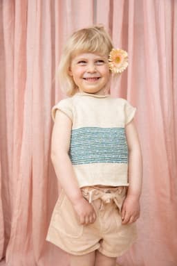 Toppen strikkes nedenfra og opp, og har mønster nederst på bolen. Den har korte ermer med raglanfelling og en liten avrunding i halsen. Toppen har en tenkt bevegelsesvidde på 5 cm.