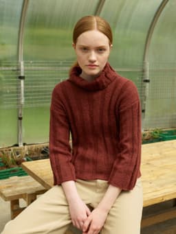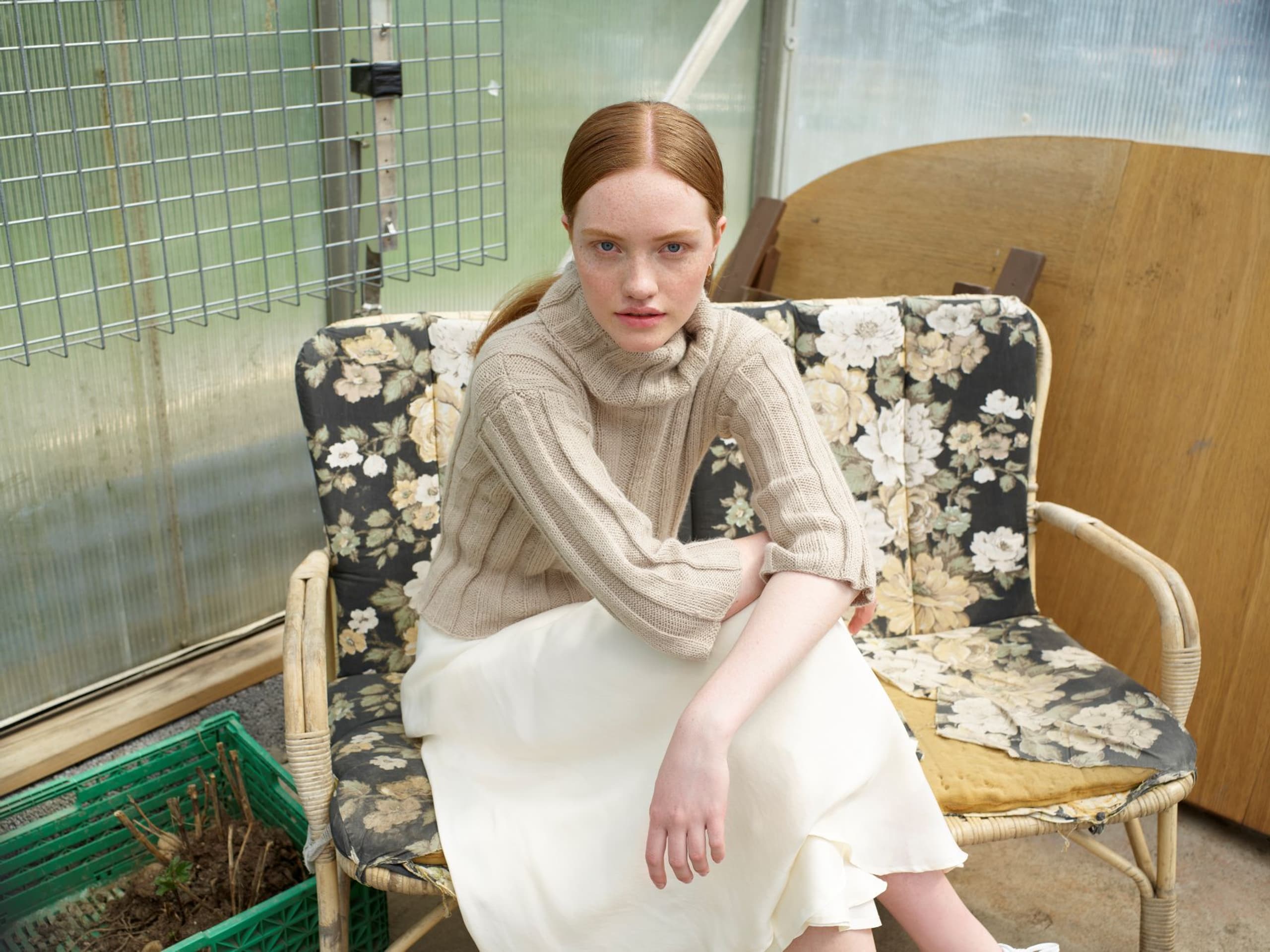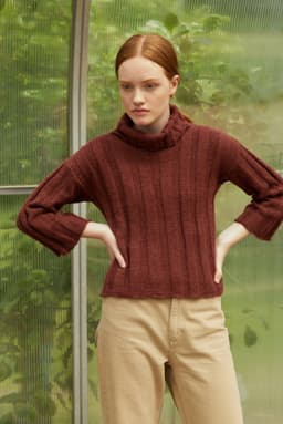 Vår i lufta-genseren er en ribbestrikket genser med høy hals, strikket nedenfra og opp. Genseren har en kort passform med litt vide, og trekvartlange ermer som gir den et vårlig preg. Ermene strikkes ved å plukke opp m rundt ermehullet og strikke nedover. På denne måten kan du justere ermets lengde etter behov. Ønsker du lengre genser er det enkelt å strikke bolen litt lengre før det felles til ermehull. Pass i så fall på å beregne litt ekstra garn.
