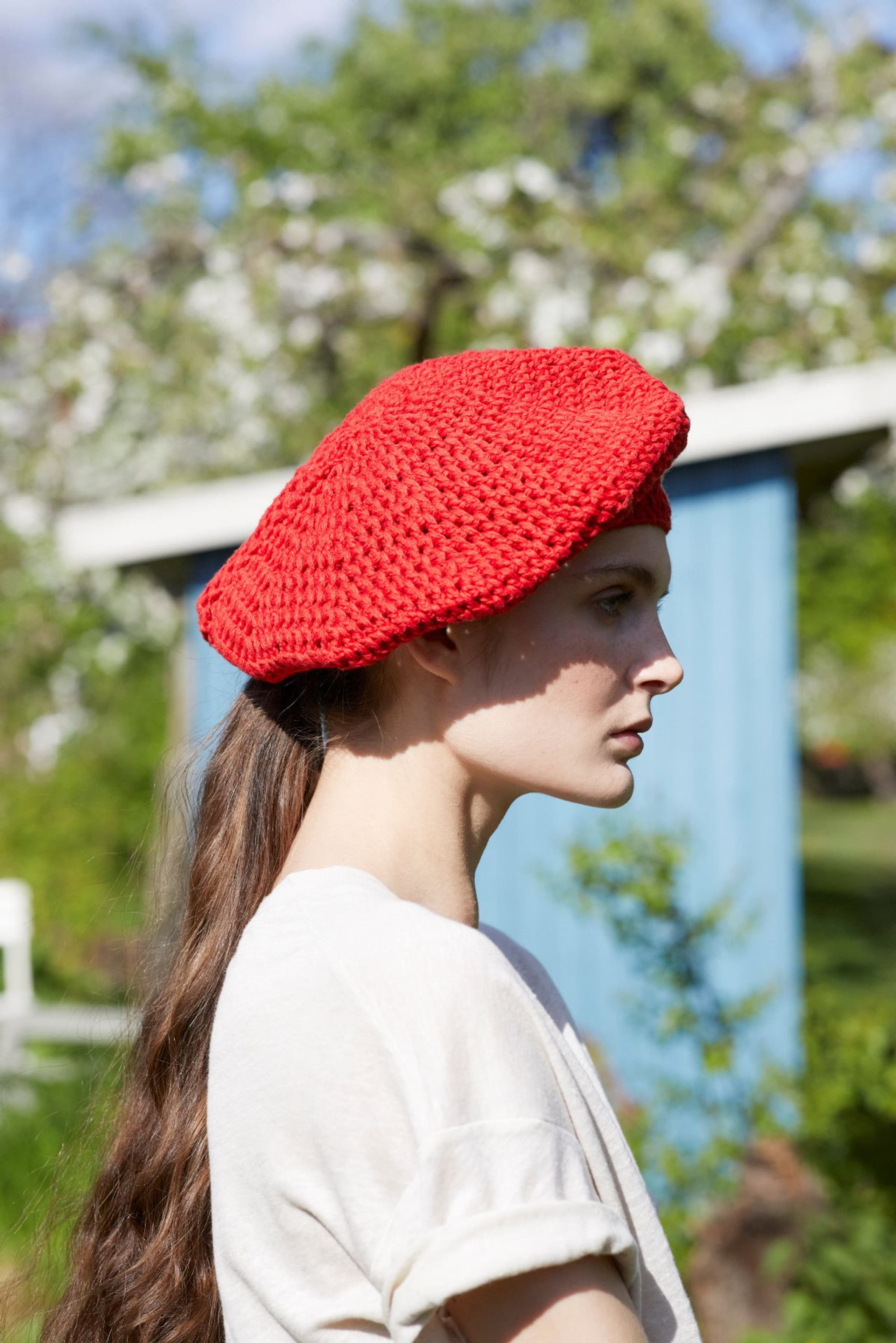 Hatten hekles ovenfra og ned med dobbel tråd.
