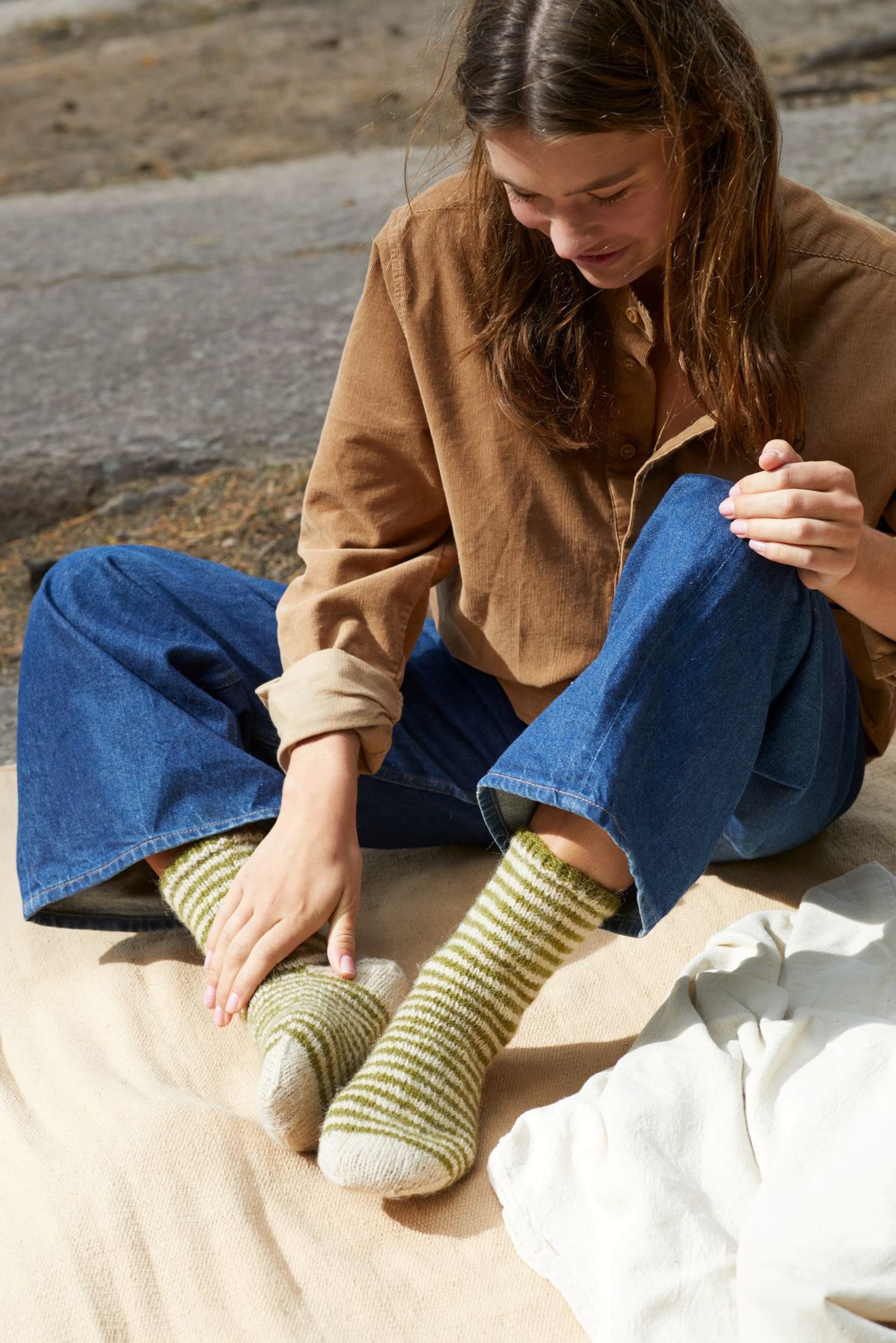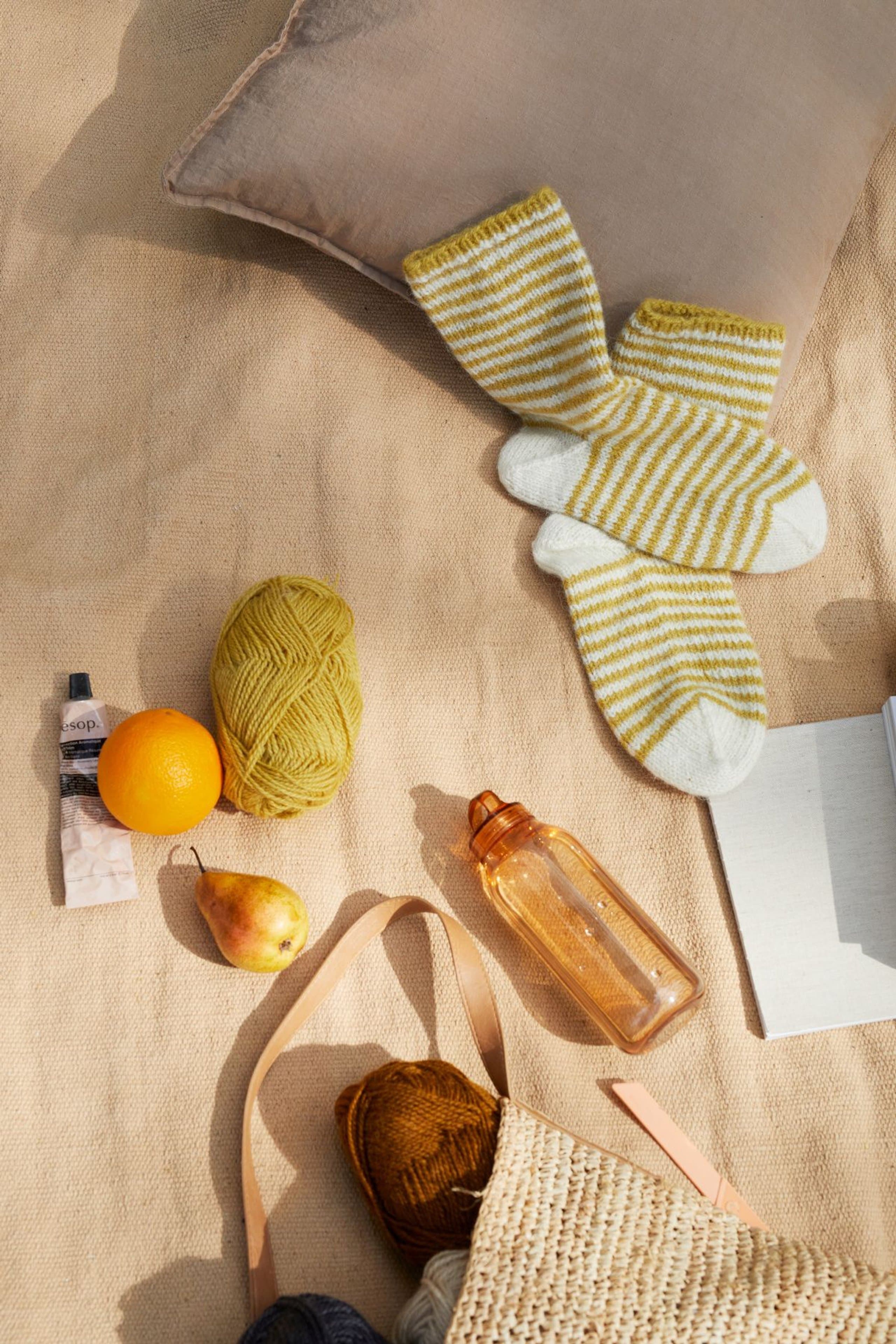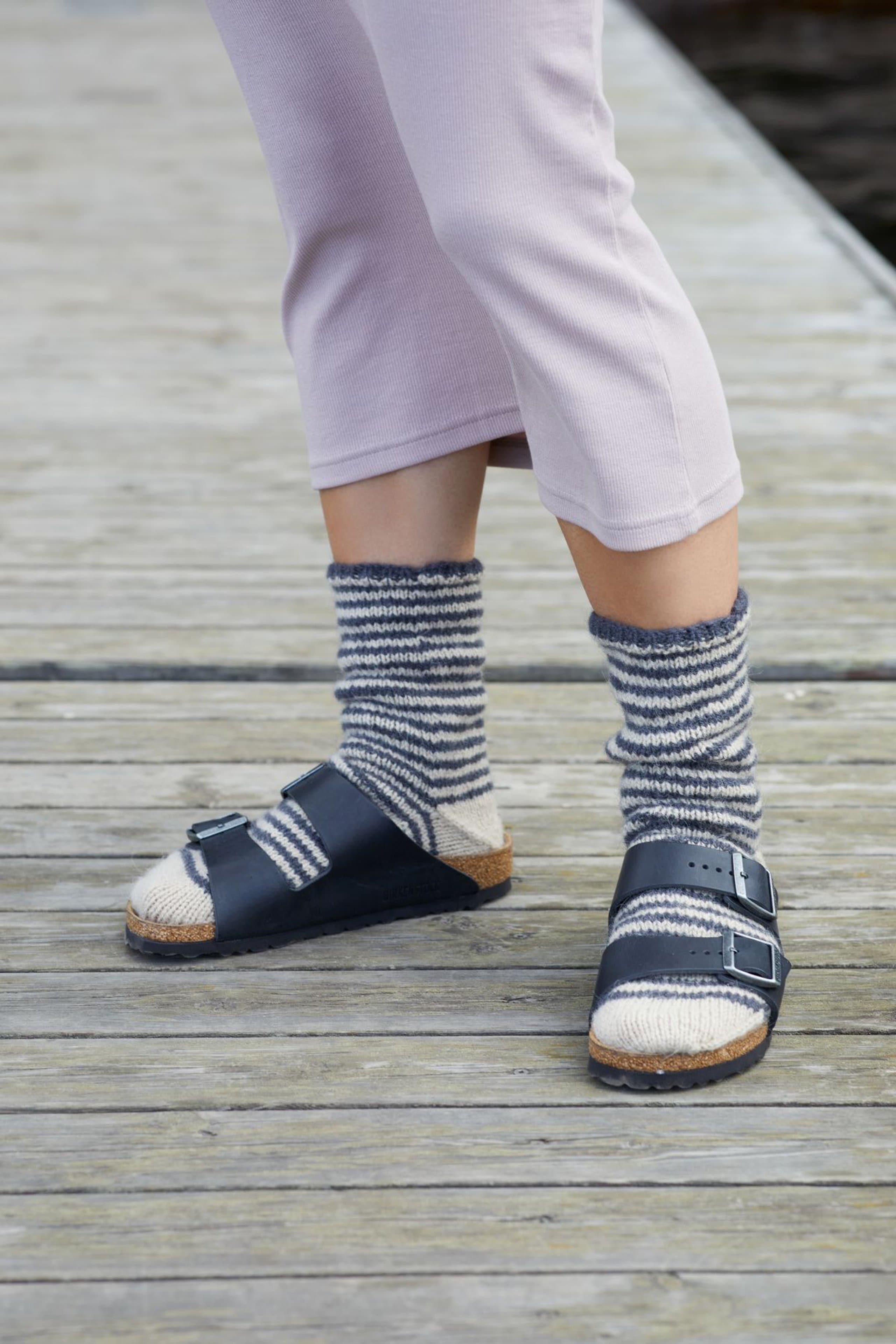 Neversokkene er strikket fra skaftet og ned til tåen, uten å strikke hælen, som strikkes helt til sist. Det strikkes inn en hjelpetråd der hælen skal være før man strikker foten videre. Deretter trekkes hjelpetråden ut, maskene settes på pinnene og hælen felles på samme måte som tå.
