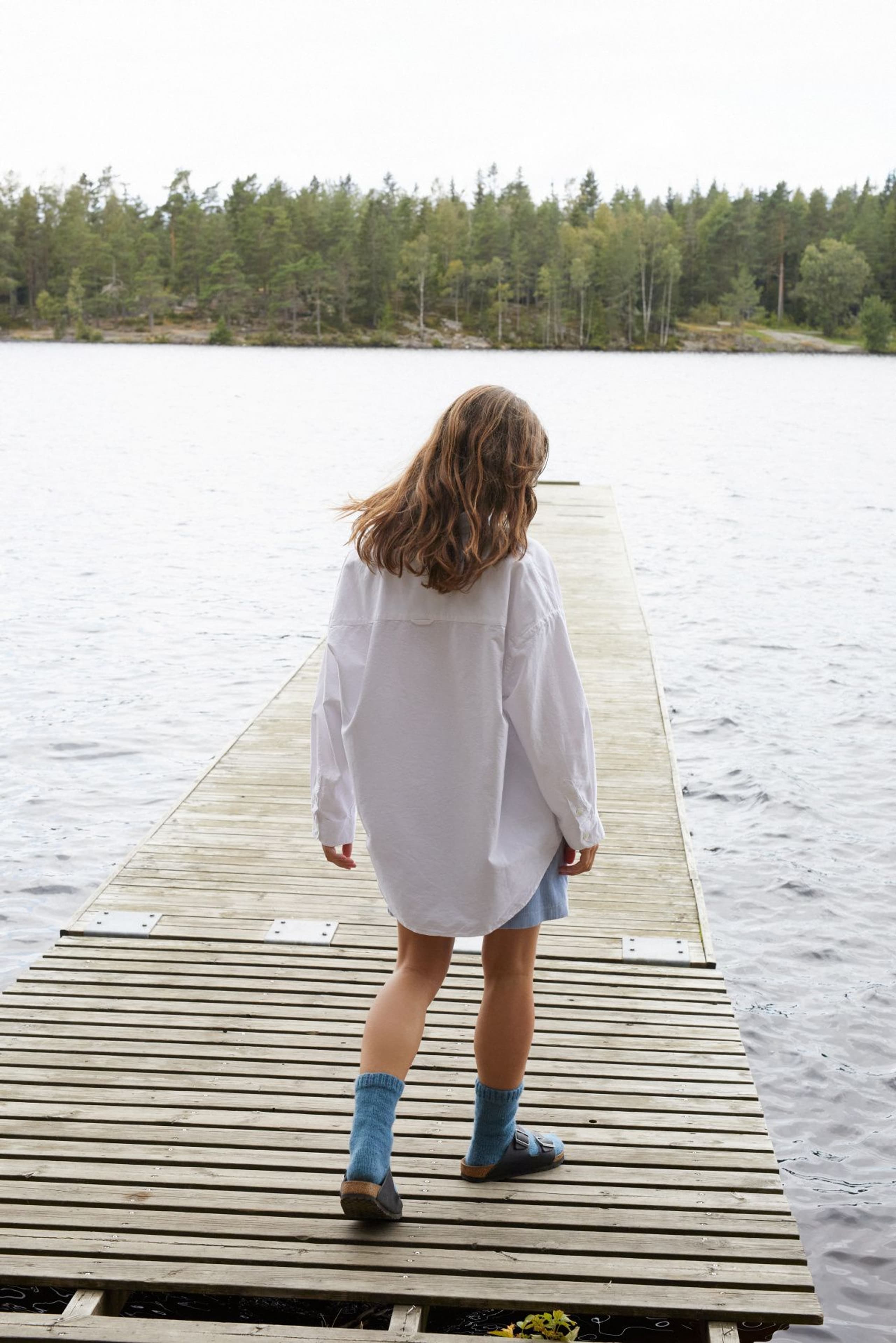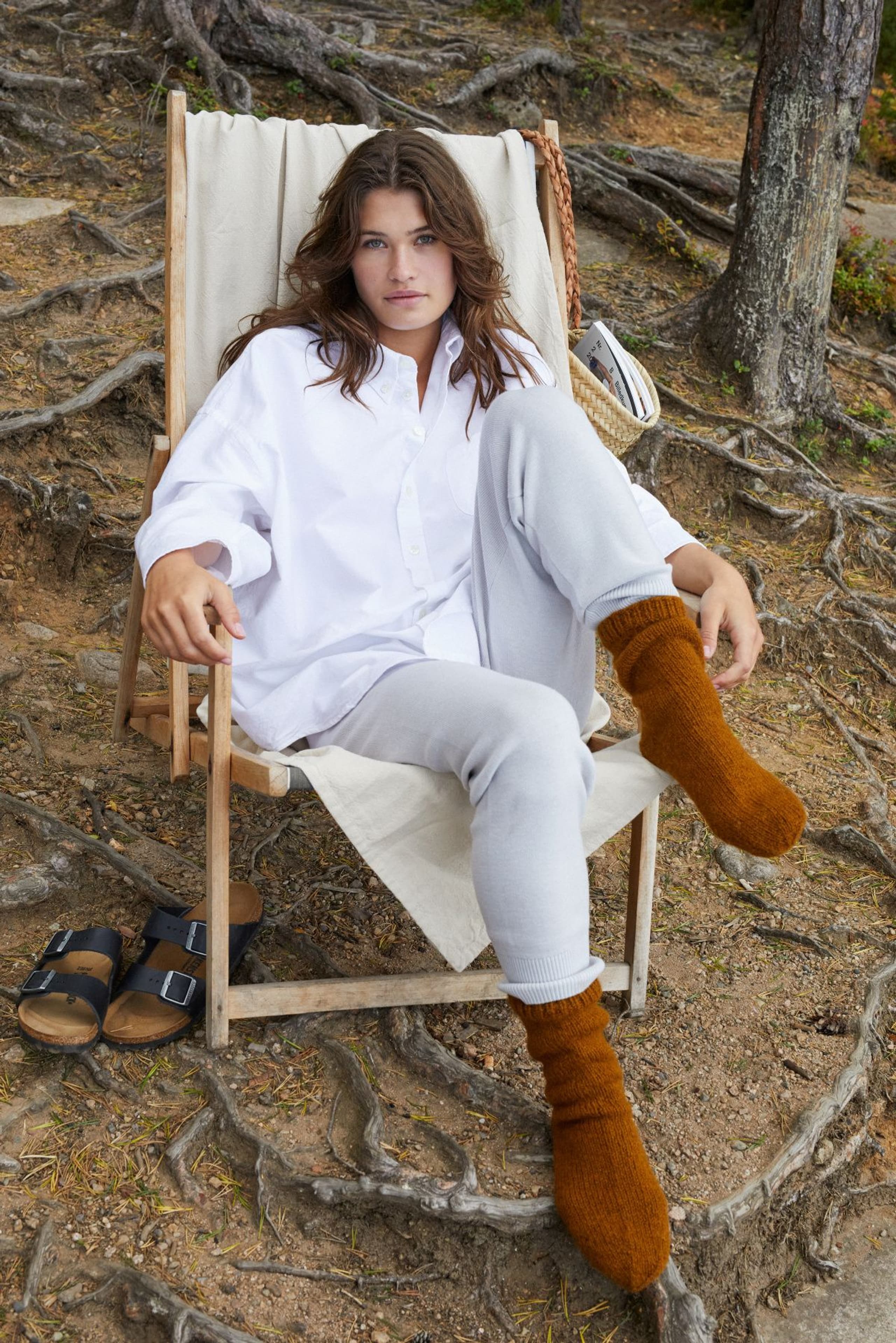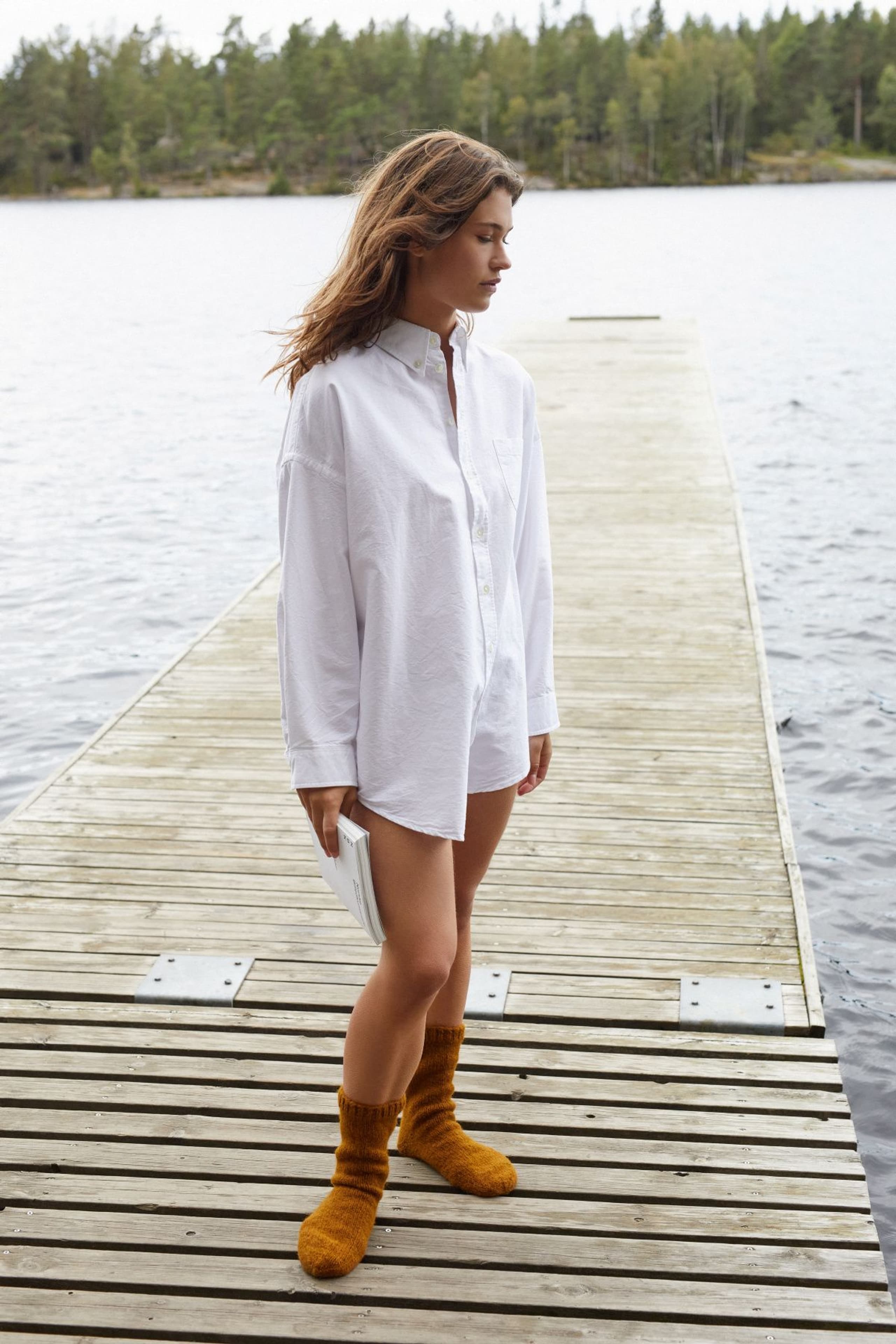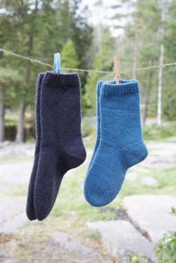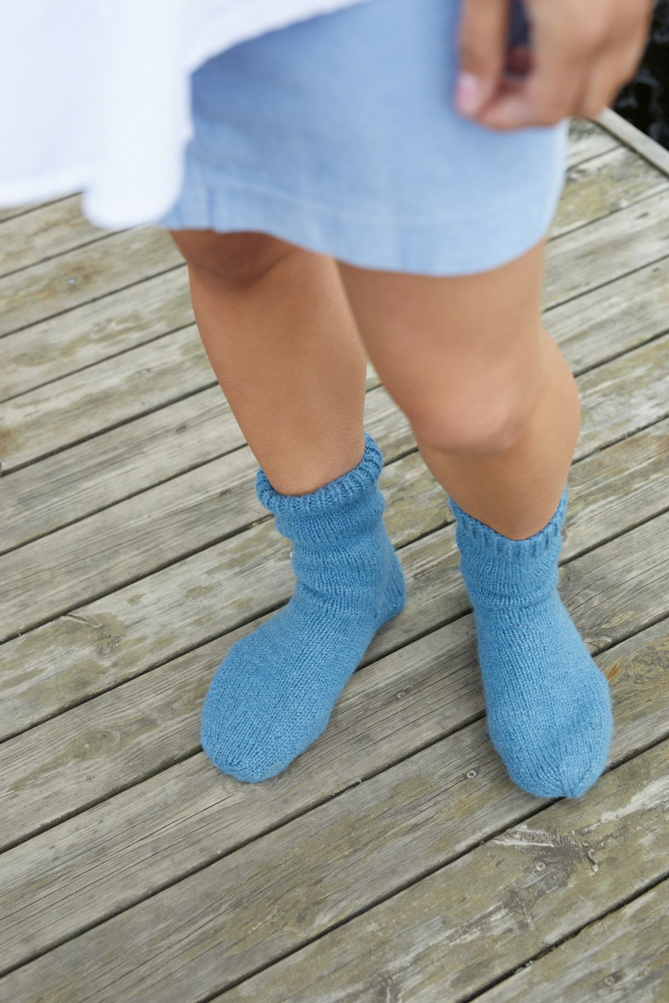 Denne sokken erstrikket fra skaftet og ned. Hele sokken er glattstrikket, foruten en kort vrangbord øverst på skaftet. Hælen kan man strikke med tyske vendepinner, eller snu akkurat slik du foretrekker selv.