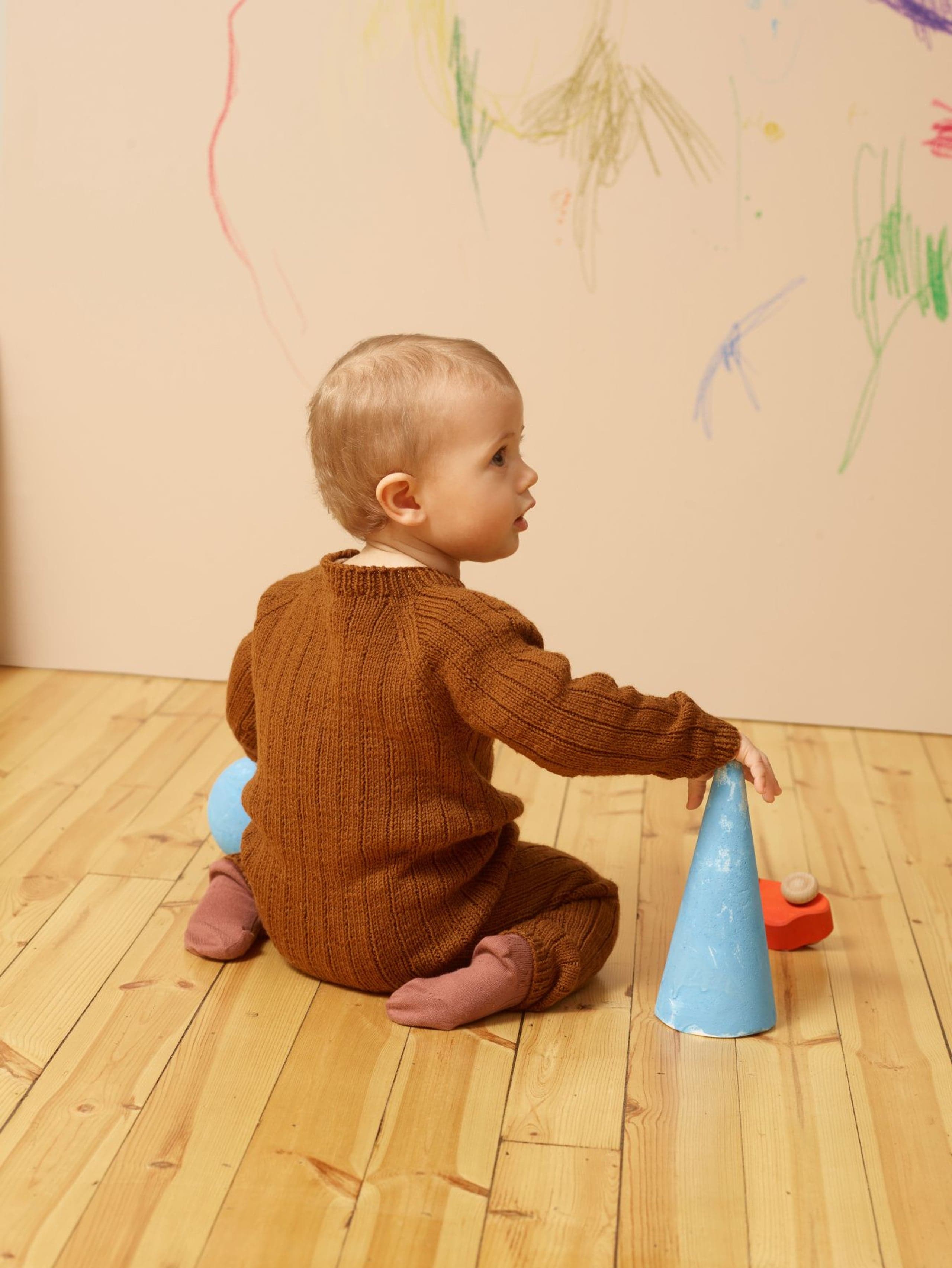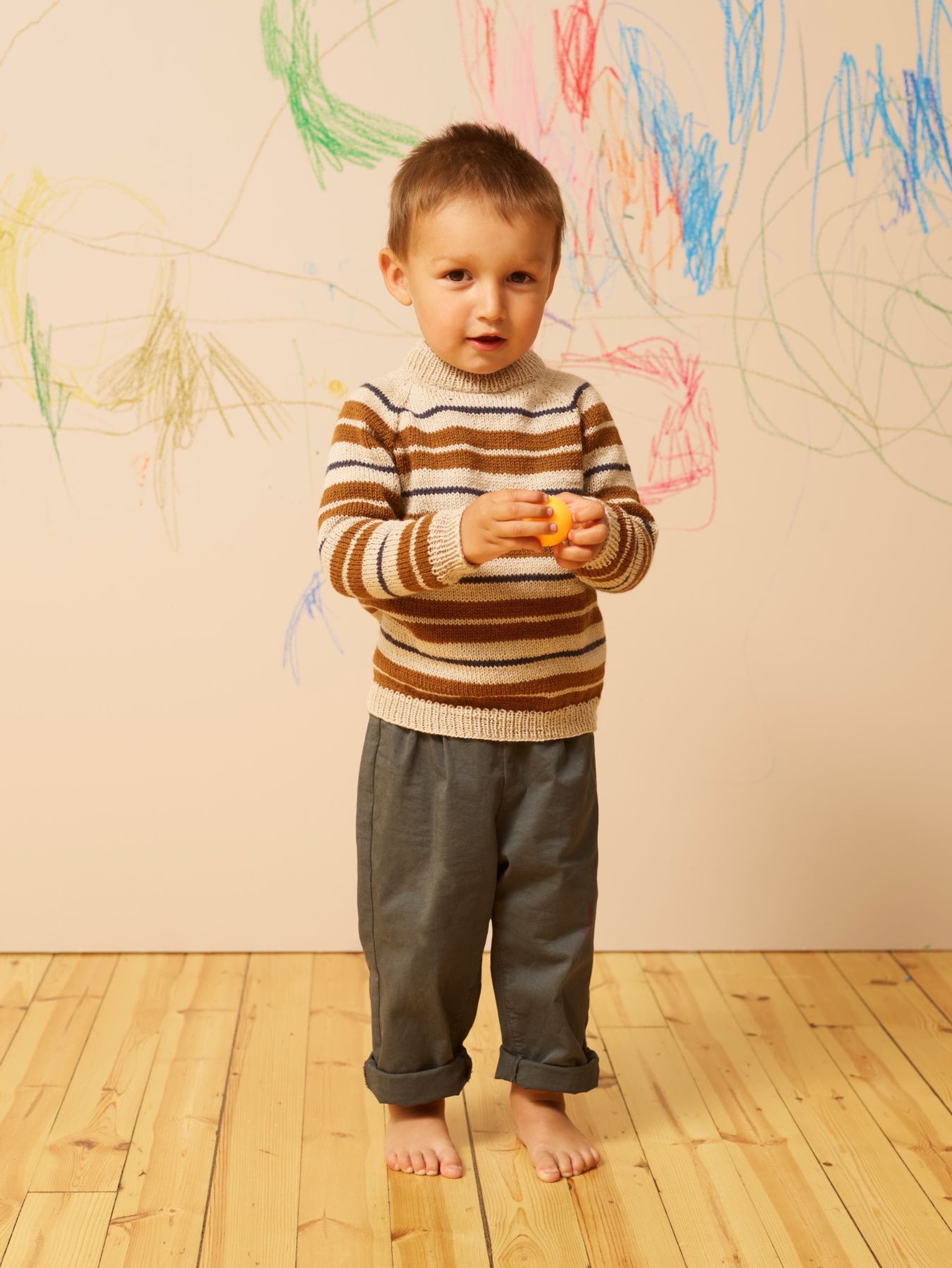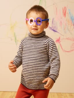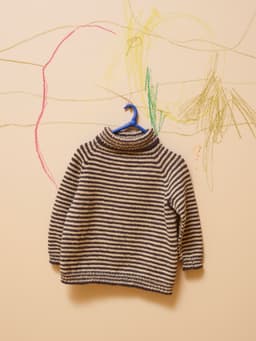 Charlie høyhalser strikkes ovenfra og ned med stripemønster og raglanøkinger på bærestykket. I str 3 mnd, 6-9 mnd og 1 år kan man gjerne velge rund hals i stedet for høy hals.