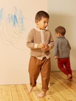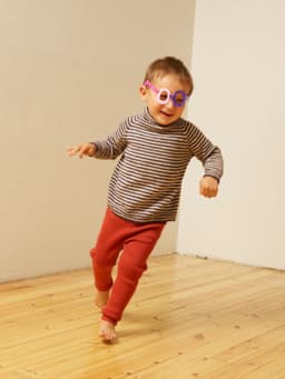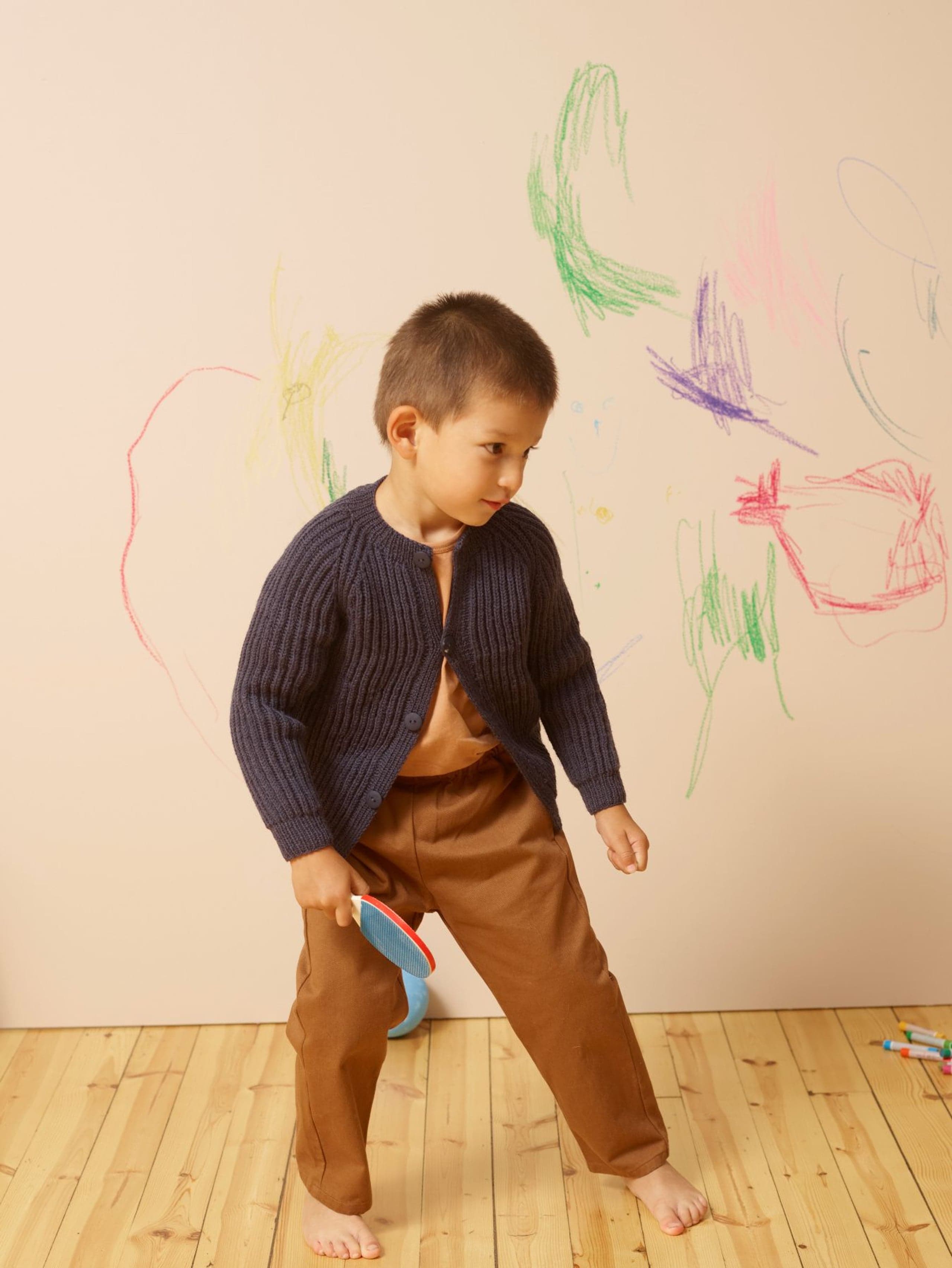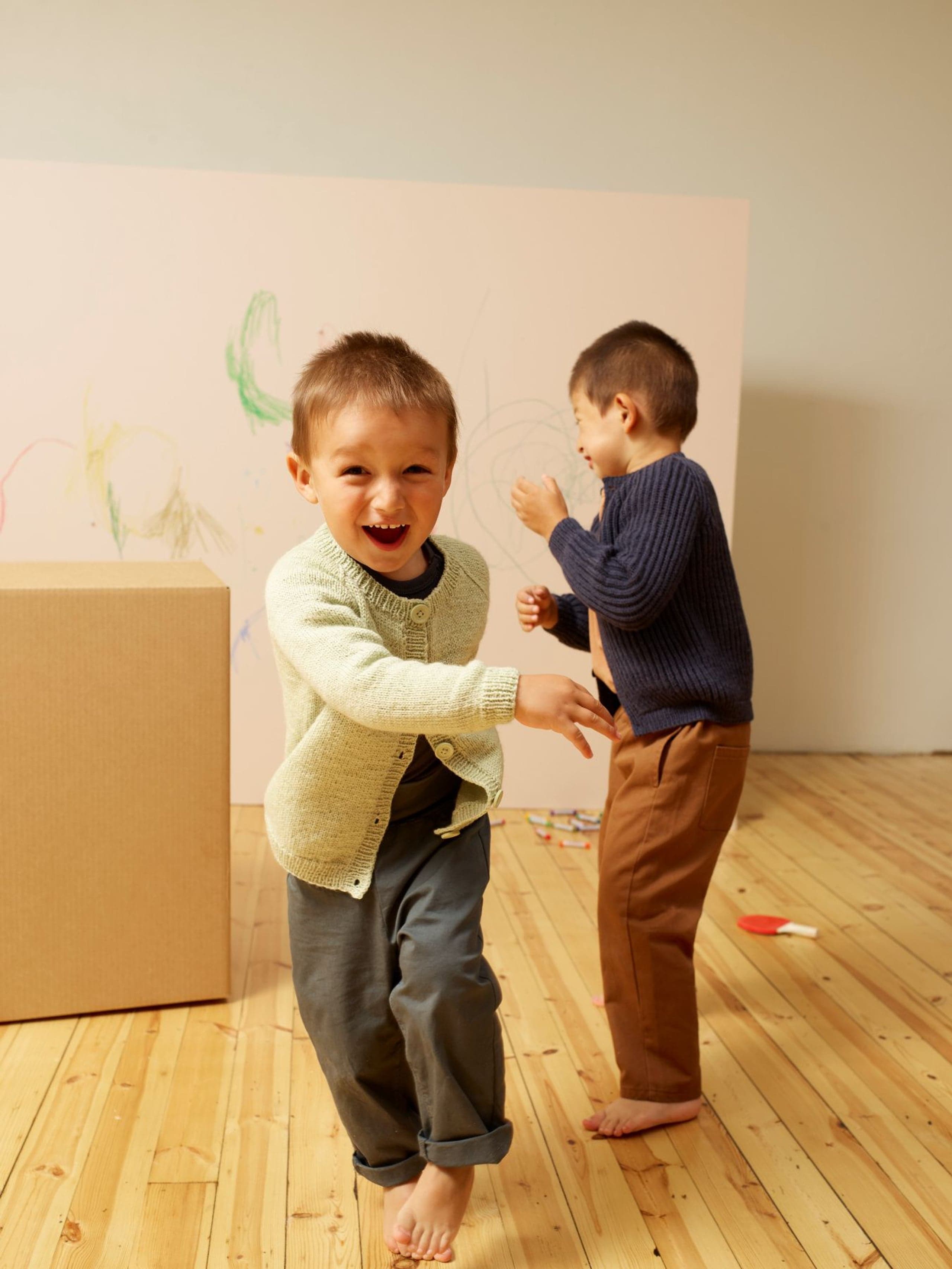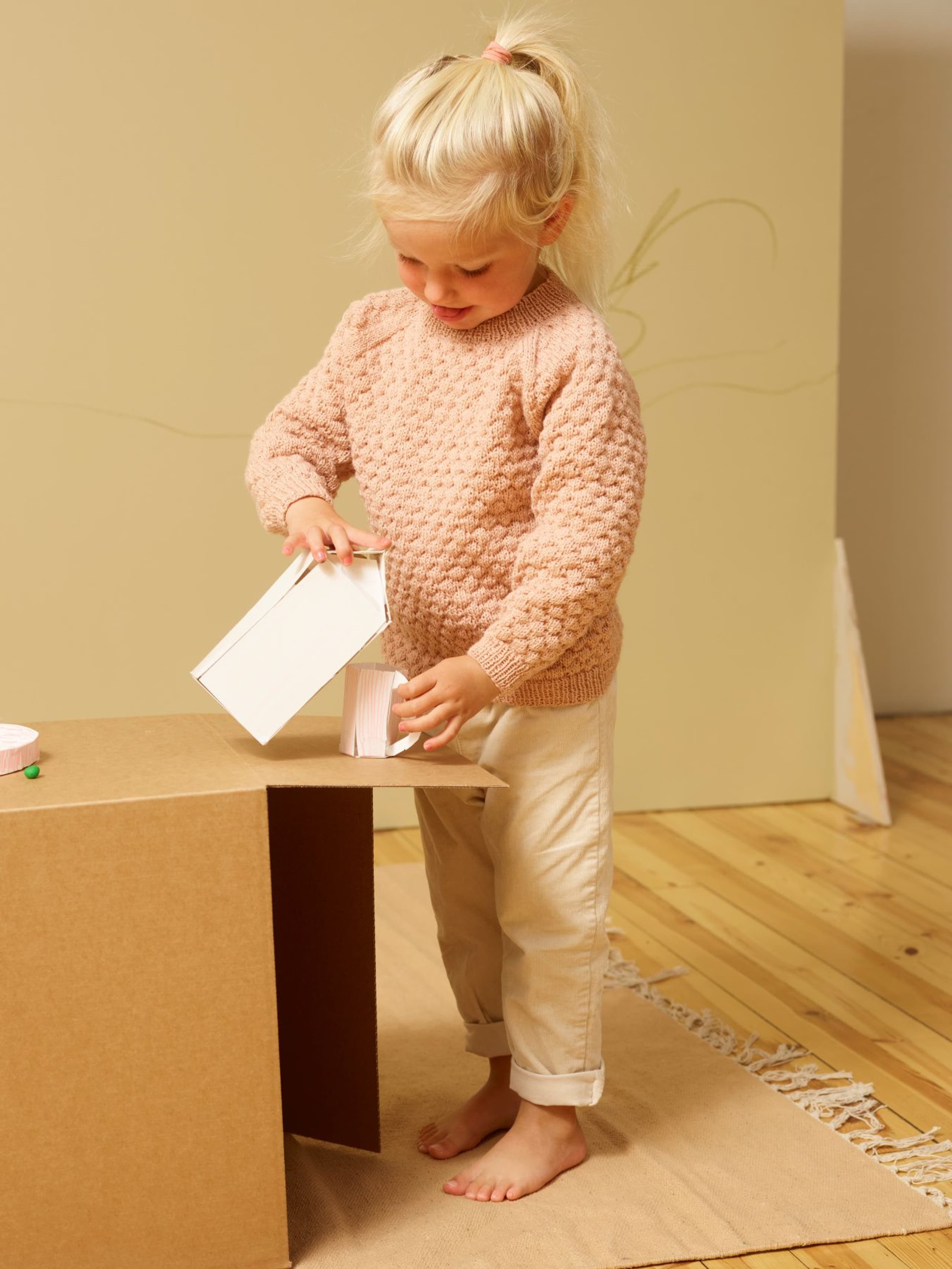Charlie høyhalser strikkes ovenfra og ned med stripemønster og raglanøkinger på bærestykket. I str 3 mnd, 6-9 mnd og 1 år kan man gjerne velge rund hals i stedet for høy hals.