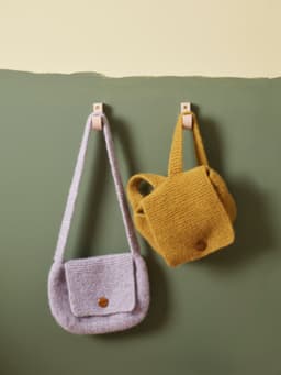 Vesken og ryggsekken er supre til smårollingen. De kan brukes til Bærit og Bærling, eller til andre små skatter. Begge strikkes på samme måte, men velg mellom 1 reim til veske, eller 2 reimer til ryggsekk. De er enkle å strikke for nybegynneren, for her har vi kun brukt rette masker på tykke pinner. Til slutt toves de lett og man kan sy på en fin knapp.