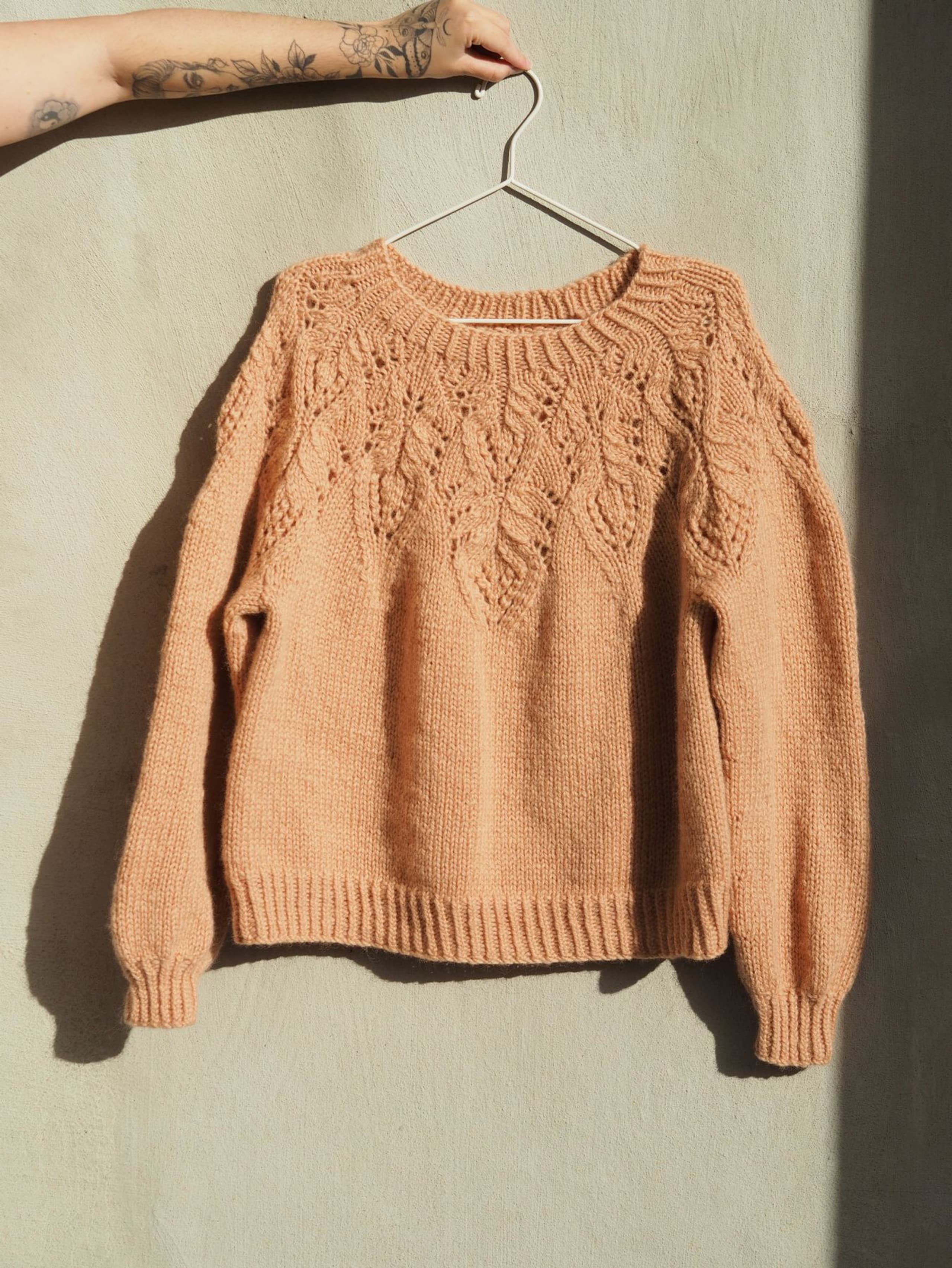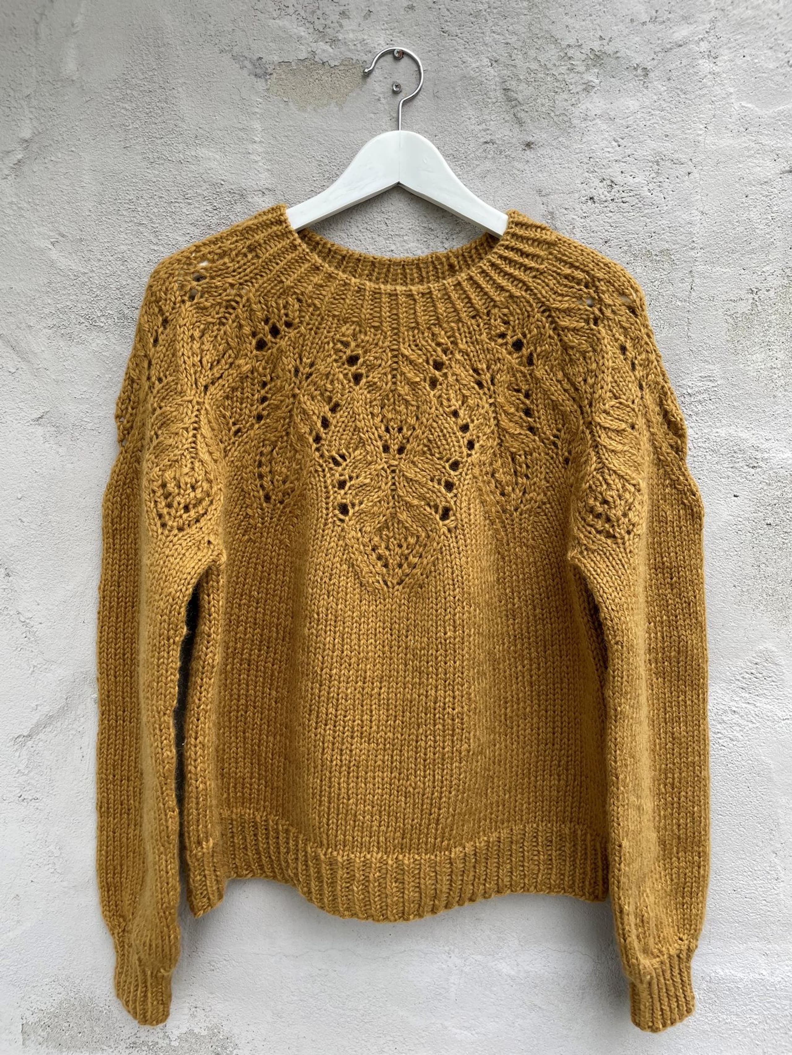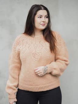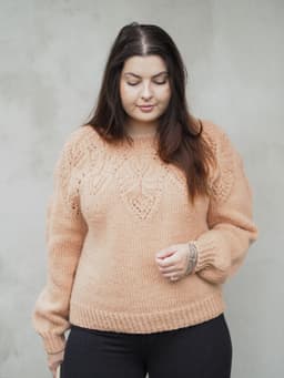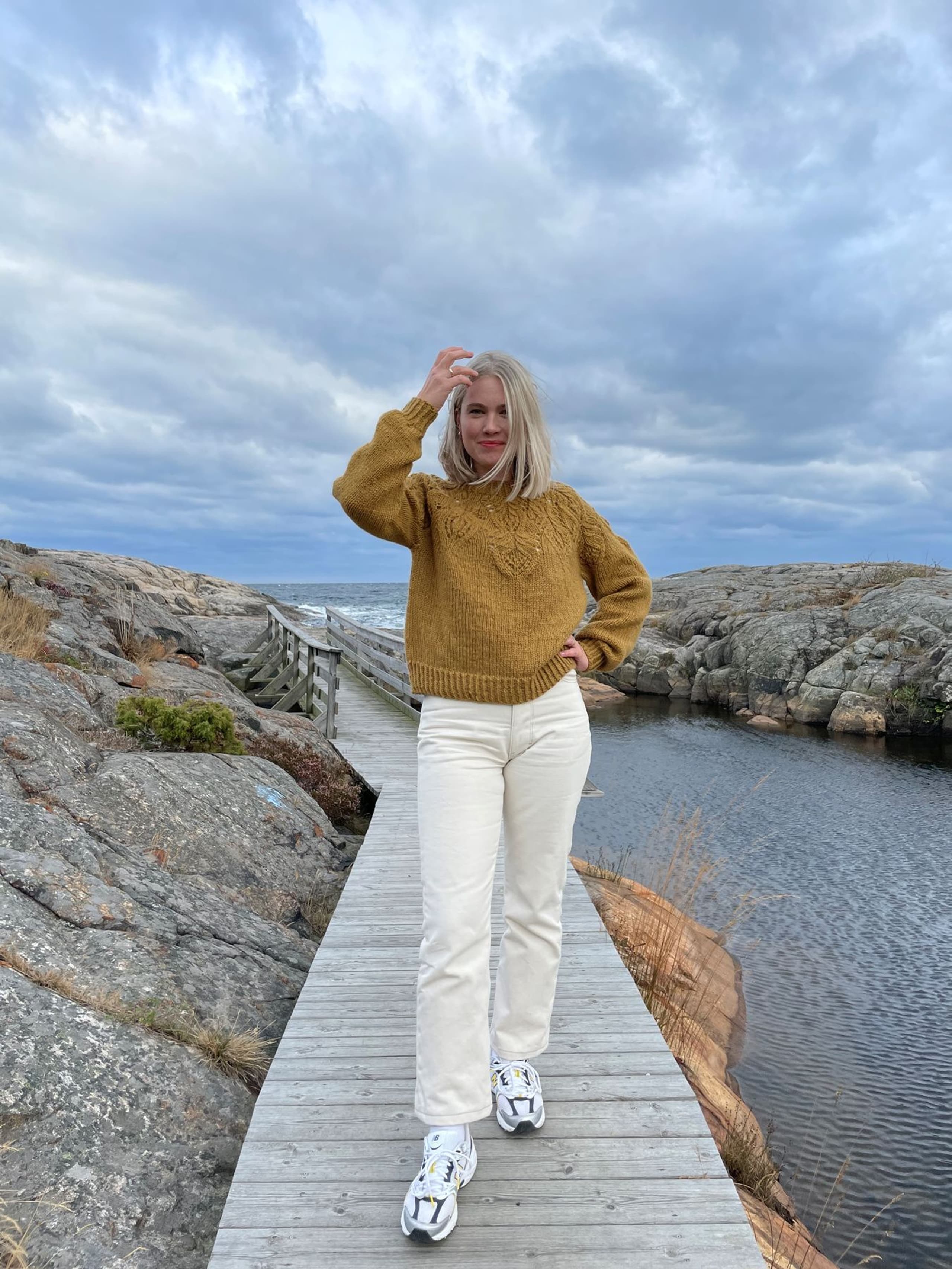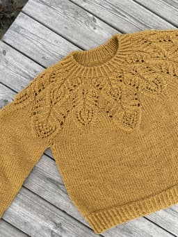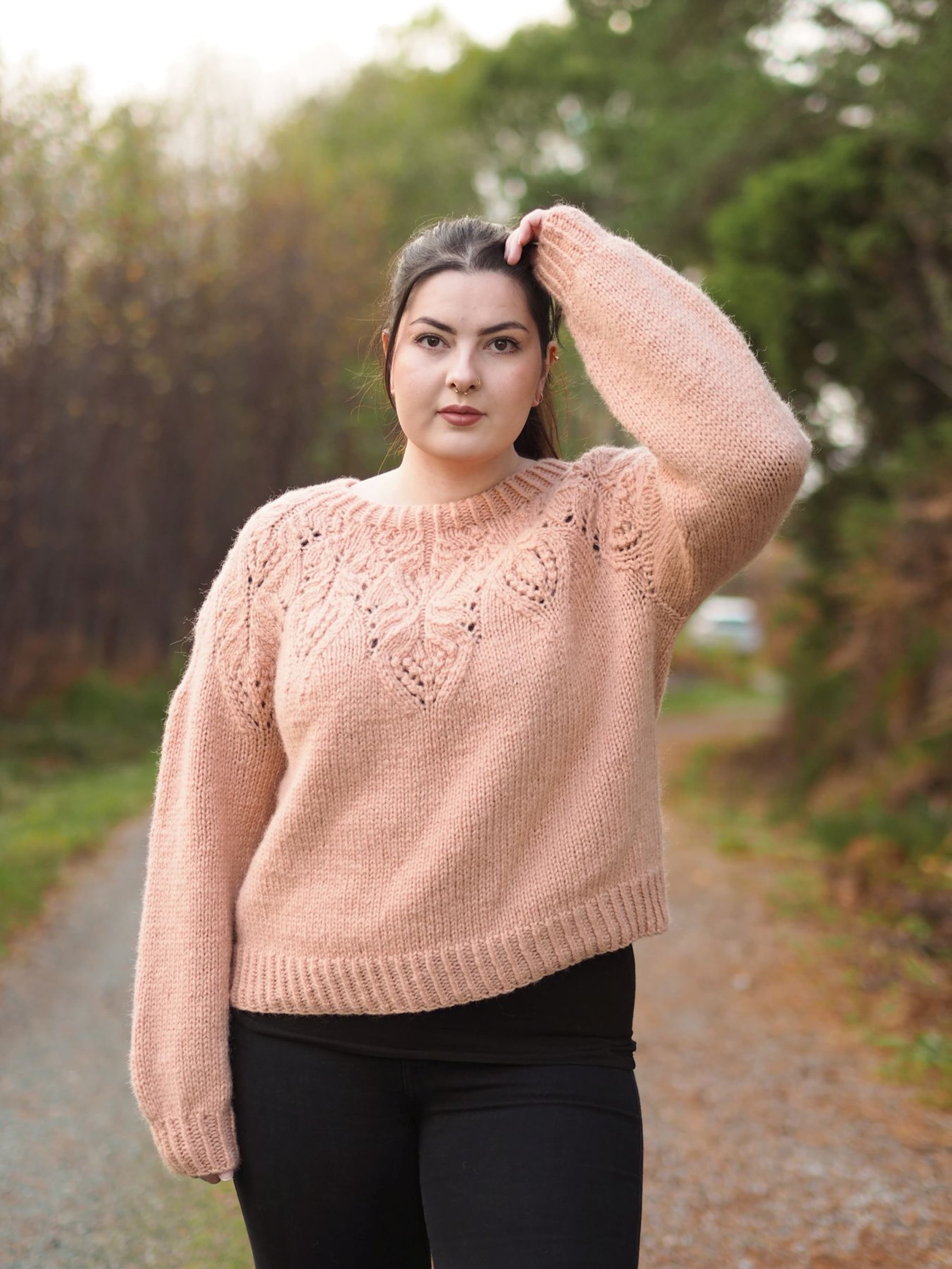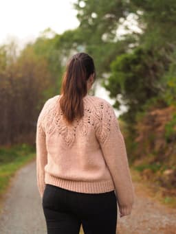 Villblomstgenseren strikkes nedenfra og opp med en nydelig hullmønstret rundfelling. Kantene er strikket med vridde rettmasker for et mer definert uttrykk. Utringningen formes med vendepinner. Genseren har en bevegelsesvidde på ca 6-14 cm. Det kan være litt utfordrende å holde tunga rett i munnen gjennom diagrammet. Sett gjerne inn en maskemarkør mellom hver rapport, så blir det lettere å følge med på hvor du er i mønsteret, og da går det nok som en dans på villblomster! **Kjøp magasinet uten garn her:** [Fremstrikk](https://www.raumagarn.no/produkt/tilbehor/fremstrikk)