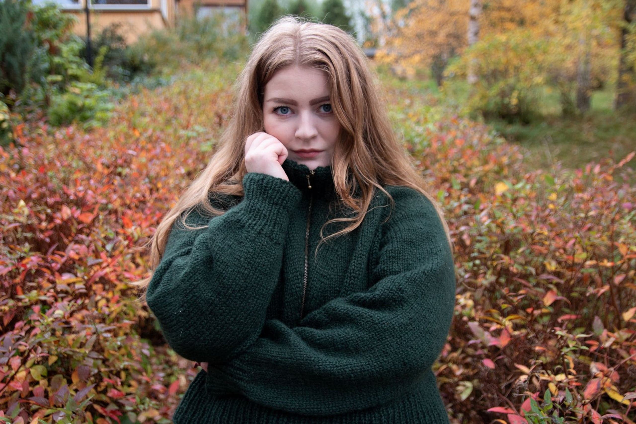 Frostluftgenseren er en deilig høstgenser med høy tjukk hals og glidelås. Genseren strikkes ovenfra og ned med vendepinner i utringningen og med raglanøkninger. Glidelåsen sys i for hånd, og ut over det er det ingen annen montering. Frostluftgenseren er kort og litt oversized med en bevegelsesvidde på rundt 16 cm. Siden den er strikket ovenfra, kan du prøve genseren på underveis og tilpasse den til egne mål og preferanser. **Kjøp magasinet uten garn her:** [Fremstrikk](https://www.raumagarn.no/produkt/tilbehor/fremstrikk)