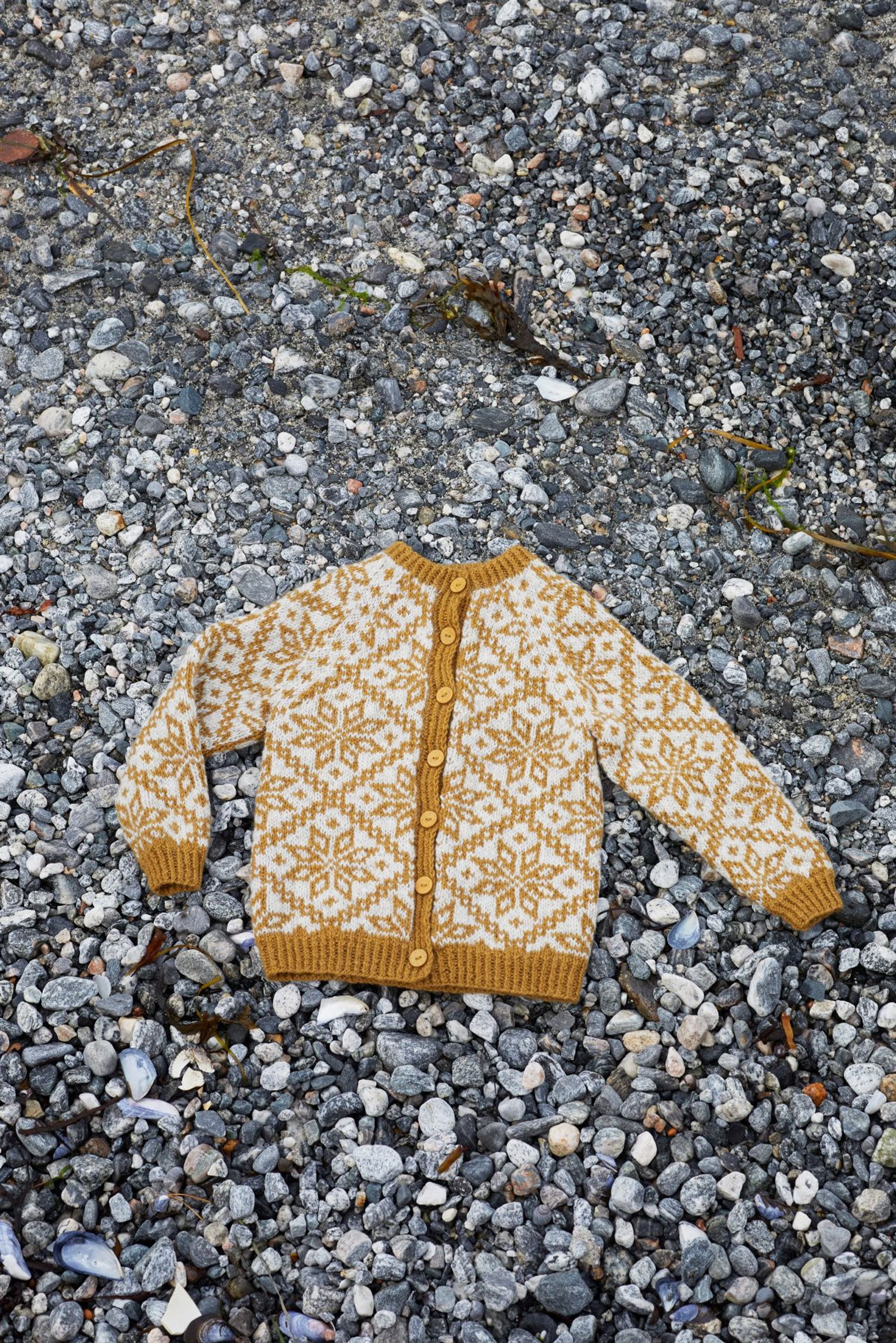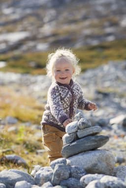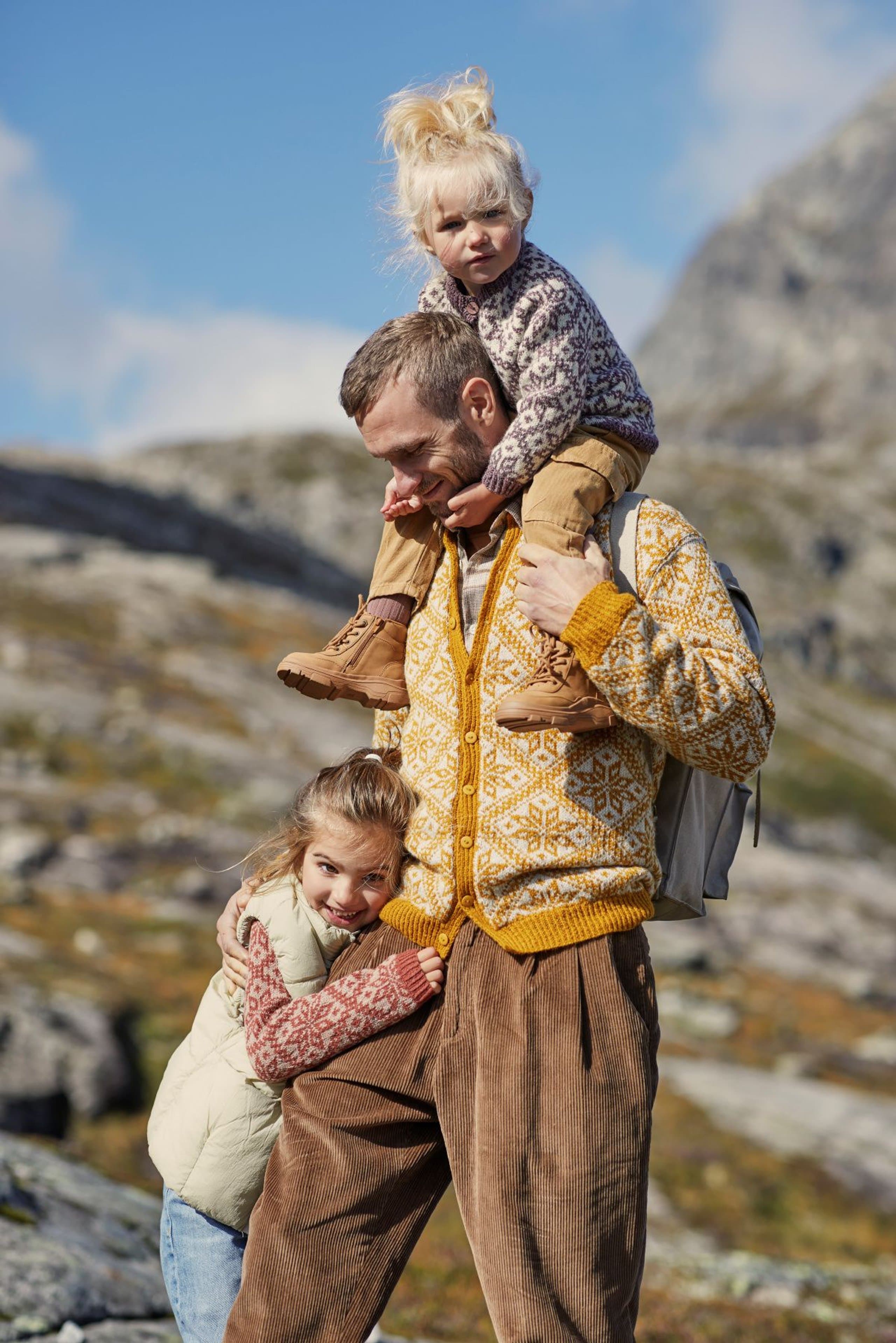 Fjelljakken er en helmønstret jakke med raglanfelling. Det nydelige Fjellmønsteret har vi hentet fra arkivet på Rauma Ullvarefabrikk. Fordi mønsterrapportene er så store, er det store hopp mellom noen av størrelsene og vi har gradert ved å variere strikkefastheten. Husk å sjekke strikkefastheten! Finner du ikke ønsket størrelse, ta en titt på 404-3 Lillefjelljakke i Lamull. Fjelljakken strikkes rundt nedenfra og opp. Den sys og klippes opp midt foran før stolper og halskant strikkes. Vrangbordene strikkes med vridde rette masker for et mer definert uttrykk.