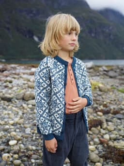 Lillefjelljakken er strikket i Lamull, vår tynneste, fineste og mykeste norske ullkvalitet. Jakken strikkes nedenfra med raglanfelling og en liten bord mellom fellingene. Det flotte Fjellmønsteret har vi hentet fra arkivet på Rauma Ullvarefabrikk. Fordi mønsterrapportene er så store, er det store hopp mellom noen av størrelsene og vi har gradert ved å variere strikkefastheten. Vær nøye med å sjekke strikkefastheten din! Finner du ikke din størrelse, ta en titt på 404-2 Fjelljakke i Finull. Lillefjelljakken strikkes nedenfra og opp. Den klippes opp midt foran før man strikker stolper og halskant.